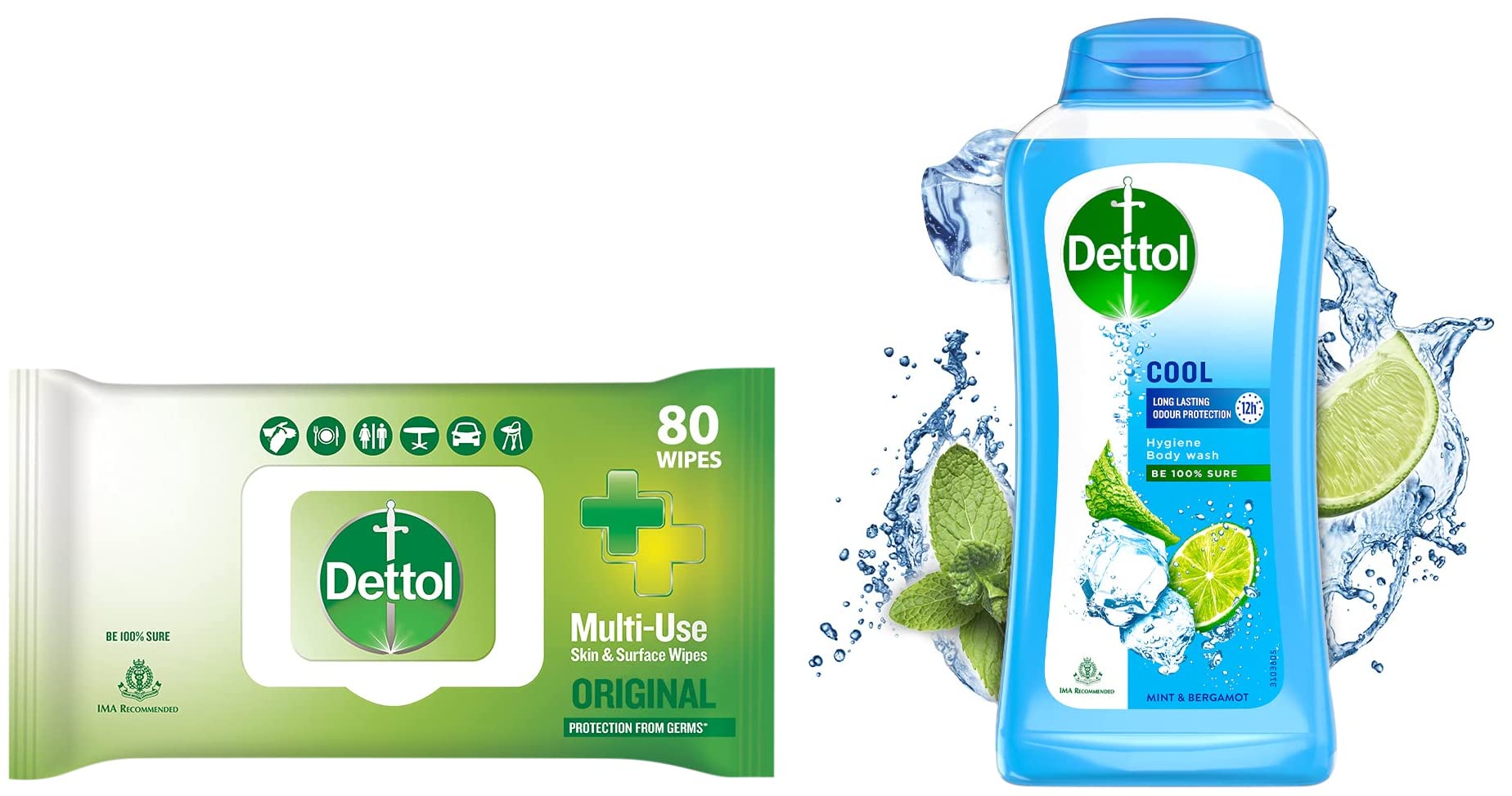 Dettol Disinfectant Sanitizer Wet Wipes for Skin & Surfaces Original â 80 Count| Moisture-Lock Lid | Safe on Skin | Ideal to Clean SurfacesDettol's Disinfecting Skin & Surface Wipes are Safe on Skin Ideal to Clean Multiple Surfaces Easy to carry with a resealable Moisture-lock lid. Dettol disinfecting wipes are practical for everyday use on furniture fridges taps sinks door knobs kitchen bathroom surfaces floor cleaning childrenâs surfaces and electronics that are germ hotspots. It can be used on most hard non-porous surfaces including Finished Wood Sealed Marble Stainless Steel Laminated Floors Glass and Plastic.Dettol Body Wash and Shower Gel for Women and Men Cool - 250ml | Soap-Free Bodywash | 12h Odour ProtectionDettol Hygiene Body wash Cool combines Dettolâs trusted germ protection with crispy menthol and leaves your skin feeling fresh.