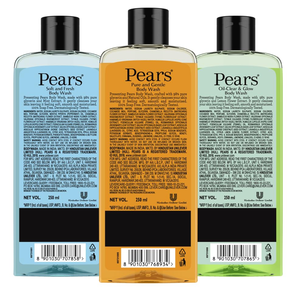 Try the New Pears Oil-Clear & Glow body wash|| crafted with 98% pure glycerin and Lemon flower extract. It is a pure and gentle cleanser for your body that leaves your skin feeling soft|| smooth and moisturised. Pears Body wash is mild and gentle and cleanses your skin thoroughly. It is 100% soap free & dermatologically tested. It helps moisturise your skin so that it does not dry. With natural oils|| it is a gentle cleanser for your body. The Oil-Clear & Glow Body Wash from Pears is available right here. Buy it Now! Benefits of the Pears Oil-Clear & Glow Body wash: 1) It is 100% Soap Free 2) It is Dermatologically Tested 3) It is contains 98% pure glycerin How to use the Pears Oil-Clear & Glow Body Wash: 1) Squeeze a small amount of Pears Oil-Clear & Glow Body wash on a wet loofah. 2) Work into a rich creamy lather. 3) Apply gently over wet skin and then rinse off|| for skin that feels soft|| smooth and moisturised. Established in 1807|| Pears is an iconic brand of Unilever. It has a heritage of over 200 years in making pure and gentle products. Pears is a registered Trade Mark.*OLD Does your skin crave for a fresh glowing skin in summer months? Presenting Pears Soft & Fresh Body Wash crafted with 98% pure glycerine|| known to help hold moisture & with refreshing mint extract that cools and revitalises your senses. It is a perfect solution to keep your skin feeling refreshed and moisturised so that you can get a Fresh Glow|| even in the harsh months of summer. Its mild & gentle formula maintains your skinâs moisture and hydration|| leaving your skin feeling refreshed and glowing. Pears Soft & Fresh Body Wash also effectively removes 99.9% germs|| as per lab test on select virus and bacteria|| without being harsh on your skin. It is also pH balanced and dermatologically tested. Pears Soft & Fresh Body Wash is gentle enough to be used as a face wash and effective as a handwash too. Pears Soft & Fresh Body Wash is easy to use: 1) Squeeze a small amount of Pears Body Wash on a wet loofah. 2) Work into rich bubbly lather. 3) Apply thoroughly and gently over wet skin and then rinse off and Pat dry. Add the Pears Range to your beauty regime for a fresh|| glowing skin!*OLD Try the New Pears Pure & Gentle body wash|| crafted with 98% pure glycerin and natural oils. It is a pure and gentle cleanser for your body that leaves your skin feeling soft|| smooth and moisturised. Pears Body wash is mild and gentle and cleanses your skin thoroughly. It is 100% soap free & dermatologically tested. It helps moisturise your skin so that it does not dry. With natural oils|| it is a gentle cleanser for your body. The Pure and Gentle Body Wash from Pears is available right here. Buy it Now! Benefits of the Pears Pure & Gentle Body wash: 1) It is 100% Soap Free 2) It is Dermatologically Tested 3) It is contains 98% pure glycerin How to use the Pears Pure and Gentle Body Wash: 1) Squeeze a small amount of Pears Pure and Gentle Body wash on a wet loofah. 2) Work into a rich creamy lather. 3) Apply gently over wet skin and then rinse off|| for skin that feels soft|| smooth and moisturised. Established in 1807|| Pears is an iconic brand of Unilever. It has a heritage of over 200 years in making pure and gentle products. Pears is a registered Trade Mark.*OLD
