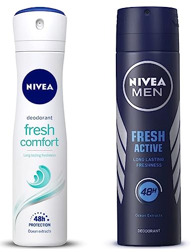 Nivea Fresh Active Original Deodorant for Men 150mlNivea men fresh active original a deodorant for men that keeps you feeling fresh all day long.a long day needs long-lasting freshness. Hereâs a menâs deo that helps keep the freshness the suave manâs poise and confidence intact all day long.designed with a special formula enriched with ocean extracts this deodorant not only appeals to the senses but also keeps body odour in check for all your daily rigorous tasks.enjoy a deodorant for men that has a fresh masculine fragrance as well as the optimal combination of reliable deodorant protection and Nivea men care complex. Because this body spray for men knows that great things start with you.Nivea men fresh active original deodorant for men is dermatologically proven to be skin tolerant. It cares for your underarm skin while giving you protection against body odour all day long.meet the perfect deo for men which gives long lasting freshness and body odour protection so that you can enjoy your long day with supreme confidence and zeal.NIVEA Women Deodorant Fresh Comfort Long Lasting Freshness & 48h Protection 150 mlNivea fresh comfort deodorant for women contains anti-microbial agents that help keep bacteria away thus giving long lasting odour control. It contains ocean extracts and a clean scent that keep you fresh all day long.