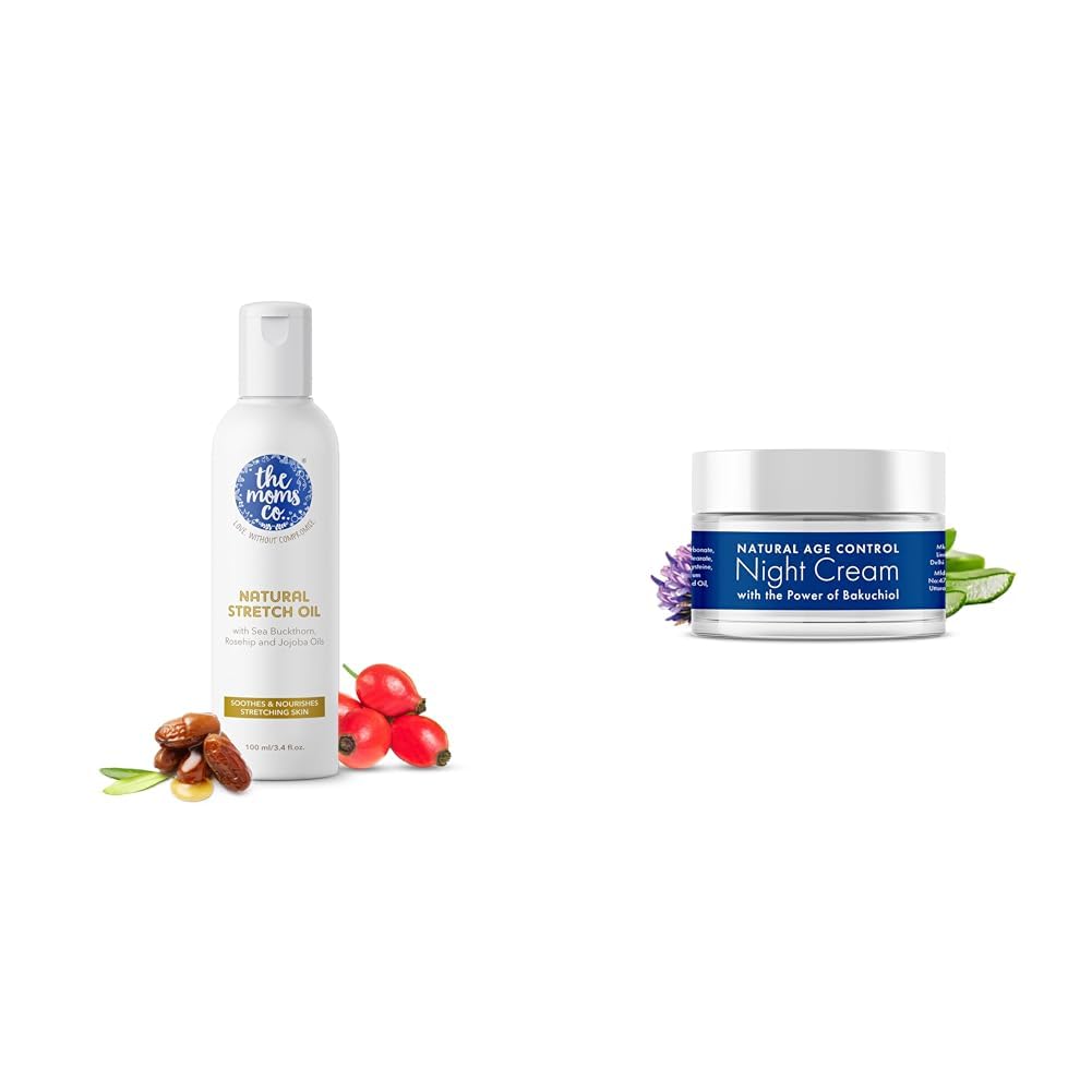 The Moms Co. Natural Stretch Oil to Reduces stretch marks for women 100 ml. Natural Age Control Night Cream for Women| With Bakuchiol (Natural Retinol) & Niacinamide - 10 gm