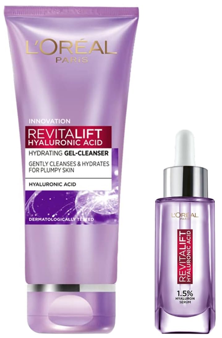 L'Oreal Paris Revitalift Serum Hydrating and Plumping With 1.5% Hyaluronic Acid 15mlTHE #1 Face Serum In the World* does what it says! The L'oreal Paris revitalift hyaluronic acid serum with 1.5% Hyaluron has micro hyaluronic acid for deeper penetration. It intense hydrates and reduces fine lines by -60%*. With this lightweight and non-sticky serum get visibly youthful skin! Dermatologically tested it is suitable for all skin types and can be used daily. This face serum for women is paraben- free fragrance-free & alcohol-free. And suitable for all skin types including sensitive skin. For best results use the hyaluronic acid cleanser follow by this serum followed by the hyaluronic acid plumping cream morning and night. Disclaimers: n°1 sell - out sales volume and value based on nielseniq rms data for the female face care anti-aging serum category total retail market 23 countries 75% of world gni jan 2021 to dec 21 (copyright © 2021 nielseniq)” **basis instrumental testL'Oreal Paris Revitalift Gel Cleanser Gentle Cleansing and Hydration With Hyaluronic Acid 50mlEnriched with powerful Hyaluronic Acid L'Oreal Paris Hyaluronic Acid Facewash gently cleanses & hydrates for plump skin. With ultra-fine foam that can penetrate pores this gentle cleanser thoroughly clears impurities and make-up. This gentle gel technology cleanses without drying out skin. Skin looks fresh and hydrated and over time; skin feels smooth plumped and youthful. Dermatologically tested and suitable for all skin types.