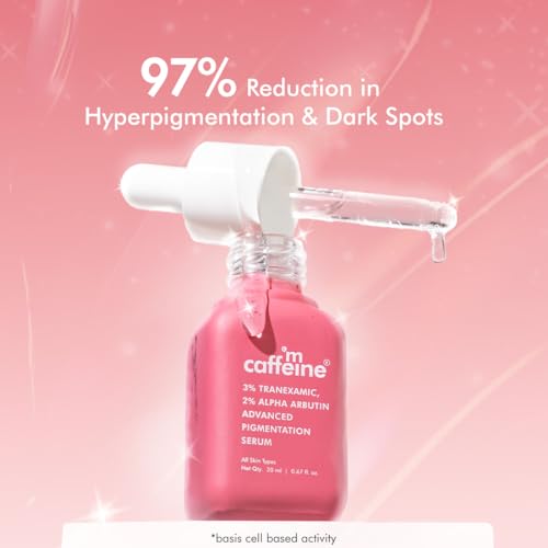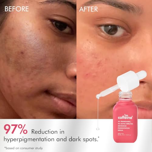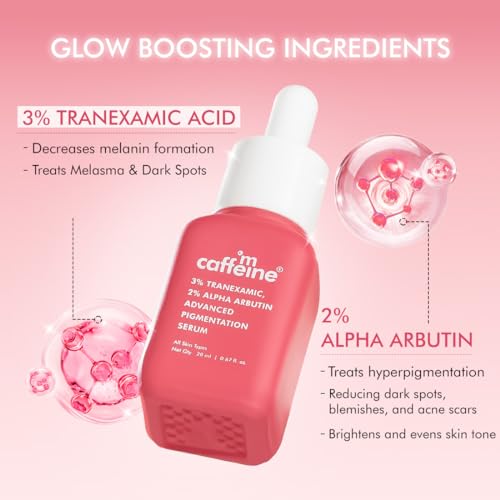 CLEAR GLOW 3% Tranexamic 2% Alpha Arbutin Advanced Pigmentation Serum Reduces Scars & Sun Spots | Evens Skin Tone | Treats Pigmentation & Melasma 97% Reduction in hyperpigmentation and dark spots. Get 5x brightening boost with Clear glow advanced serum it is power packed with potent ingredients - which fades stubborn dark spots and Melasma revealing a brighter skin underneath. 2% Alpha Arbutin a natural skin brightener that helps reduce melanin production and reduce dark spots due to sun damage and acne scars leaving skin more even toned. C-Complex a unique blend of Caffeine and Ceramides not only protects against sun damage but also hydrates and promotes a healthy smooth skin. Add it to your skincare routine today and unlock a brighter and clear skin glow. 83% agreed it reduces the stubborn hyperpigmentation like brown patches on skin*(melasma)* 83% agreed it fades appearance of dark spots and sun spots* 89% respondents agreed it improves the dull complexion and provides radiance.* 82% agreed there is a decrease in post acne marks.* *based on consumer study 97% Reduction in hyperpigmentation and dark spots. Tackles advanced issues with Potent brightening concoction. 3% Tranexamic + 2% Kojic + C-Complex 3% Tranexamic Treats Melasma & Pigmentation Fades stubborn dark spots including Melasma leaving behind brighter even toned skin. 2% Alpha Arbutin Reduces Sun Spots & Scars Doubles the brightening power to tackle problems like sun spots and scars. Good For You Good For The Planet: CLEAR GLOW 3% Tranexamic 2% Alpha Arbutin Advanced Pigmentation Serum is perfect for both women and men. It is PETA Certified and free from Paraben SLS and all other toxic ingredients. This serum is also FDA-approved dermatologically tested and has Zero Plastic Footprint.