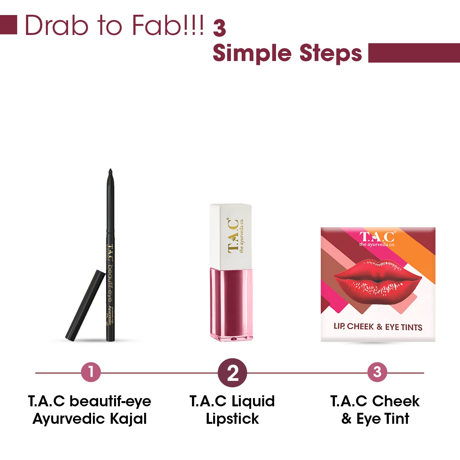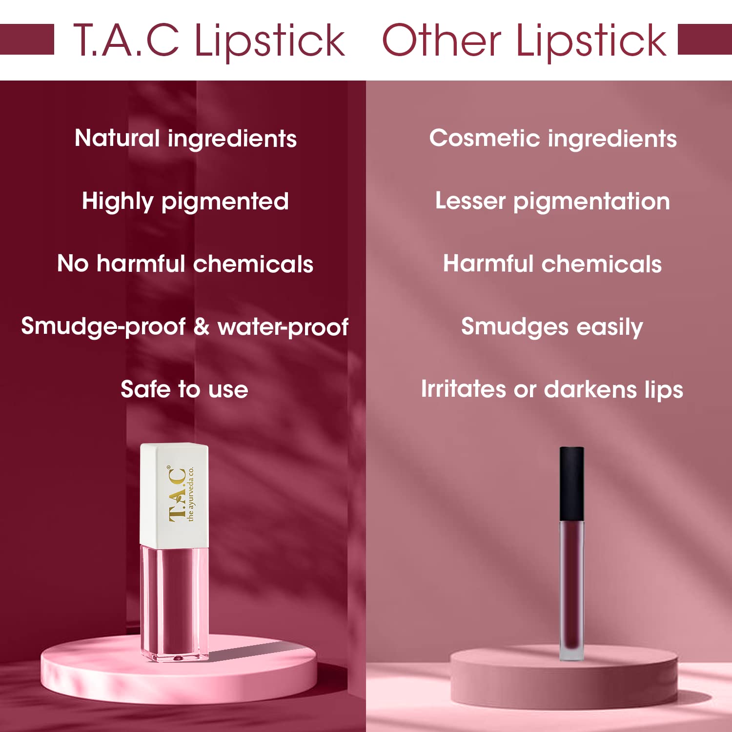 Get subtle bright and bold shades for your pouty lips with TAC Liquid Lipstick. They are specially designed with lip-nourishing ingredients that lock in lips moisture and give a matte finish. Enjoy pouty lips with one stroke of this liquid lipstick. The ultra-pigmented liquid lipstick doesnât smudge or leave any mark hence has a long-lasting stay on the lips. Made with castor oil and vitamin E it does not dry out your lips making them chapped. A comfortable matte lipstick for your lips is perfect for an everyday look.