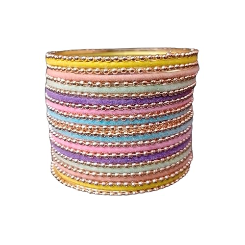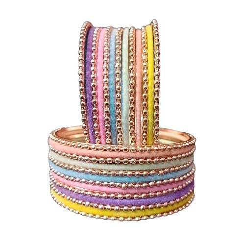 Velvet Metal Bangles for Women and Girls perfect for every occasion! This stunning Bangles set features 12 multicolored Velvet Bangles in a combination of vibrant hues beautifully complemented by 14 bangles with a chic rose gold finish. The light and comfortable design make these bangles a must-have accessory for any fashion-forward Female be it Women or Girl. Unleash your creativity and enhance your ensemble with this Pack of 26 effortlessly blending the luxurious feel of velvet with the timeless elegance of rose gold. Upgrade your jewelry collection with these versatile and on-trend Velvet Metal Banglesâyour go-to choice for a touch of sophistication and flair!