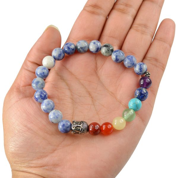 Reiki Crystal Products Natural Sodalite Bracelet with 7 Chakra Buddha Head 8mm Round Bead Bracelet f
