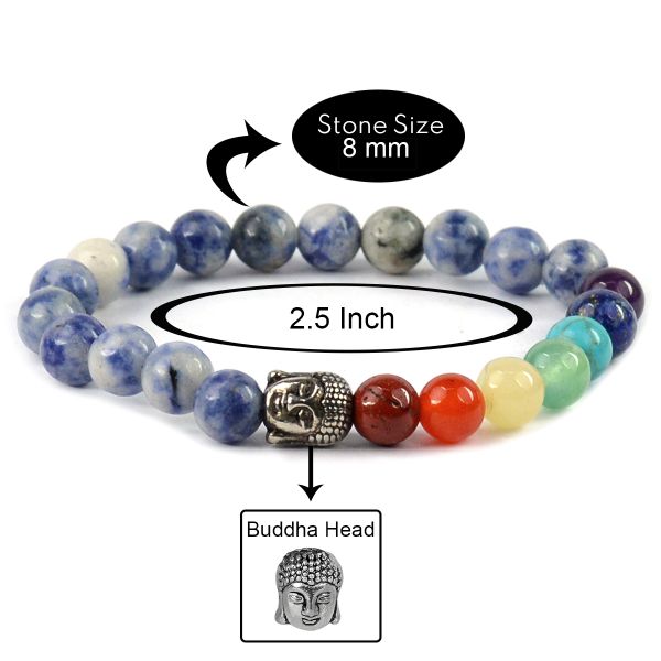 Reiki Crystal Products Natural Sodalite Bracelet with 7 Chakra Buddha Head 8mm Round Bead Bracelet for Reiki Healing and Crystal Healing Stones