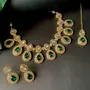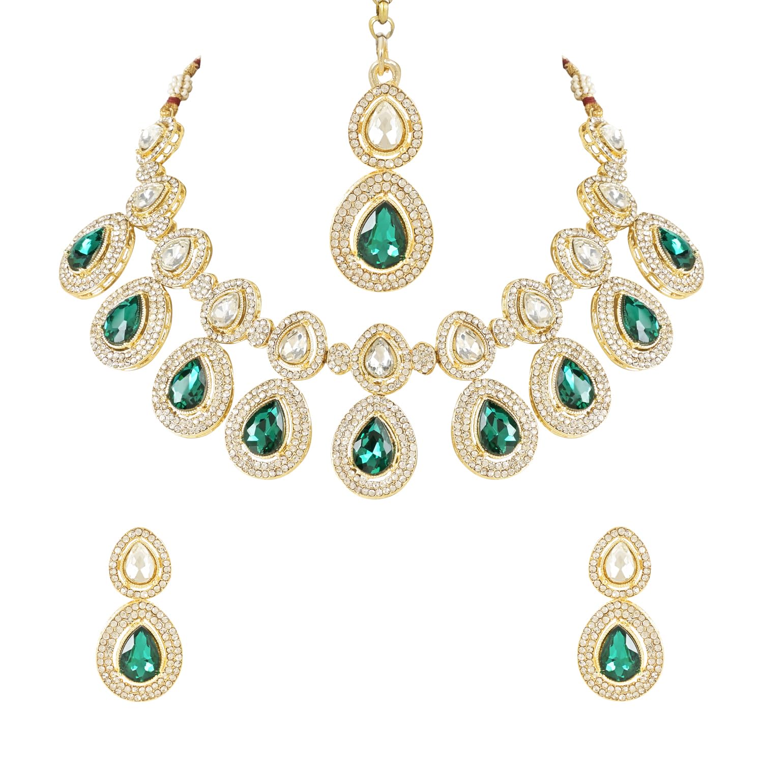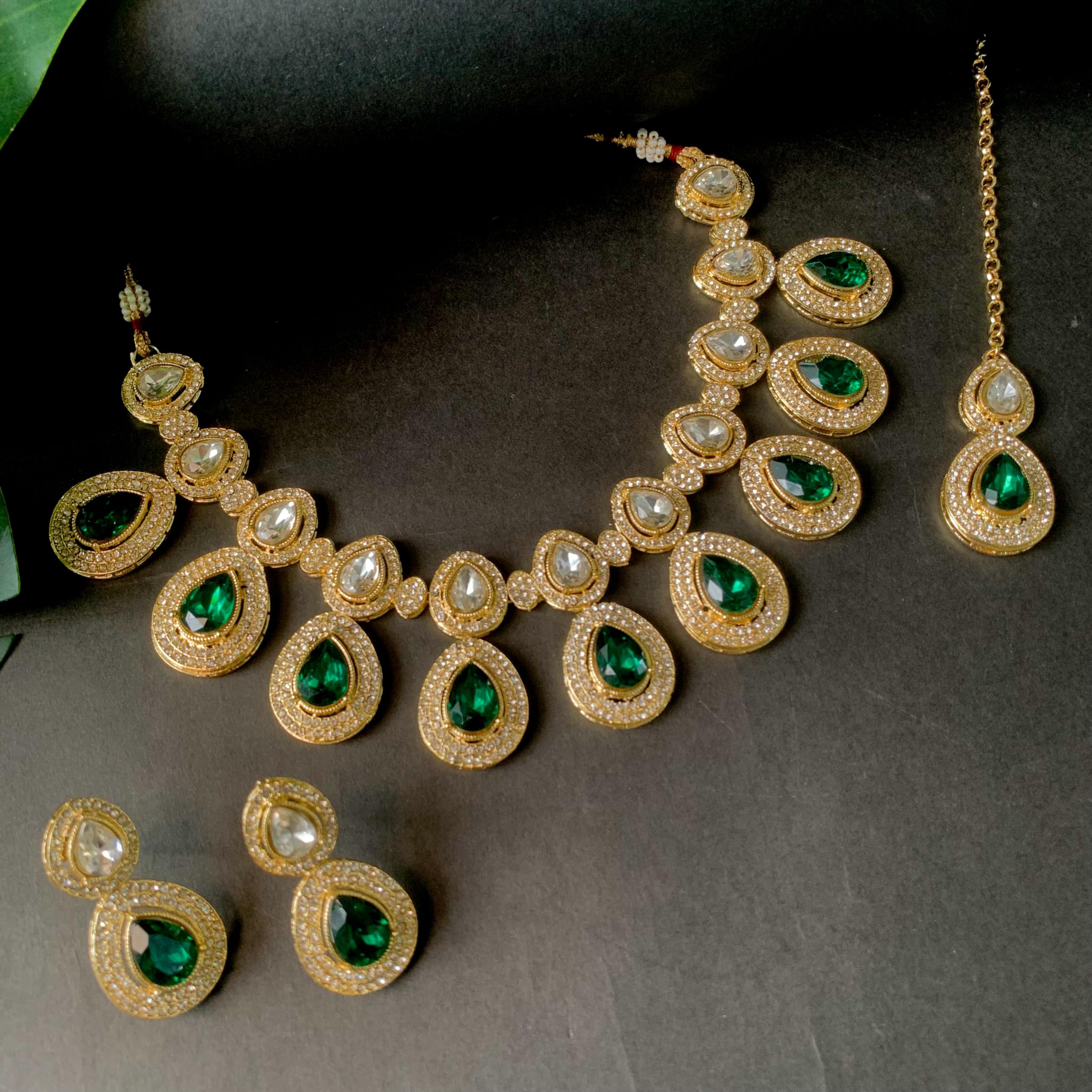 The gold-plated choker necklace set consists of a necklace a pair of earrings and a maang tikka. The necklace features kundan studded with pearl beaded in it giving it an elegant and traditional look. The stones and pearls are set in a beautiful pattern adding a touch of sophistication and grace to the necklace. The necklace is secured with drawstring closures which make it easy to adjust the size to fit comfortably around the neck. This is an important feature as it ensures that the necklace will be comfortable to wear for extended periods of time. The necklace is secured with drawstring closures which make it easy to adjust the size to fit comfortably around the neck. This is an important feature as it ensures that the necklace will be comfortable to wear for extended periods of time. The earrings and maang tikka are also adorned with stones and pearls which match the pattern of the necklace. The earrings have a beautiful design which makes them easy and comfortable to wear. The maang tikka is a traditional Indian hair accessory that can be worn with the necklace and earrings to complete the look.