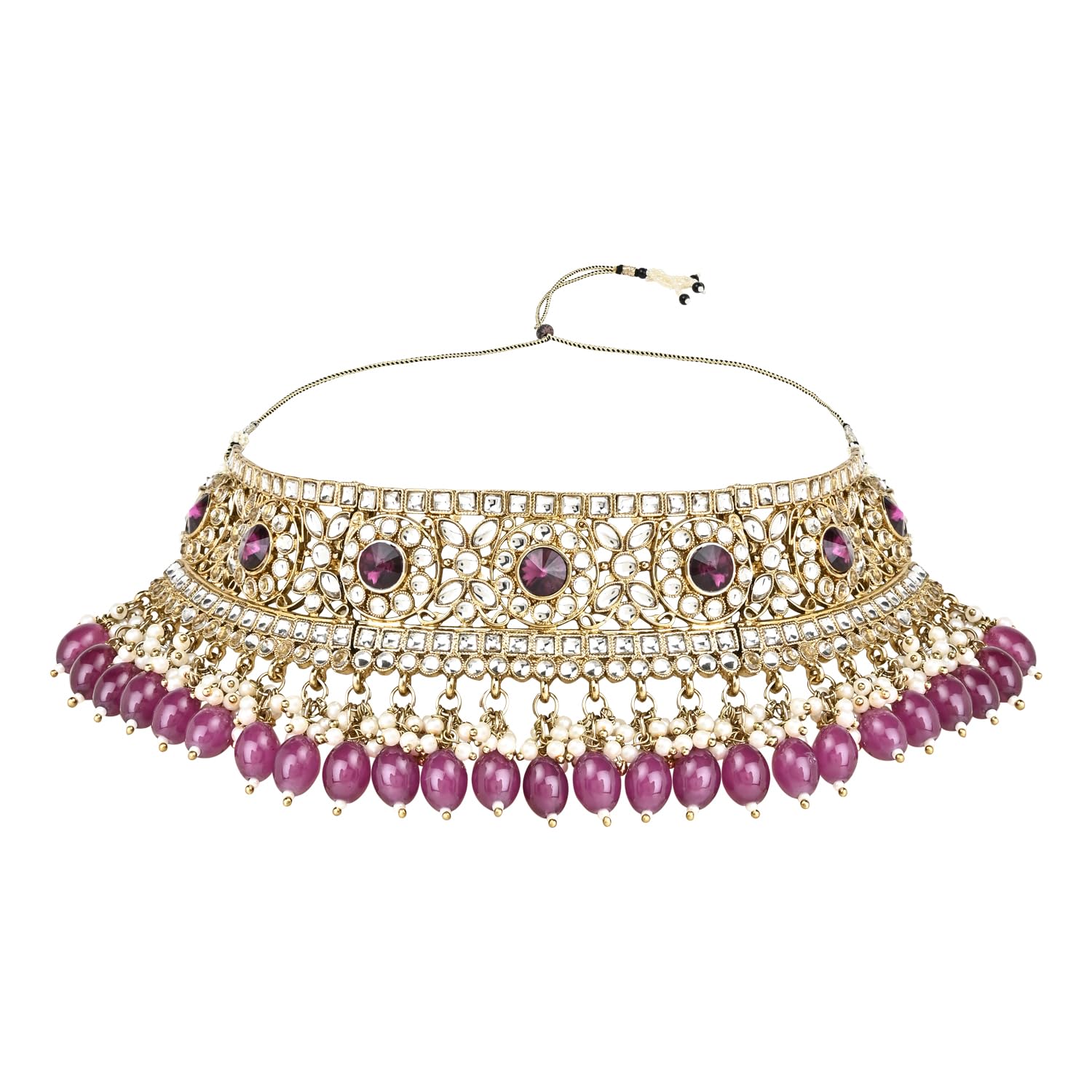 Elevate your traditional look with the included maang tikka. The delicate design combined with the radiant Kundan and pearl elements adds a touch of royalty to your hairstyle making you the center of attention at any event. The choker necklace features a statement design that gracefully encircles the neck creating a striking focal point. The gold-plated finish adds a touch of luxury making it the perfect accessory for weddings festivals or any special celebration.