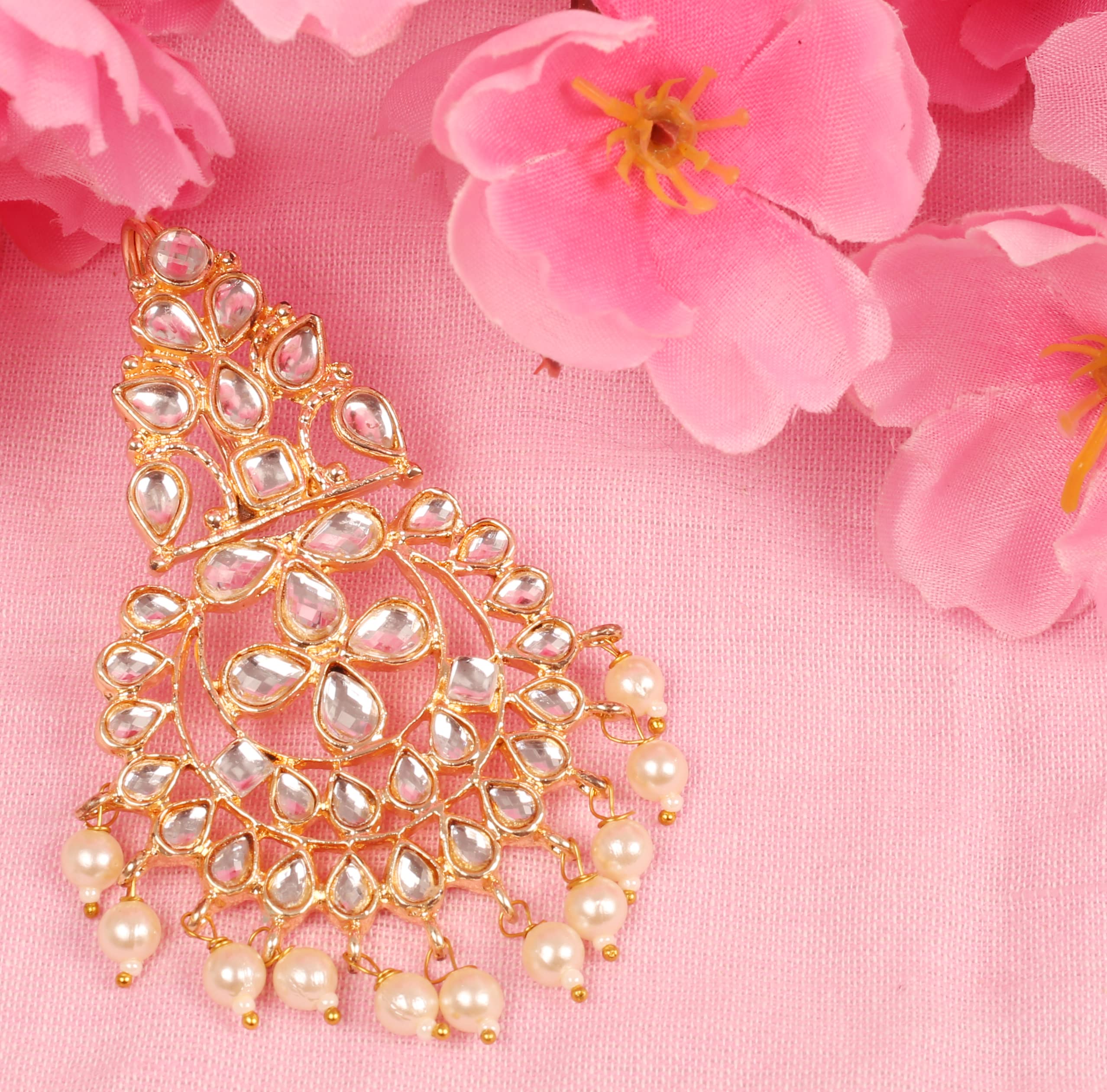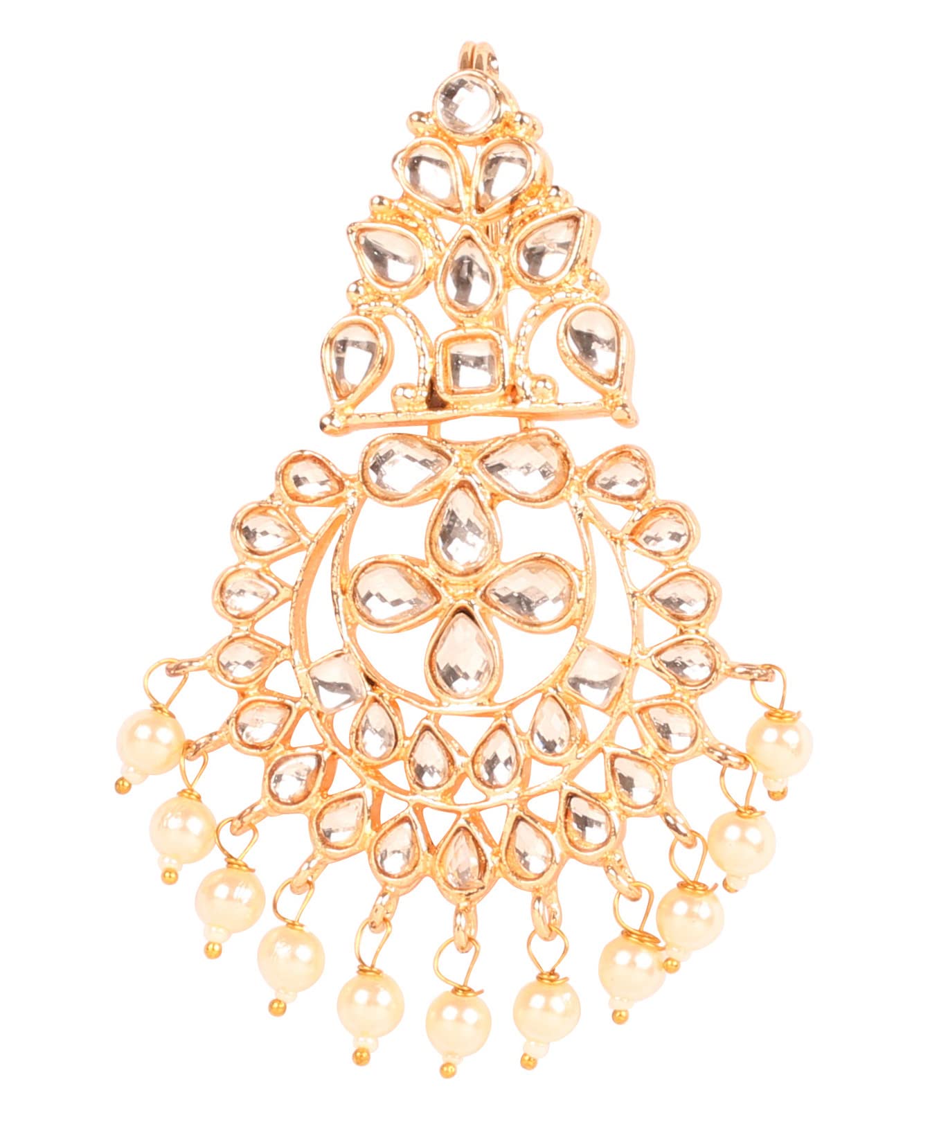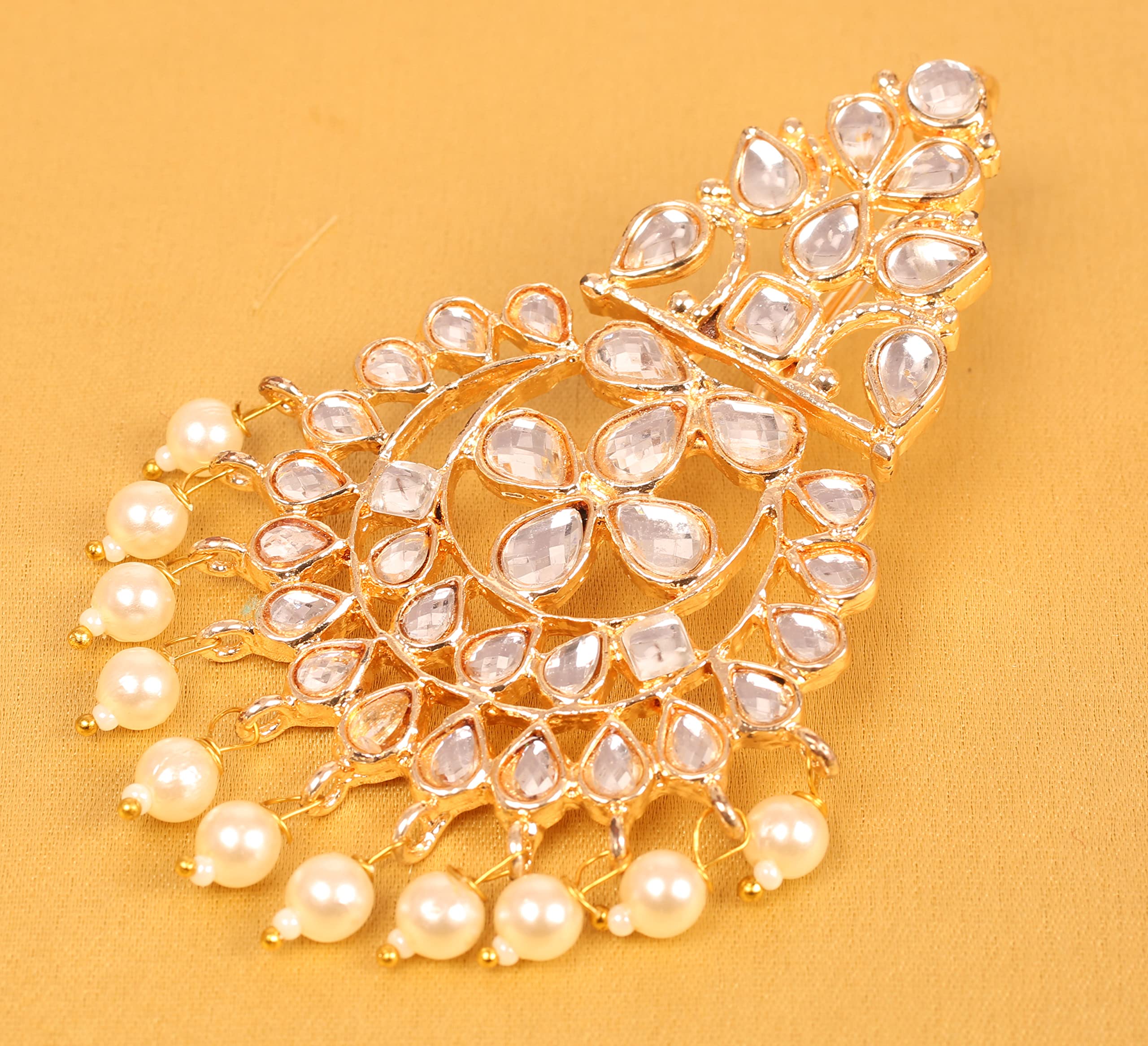 HomeFashionHair AccessoriesNew! Touchstone Indian Bollywood Handcrafted Floral Crescent Inspired Mughal Kundan Polki Look Faux Pearls Designer Jewelry Jhoomer Hand Head Wedding Accessory in Gold Tone for Women.