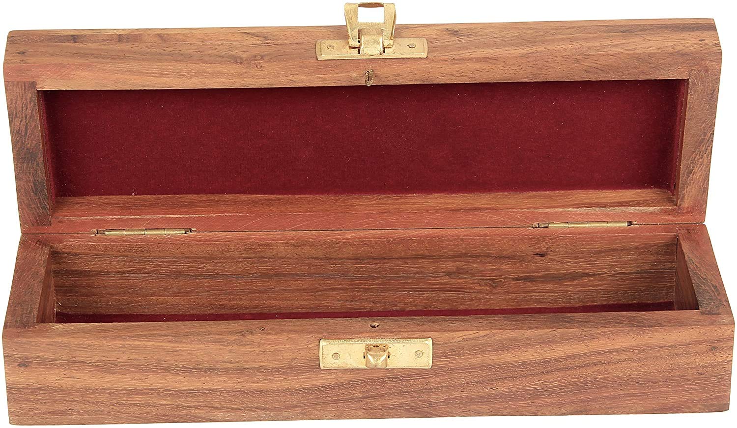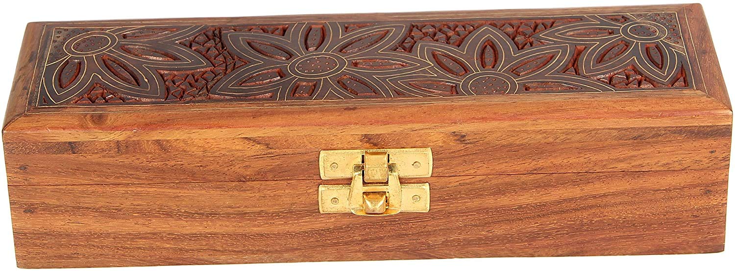 This hinged wooden jewelry box with beautiful decorative hand carved drawing and inlay work has been handmade by artisans of pilkhua in utter pradesh state of north india Jewelry boxes are thoughtful gifts for women and girls as they can be treasured for years to come and displayed in a special place where they can be seen daily. If you're looking for a cheap jewelry box to give as an inexpensive gift to someone special but still want to make sure that lovely lady or girl gets a gift of the absolute finest quality our Handmade Indian Wood Jewelry Box is the perfect choice. Our jewelry box for girls and women is a design you won't find in stores or anywhere else on Amazon. Each of jewelry box is handcrafted out of sheesham wood an Indian renowned for its durability and handsome natural grain. The Handmade Indian Wood Jewelry Box is made with traditional techniques that have been passed down through generations of artisans from Saharanpur India. The skills of these woodworkers are world renowned and make this jewelry box truly beautiful and capable of standing the test of time. On the lid of the Handmade Indian Wood Jewelry Box is a beautiful motif produced out of inlaid brass. The technique is called tarkashi and involves carefully hammering pieces of genuine brass into engravings in the wood. Small holes are punched into the flowers to add a pleasing texture to the design. The careful attention to detail makes the jewelry box more than just a place for storing earrings bracelets rings and necklaces. The piece doubles as a decorative item that can be displayed anywhere in the home. The Handmade Indian Wood Jewelry Box measures 8 inches by 2.5 inches by 2 inches outside. Inside the box's dimensions are 7.25 inches by 1.75 inches by 1 inch. The box features a brass clasp and brass hinges to complement the color of the inlay. Choose a cheap jewelry box that is low in price but not cheaply made.