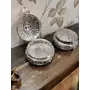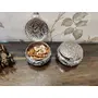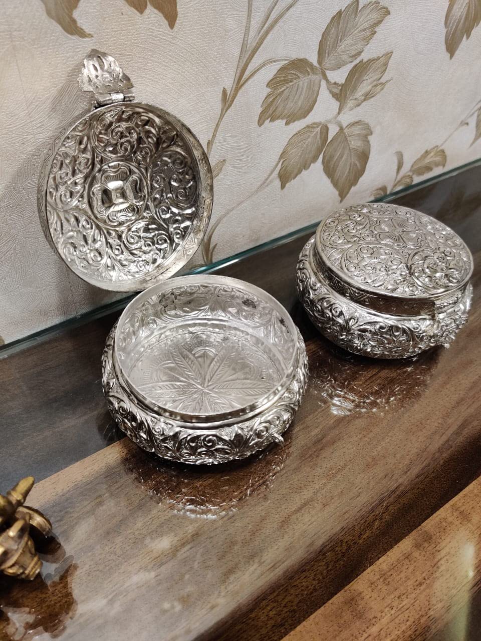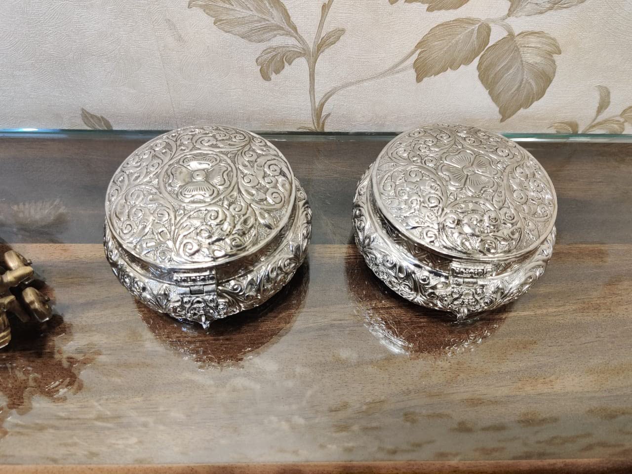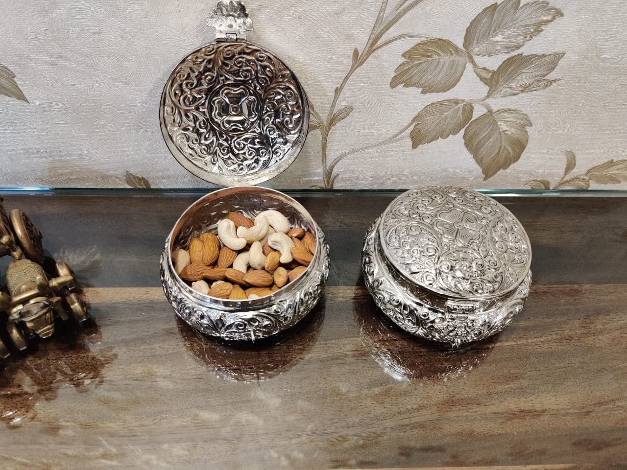 This elegant JEWELLERY CUM DRY FRUIT box made of wooden base and brass cover enhanced with german silver embossing work is a result of meticulous craftsmanship.This unique blend of material craft and art work has lent an appeal that will resonate brilliantly with the festive mood of your near and dear ones on special occasions like diwali. Gift precious articles in our exclusive German silver hand engraved boxes.so your memories are captured in something very exclusive!!