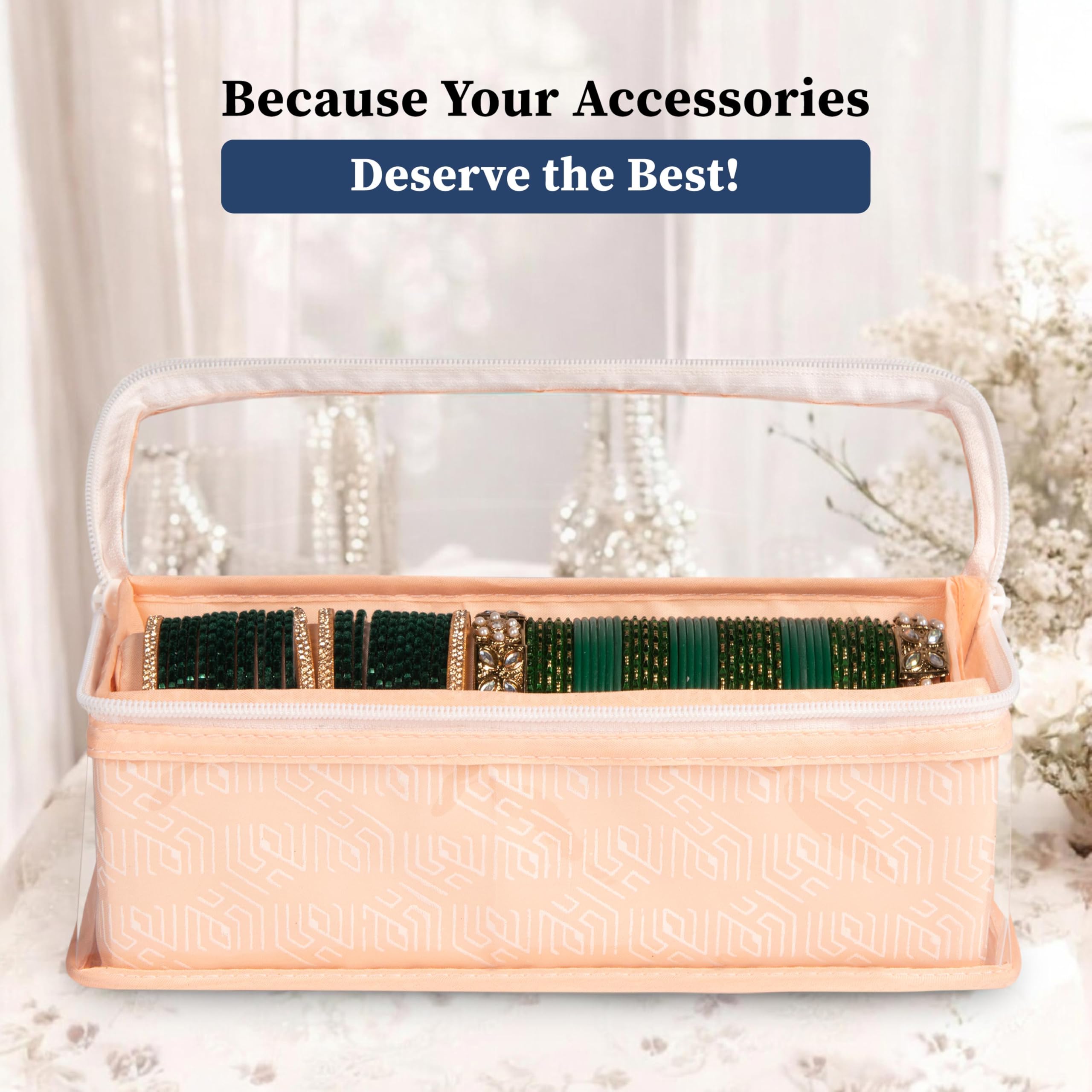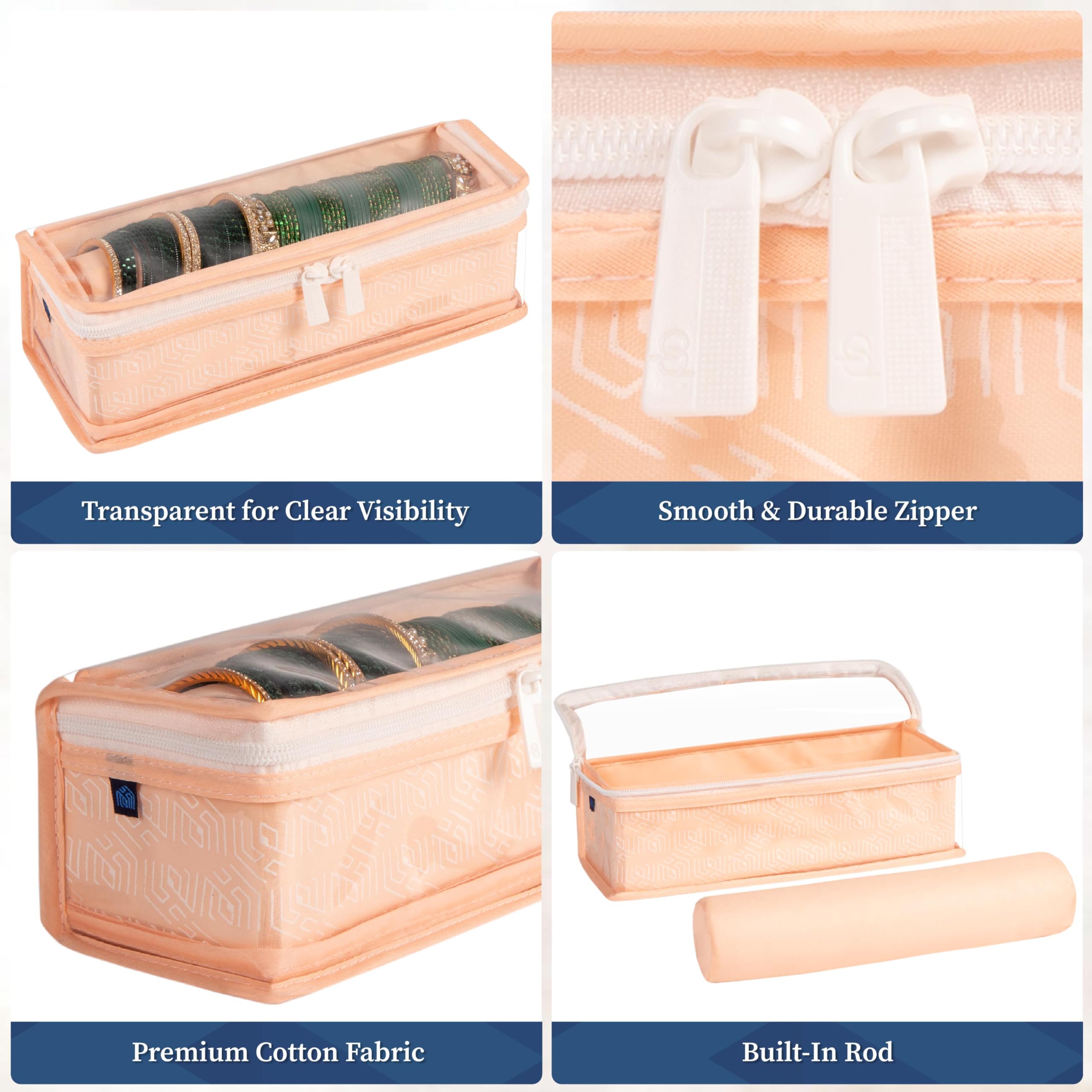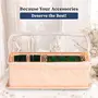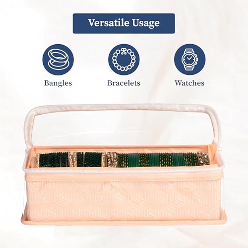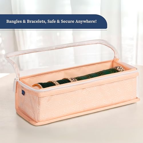 Tired of tangled bangles or missing sets when you need them? The Homestrap Cotton Bangle Box is designed to keep your bangles chudis bracelets and watches neatly organized and protected. With a built-in rod your accessories stay securely in place preventing breakage or scratches. The transparent PVC top allows for quick and easy visibility so you can find the perfect set without opening the box. Made from durable non-woven fabric with a thick PVC layer this bangle box is waterproof and dustproof ensuring your jewellery stays safe from moisture and dust. Built with hardboard on all sides it maintains its shape while being lightweight and foldable for easy