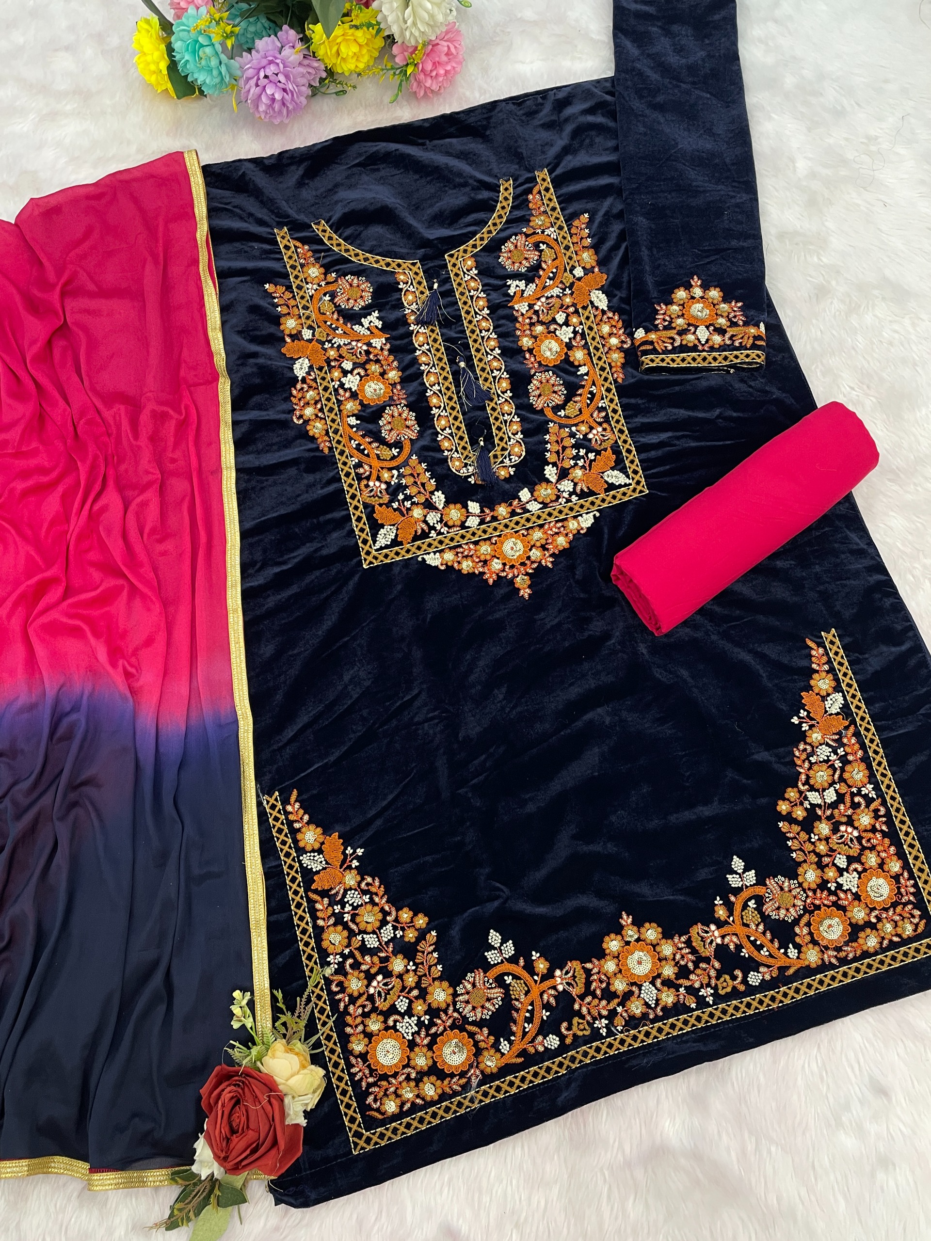 Black-red embroidery sequence & thread work velvet semi stitched salwar suit
