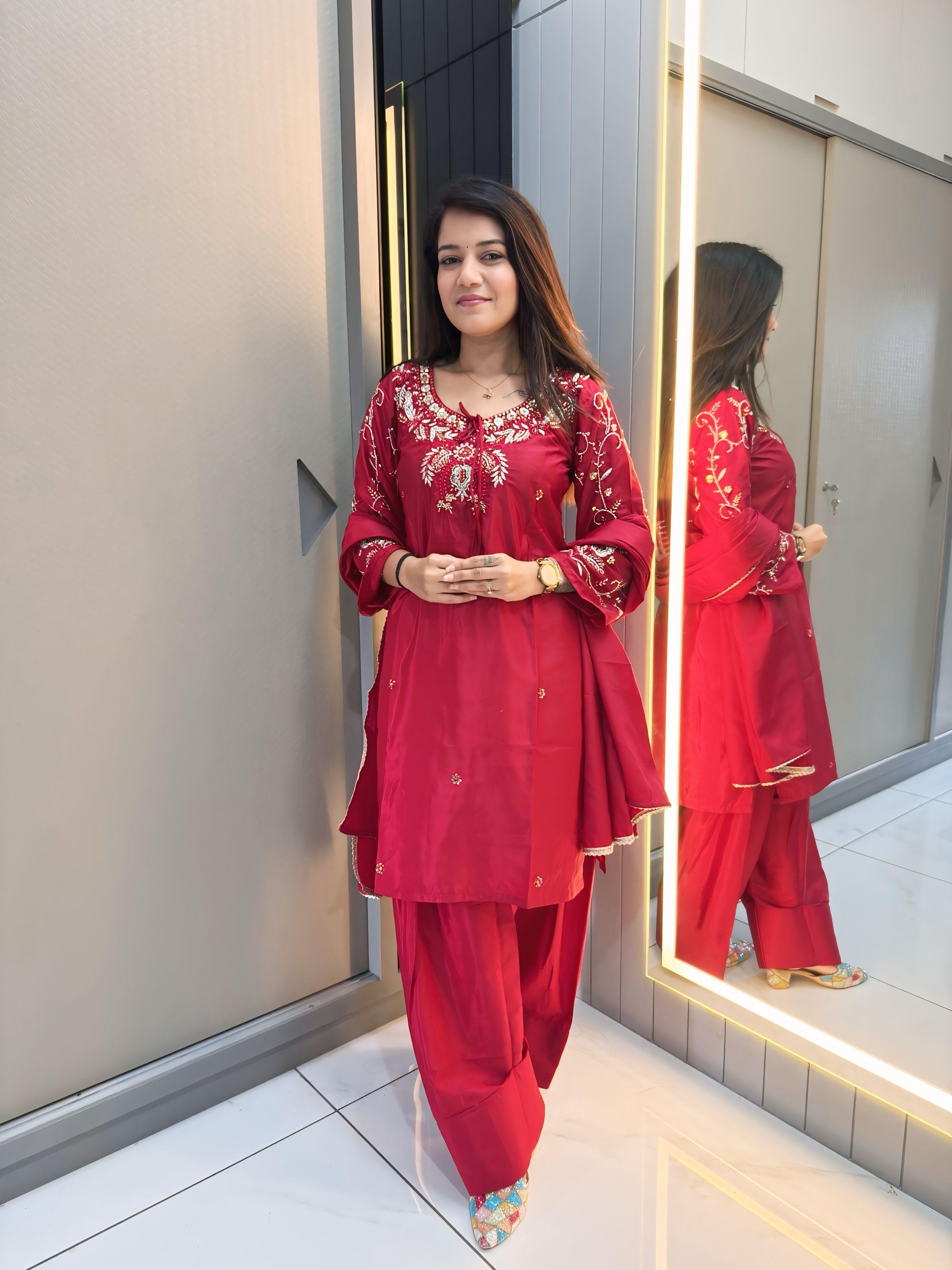 Red Crape Readymade Kurti Set with Beads Sequence Work