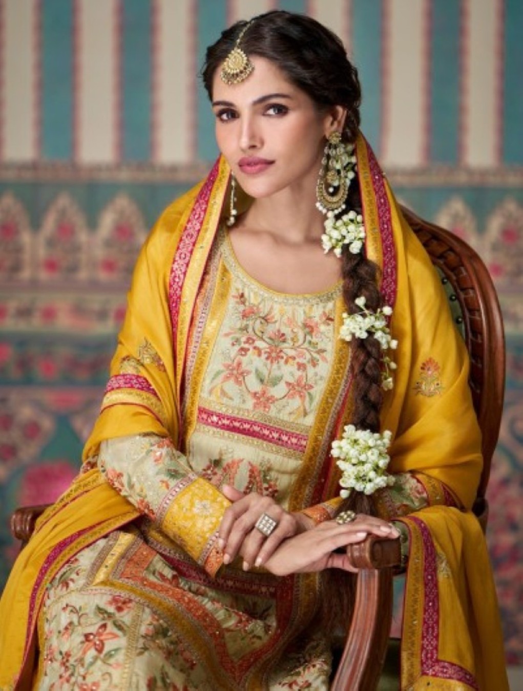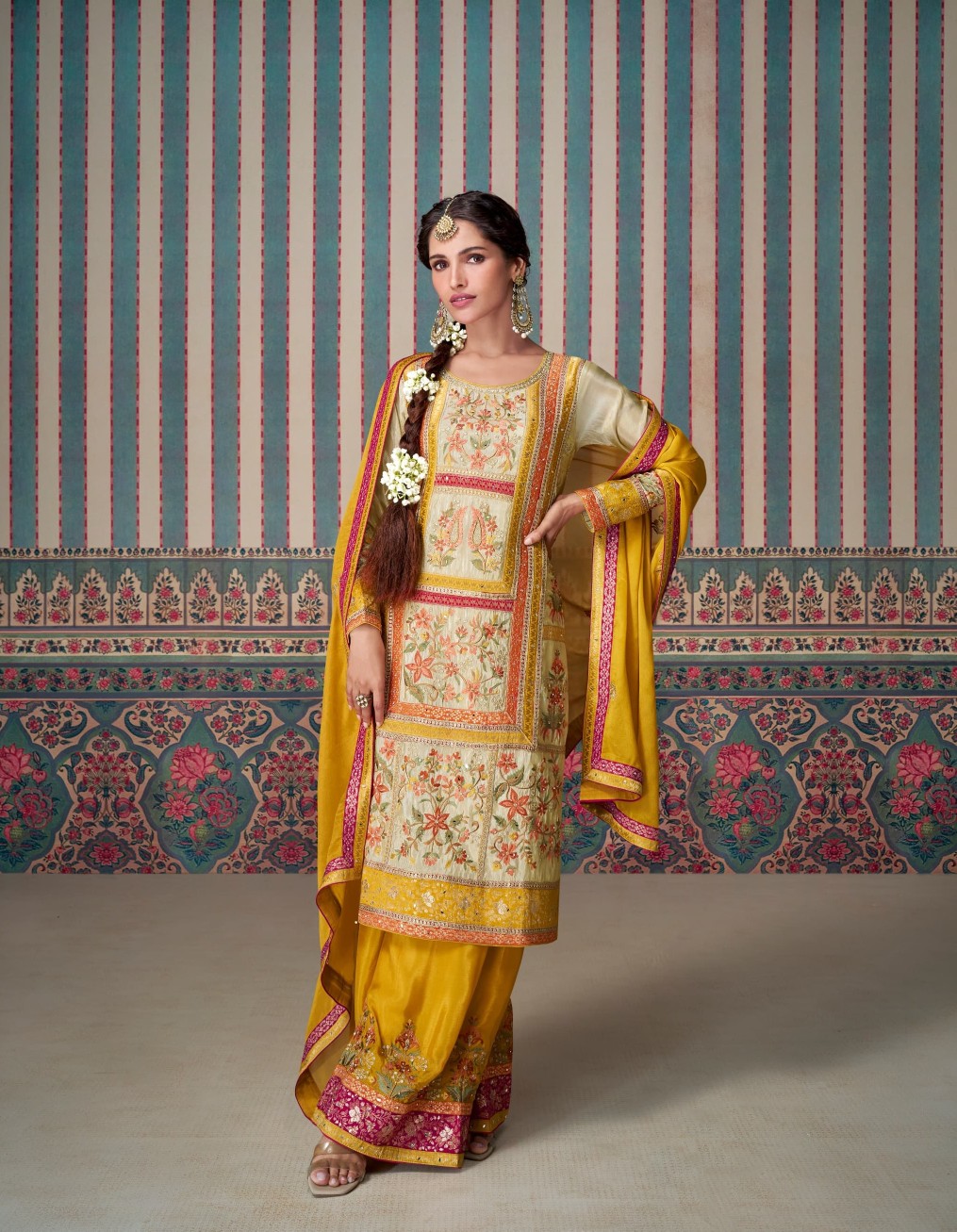 Yellow Embroidered Silk Fully Stitched Plazo suit