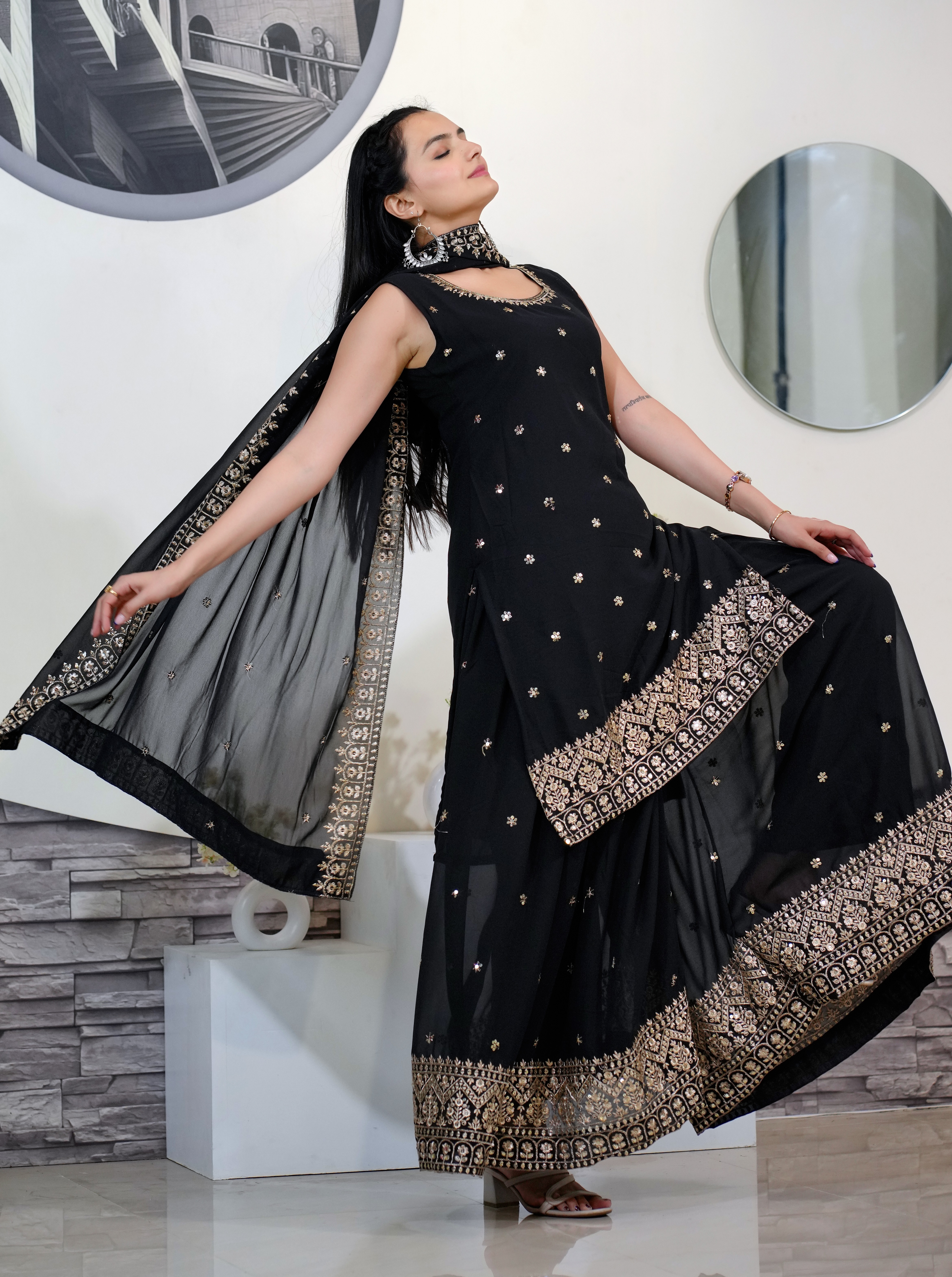 Designer Ethnic Gown Set with Dupatta Fox Georgette Fabric Sequence Embroidery Work for Women – Black Color