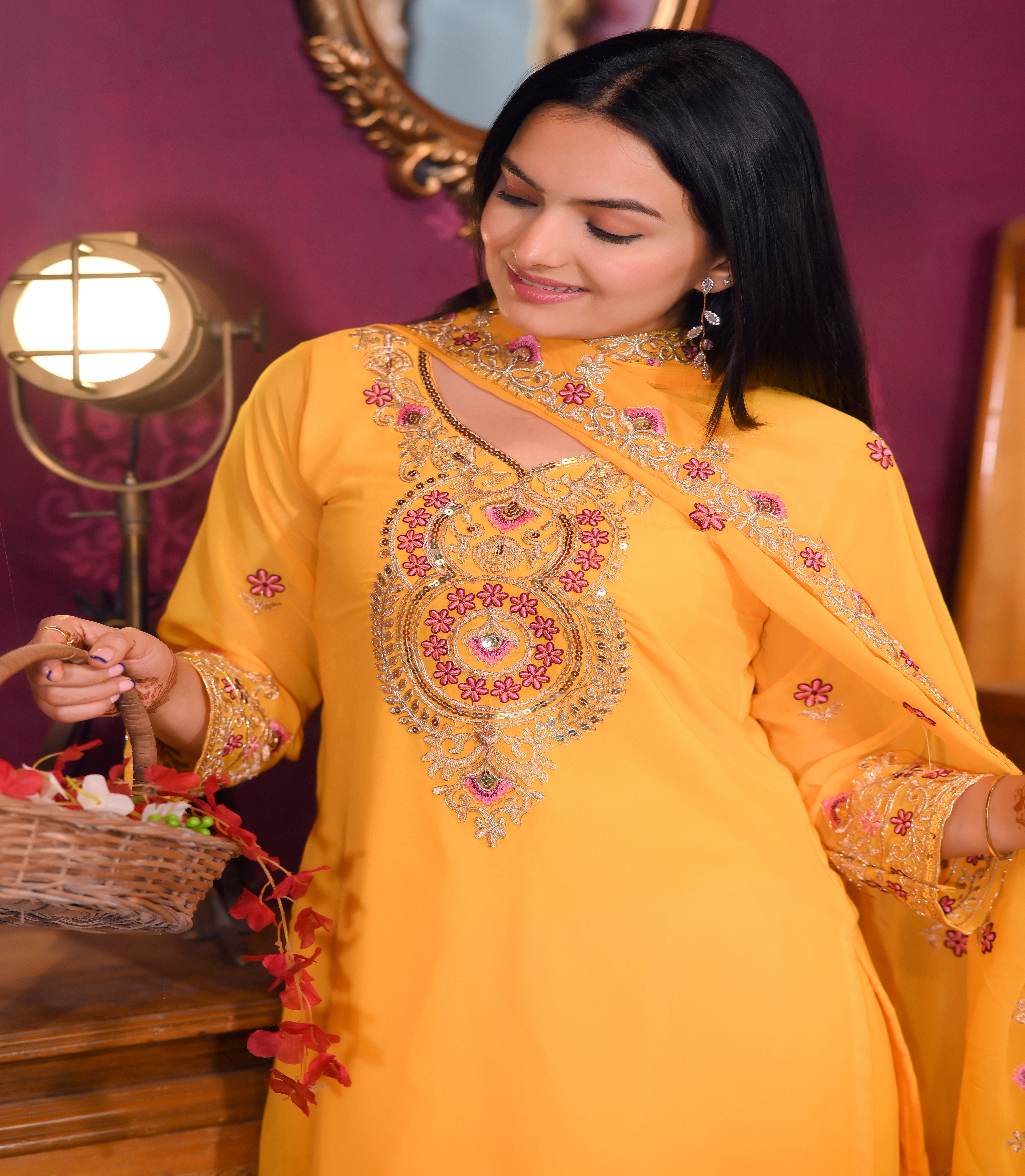 Top, Fabric : Fox Georgette, Inner : Micro, Work : Sequence Embroidery Work, Top length : 46 inch, Stich : S(36), M(38), L(40), XL(42), XXL(44), Pent, Fabric: Fox Georgette, Inner : micro, Stich :- Full Stich With Elastic, Bottom Length: 40 inch, Dupata, Fabric : Fox Georgette, Work. : Sequence Embroidery Work, Length : 2.2 meter.