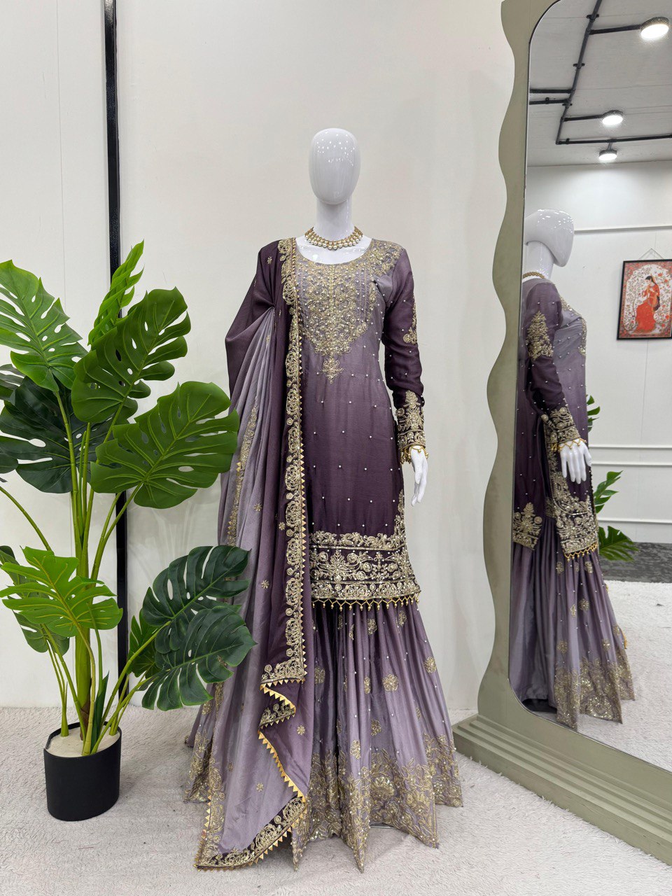 Designer Ethnic Suit Set with Dupatta Chinon Silk Fabric Codeing Dori With Sequnce With Rivet Moti for Women – Lightpurple Color