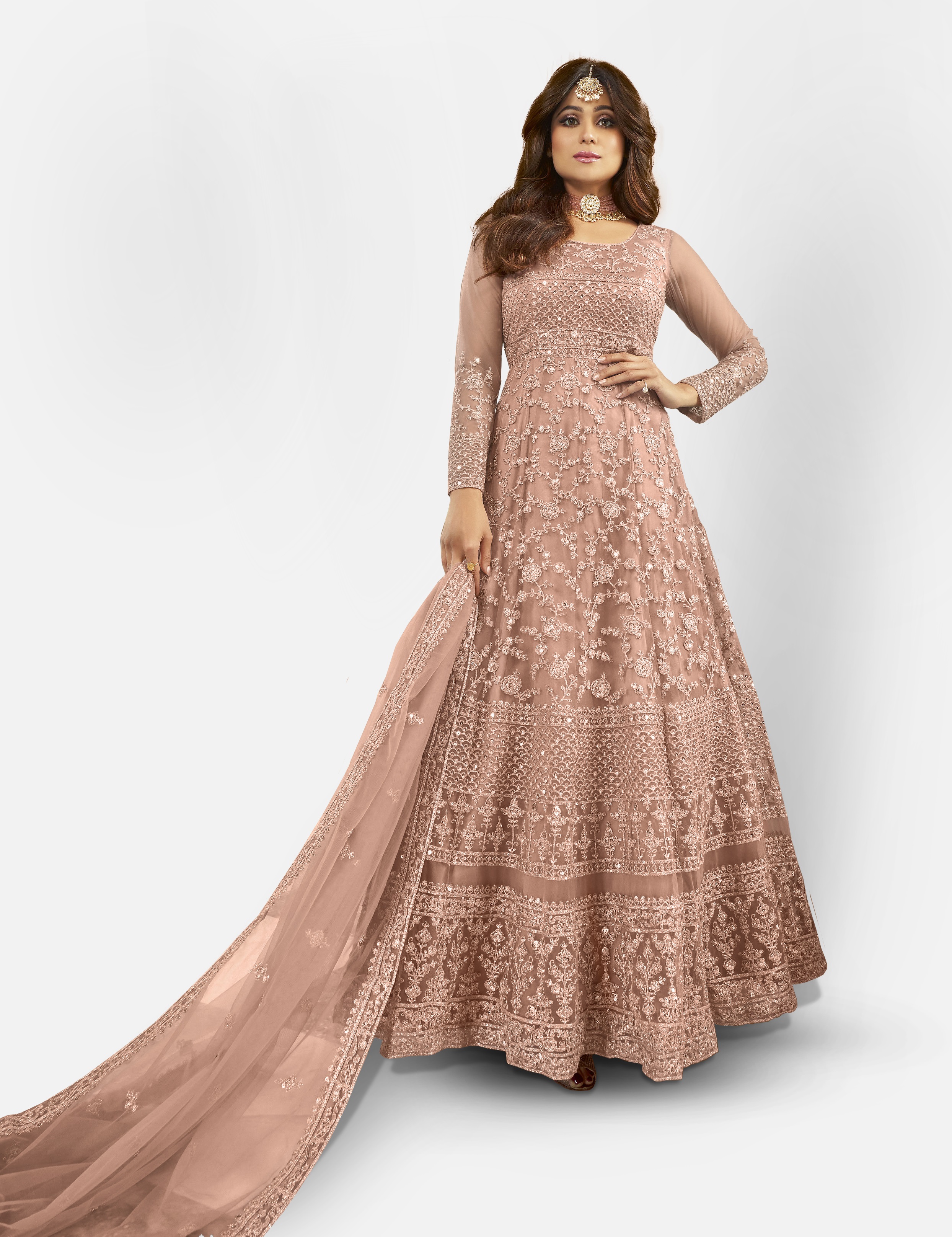 Designer Ethnic Suit Set with Dupatta Net Fabric Dori And Sequins Embroidered Wrok for Women – Peach Color