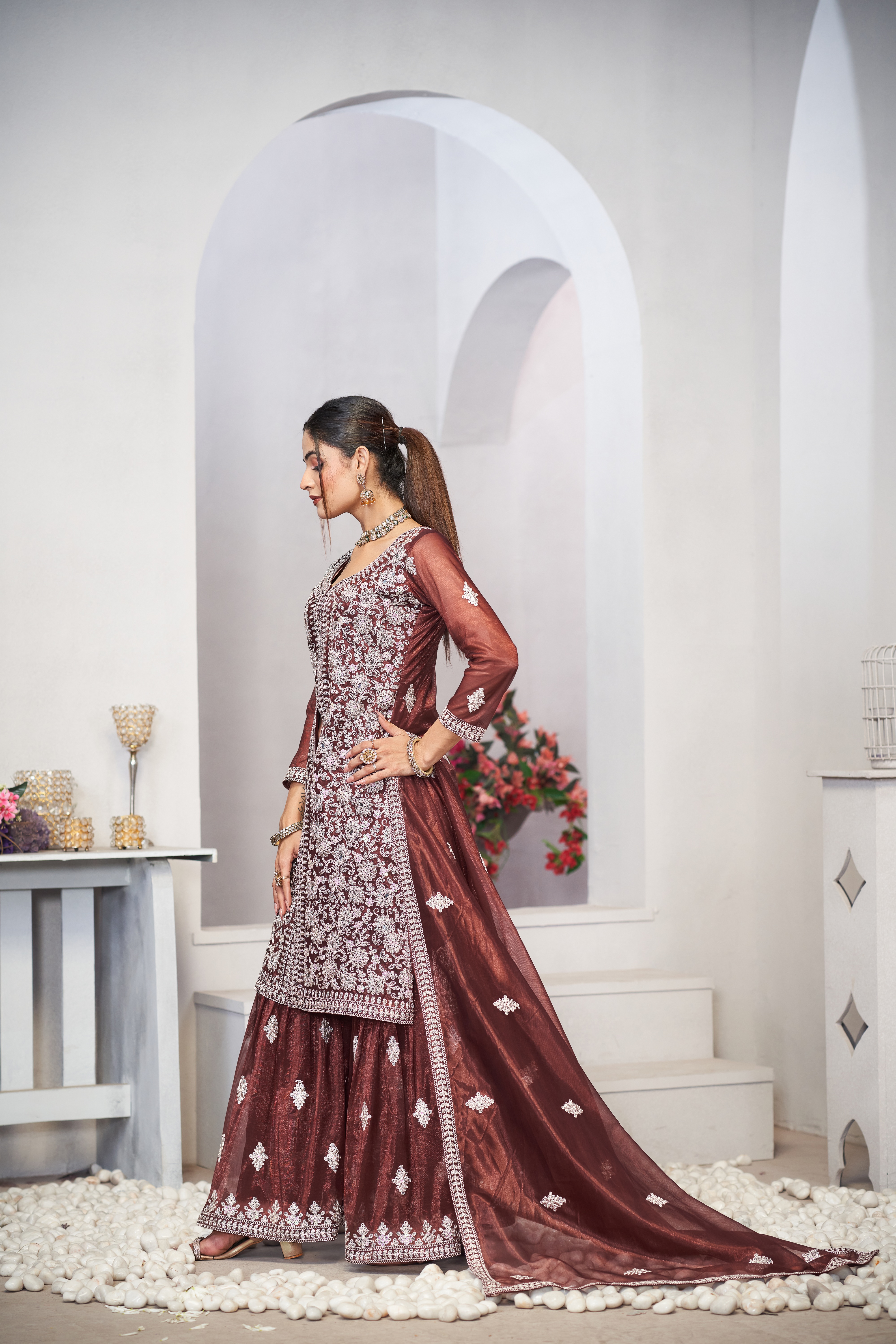 HomeFashionKurtas & Kurta SetsDesigner Ethnic Suit Set with Dupatta Twill Net (Semi Stitche Upto 44' Inch Bust) Fabric Zari Embroidered With Sequins & Real Mirror Work for Women – Brown Color