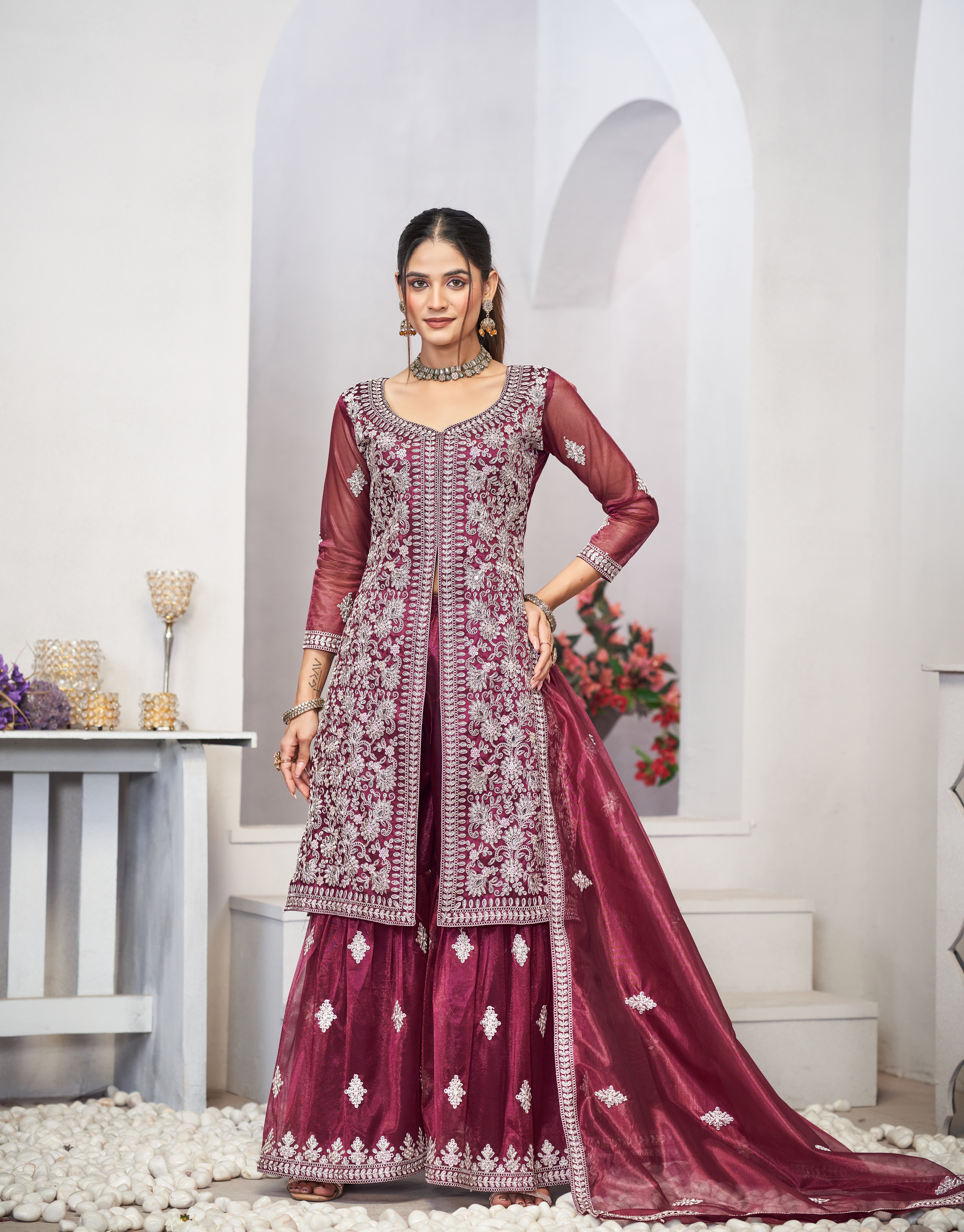 HomeFashionKurtas & Kurta SetsDesigner Ethnic Suit Set with Dupatta Twill Net (Semi Stitche Upto 44' Inch Bust) Fabric Zari Embroidered With Sequins & Real Mirror Work for Women – Purple Color