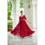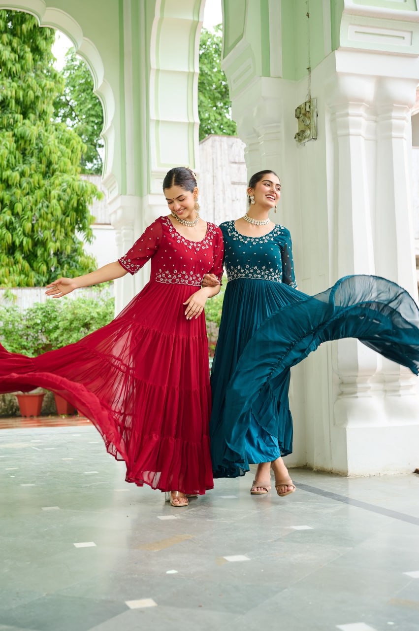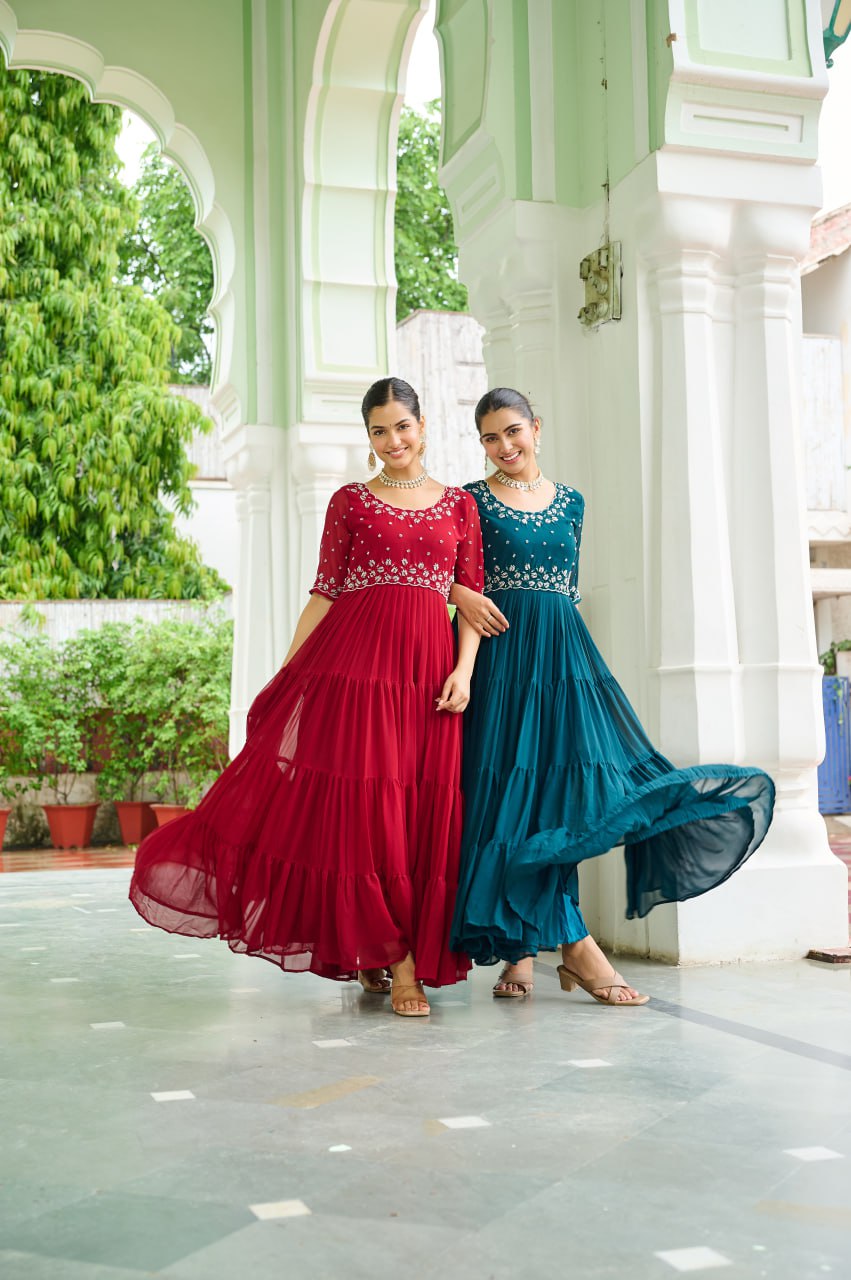 GOWN :- FABRIC WORK:- Faux Blooming with Beads embroidery-work SIZE:- M(38), L(40), XL(42), XXL(44) LENGTH:- 56 INCH FLAIR:- 12 MTR LINING:- Cotton (Full Inner Top To Bottom) SLEEVE:- Half Sleeves NECK TYPE:- Round Neck.