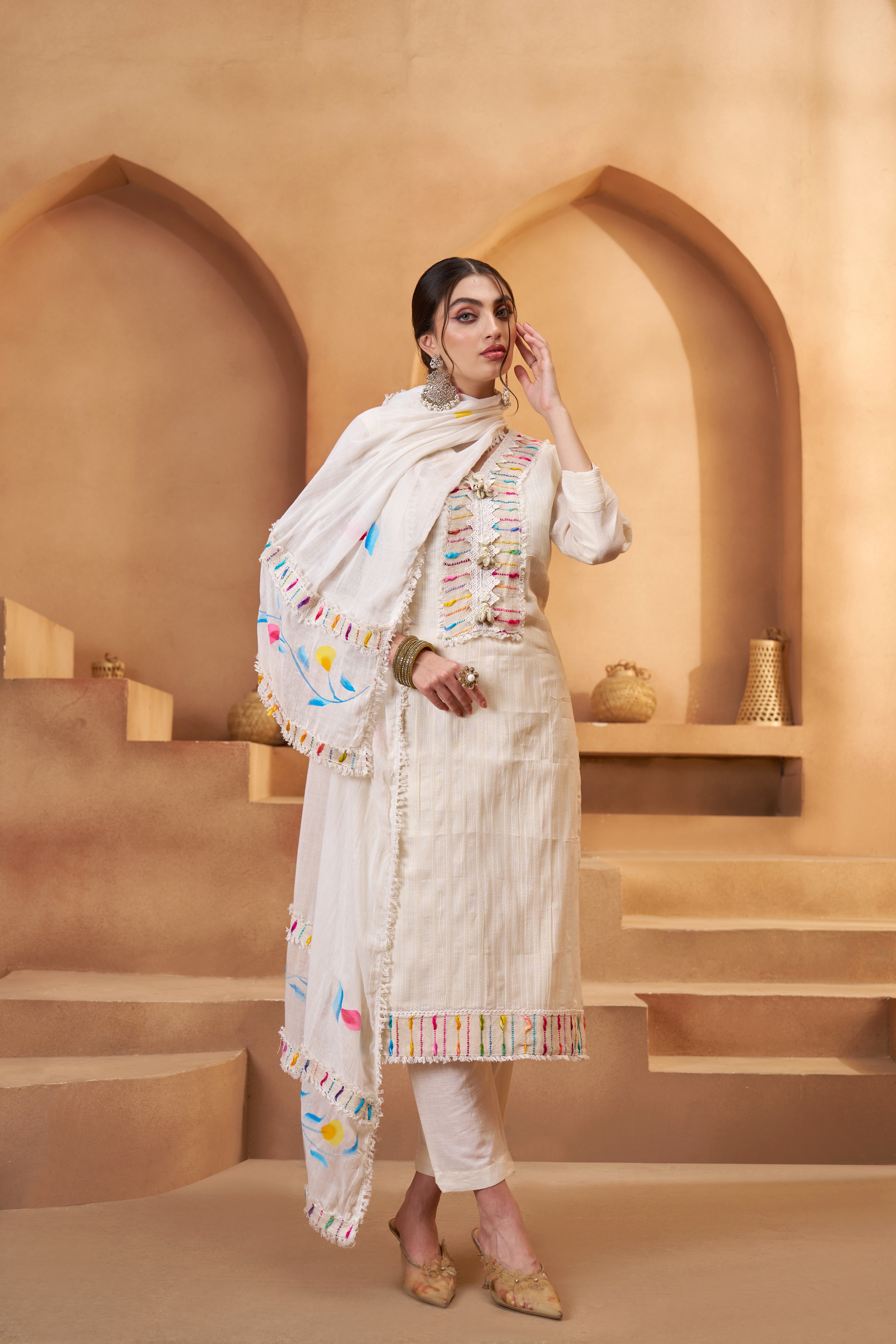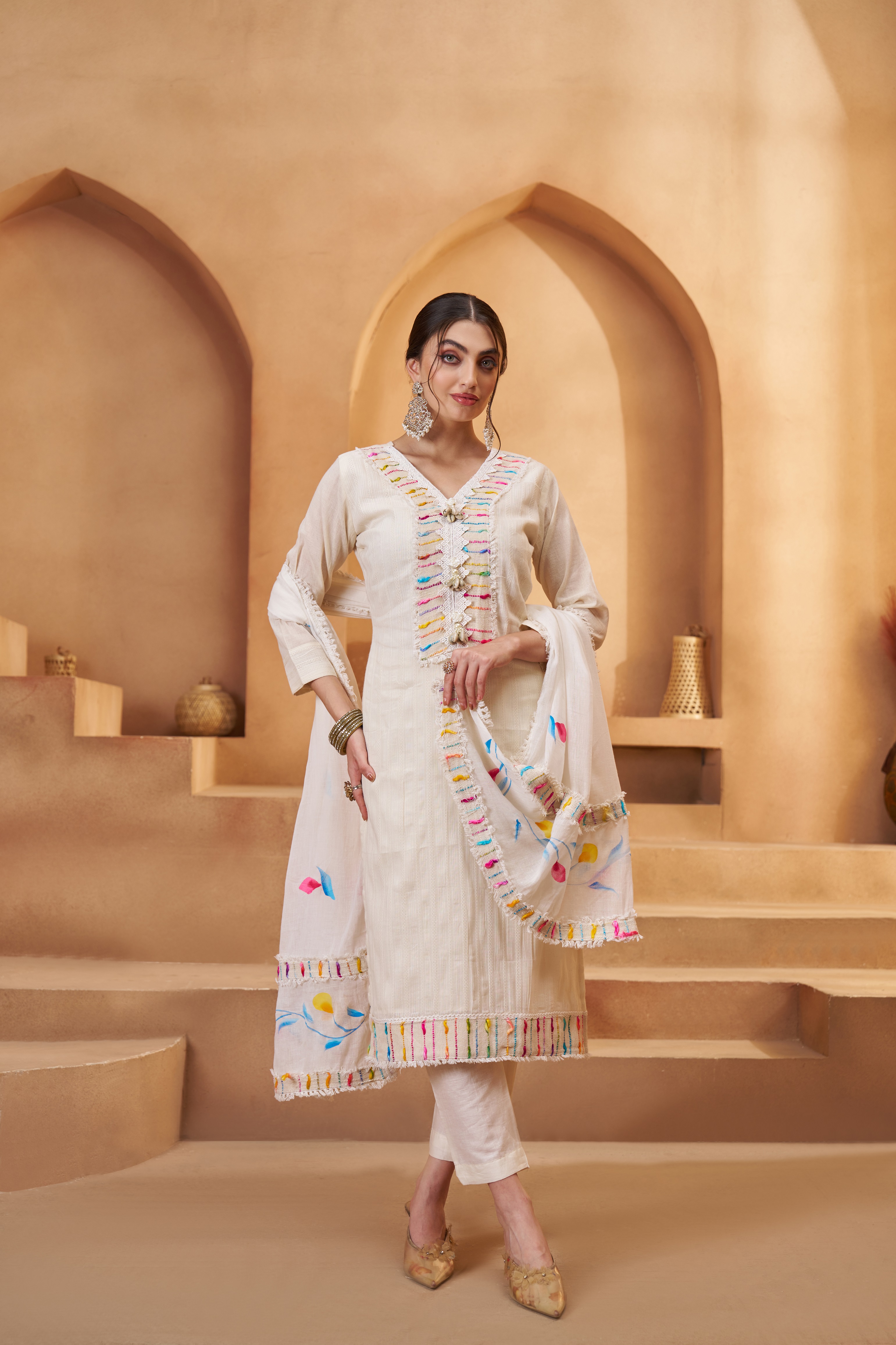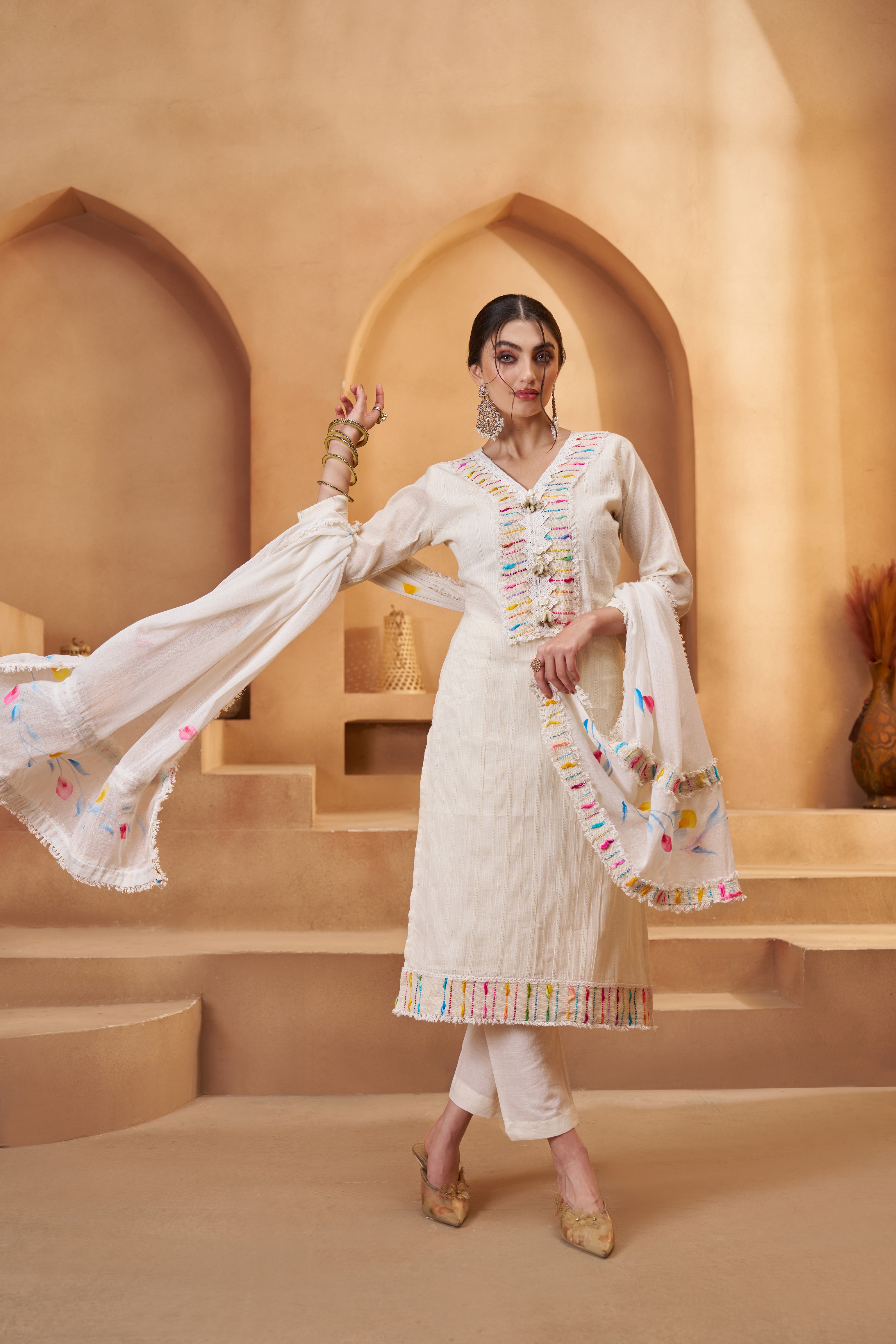 Suit Fabric :- Bombay Cotton Suit Colour :- Off WhiteSuit Size :- 46 InchSuit Height :- 46 InchDupatta Fabric :- Bombay CottonDupatta Size :- 2.25 meterBottom Fabric :- Bombay Cotton Bottom Size :- 2.50 meterWork Description :- Thread work Embroidery with Brush Hand Print and Readymade Fancy Lace.