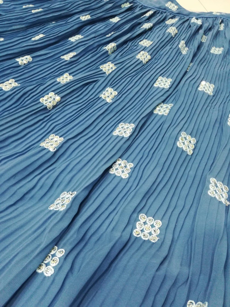 LEHENGA(BOTTOM)FABRIC: - FAUX GEORGETTEINNER: - MICRO FABRICWORK: - 3MM SEQUINS WITH THREAD EMBROIDERY WORKSTITCH: - SEMISTITCHED (WITH CANCAN AND CANVAS)SIZE: - 42HEIGHT AND 42WAISTFLAIR: - 3.50 METER FLAIRCOLOR: - BLUECHOLI(TOP)FABRIC: - FAUX GEORGETTESIZE: - 0.80 METER FABRICWORK: - 3MM SEQUINS WITH THREAD EMBROIDERY WORKSTITCH: - UNSTITCHED FABRICCOLOR: - BLUEDUPATTAFABRIC: - NETWORK: - PEARL AND KODI HAND WORK DUPATTASIZE: - 2.25 METER DUPATTASTITCH: - FULL STITCHEDCOLOR: - BLUEADDITIONALWASH CARE: - DRY CLEAN ONLYCOLOR: - PRODUCT COLOR MAY SLIGHTLY VARY DUE TO PHOTOGRAPHIC LIGHTNING SOURCES OR YOUR DEVICE DISPLAY SETTINGSTHESE ARE MADE TO ORDER DESIGNER STYLES, HENCE EXPECT A SLIGHT VARIATION FROM THE IMAGE DISPLAYEDIN THE BOX 1 PIECE LEHENGA 1 PIECE DUPATTA 1 PIECE BLOUSE FABRIC.