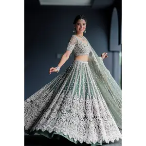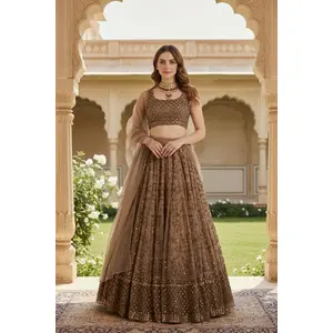 Brown Embroidered Net Lehenga Set