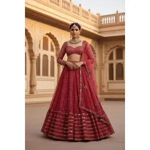 Red Sequin Embroidered Faux Georgette...
