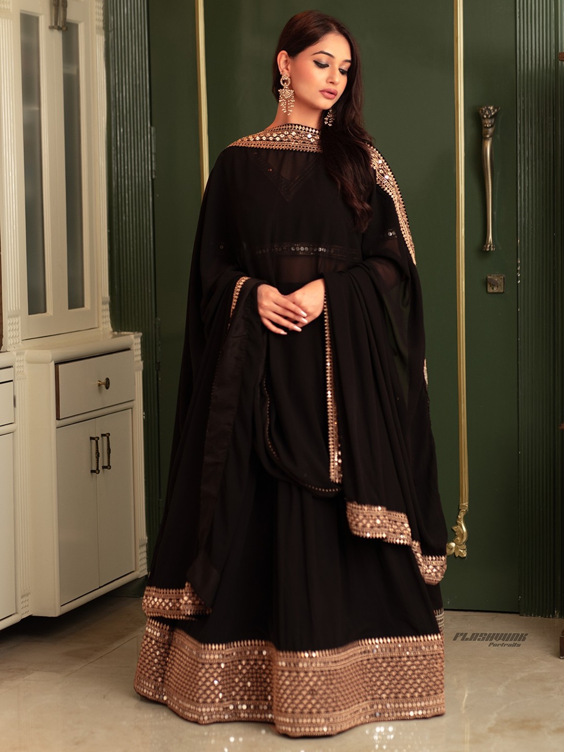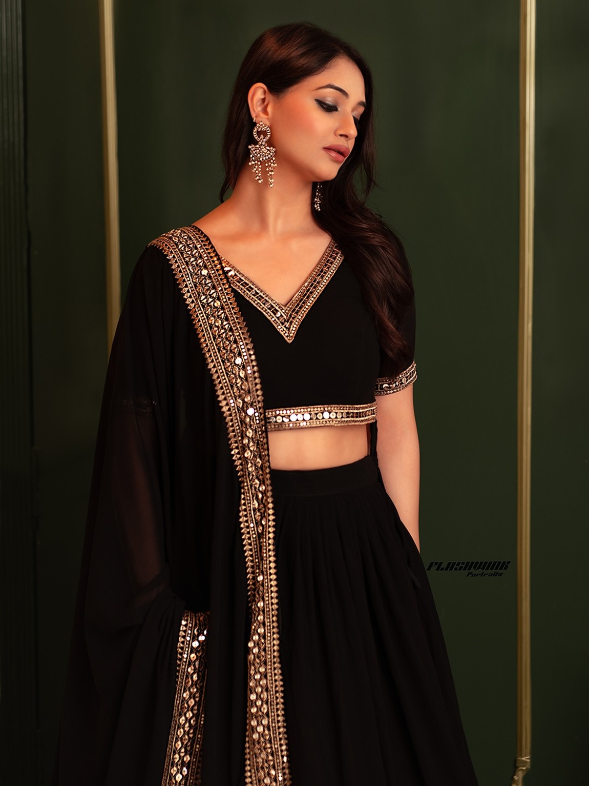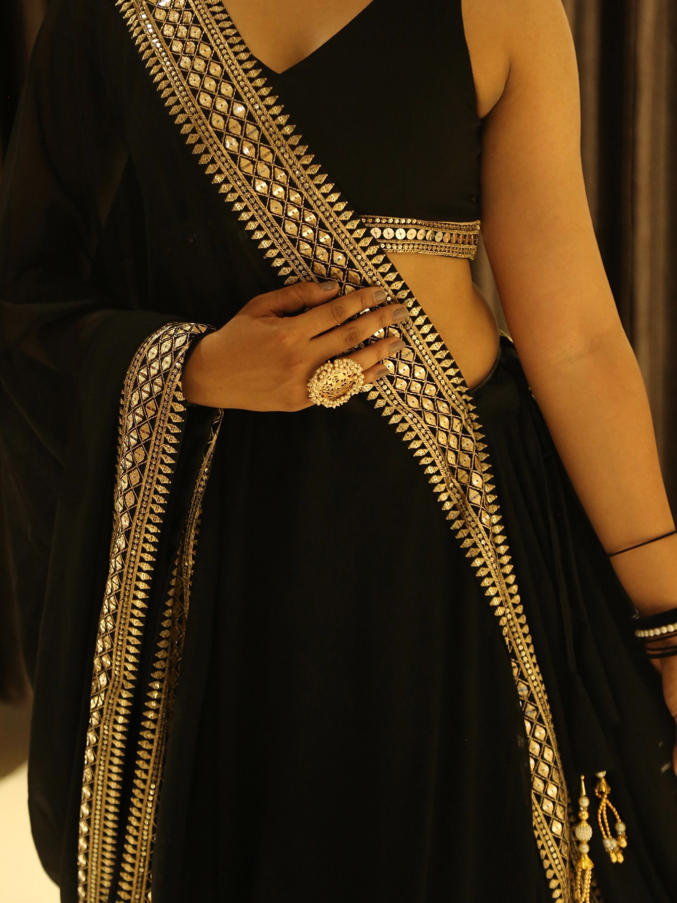 Elevate your ethnic look with this black faux georgette lehenga featuring sequins work work. Designed for festive occasions and celebrations, it offers a graceful flow and timeless appeal.Crafted from lightweight faux georgette fabric with a semi-stitched finish, this lehenga ensures comfort and easy customization. Dry clean recommended.