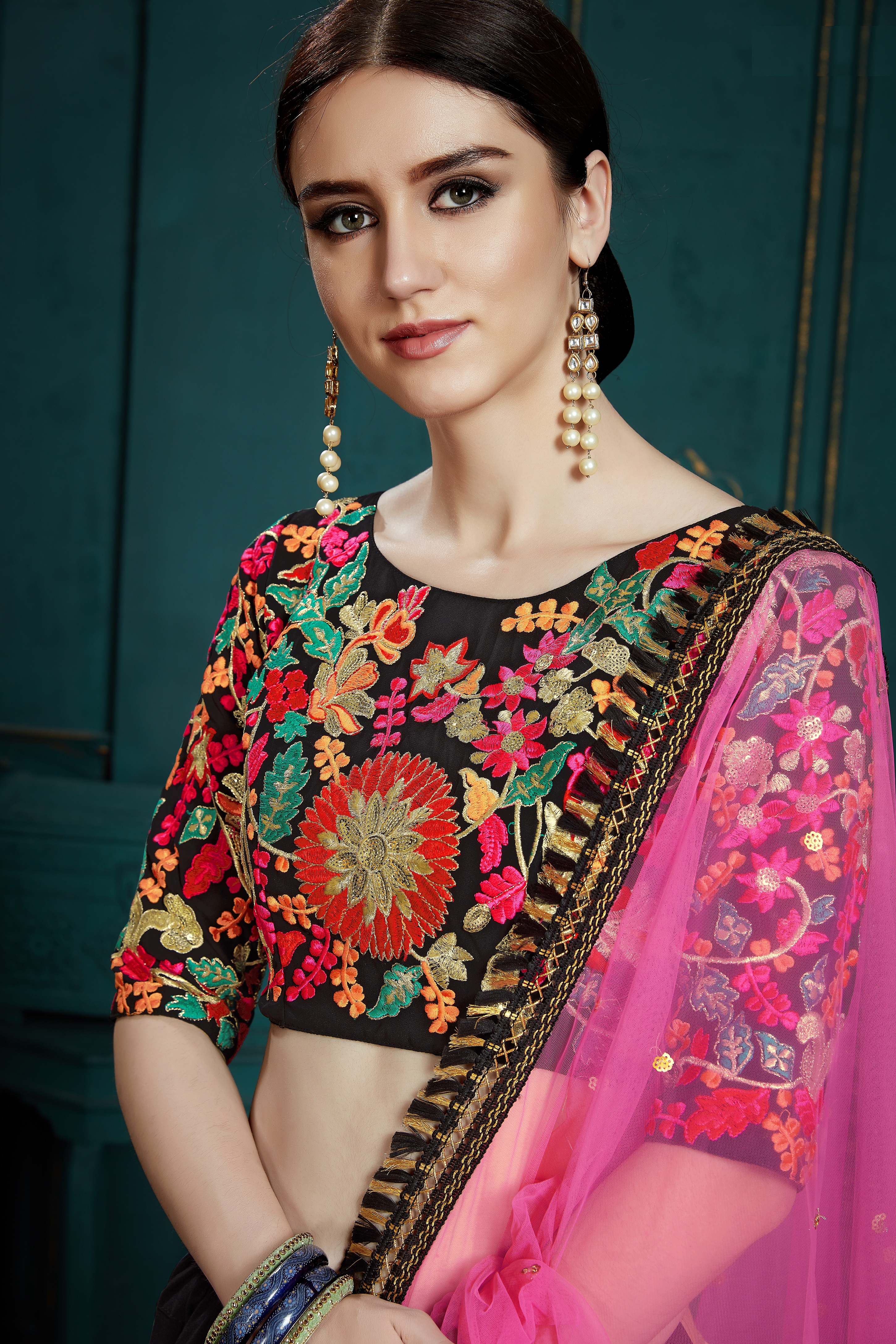Elevate your ethnic look with this black faux georgette lehenga featuring thread embroidery work. Designed for festive occasions and celebrations, it offers a graceful flow and timeless appeal.Crafted from lightweight faux georgette fabric with a semi-stitched finish, this lehenga ensures comfort and easy customization. Dry clean recommended.