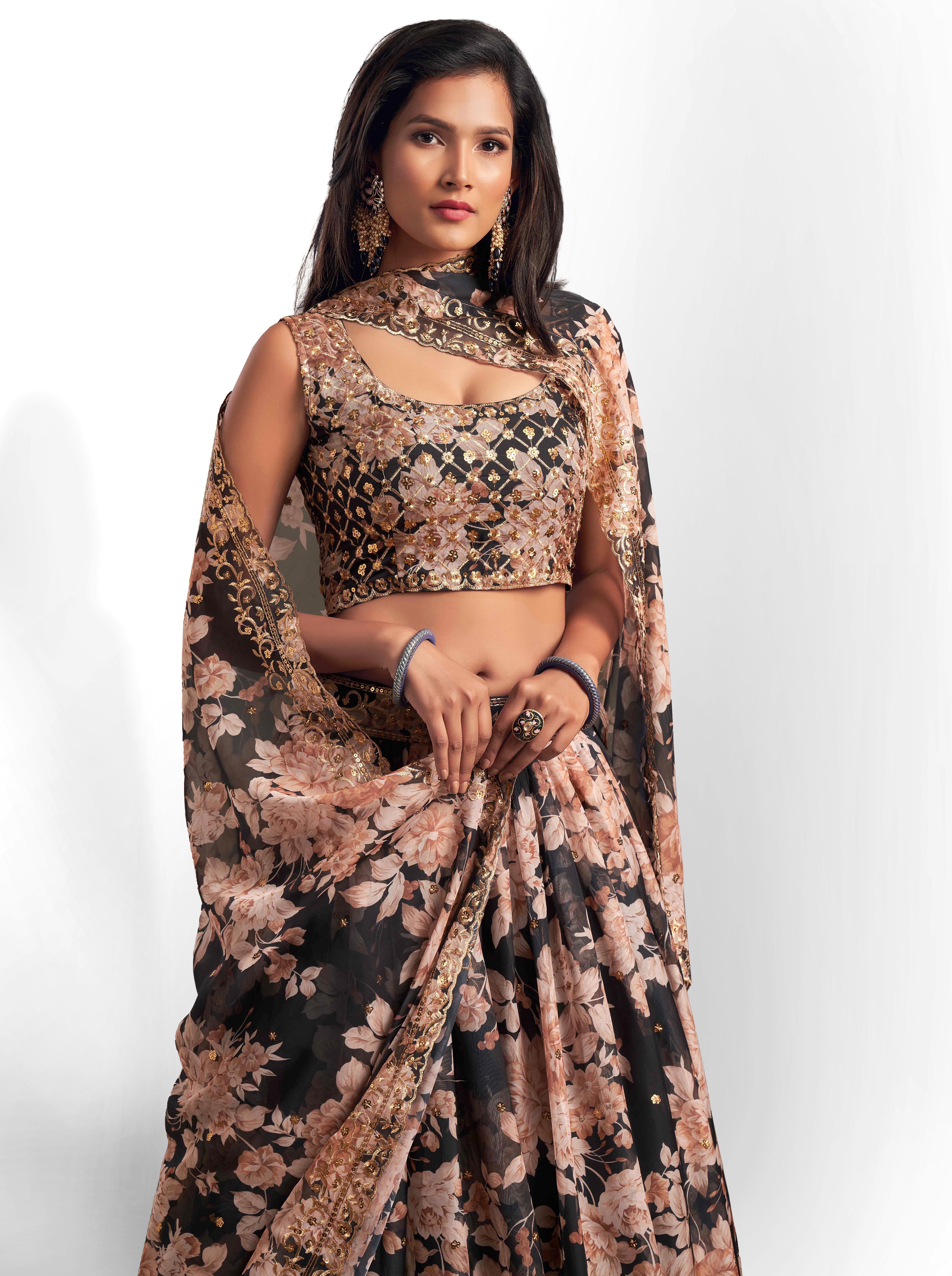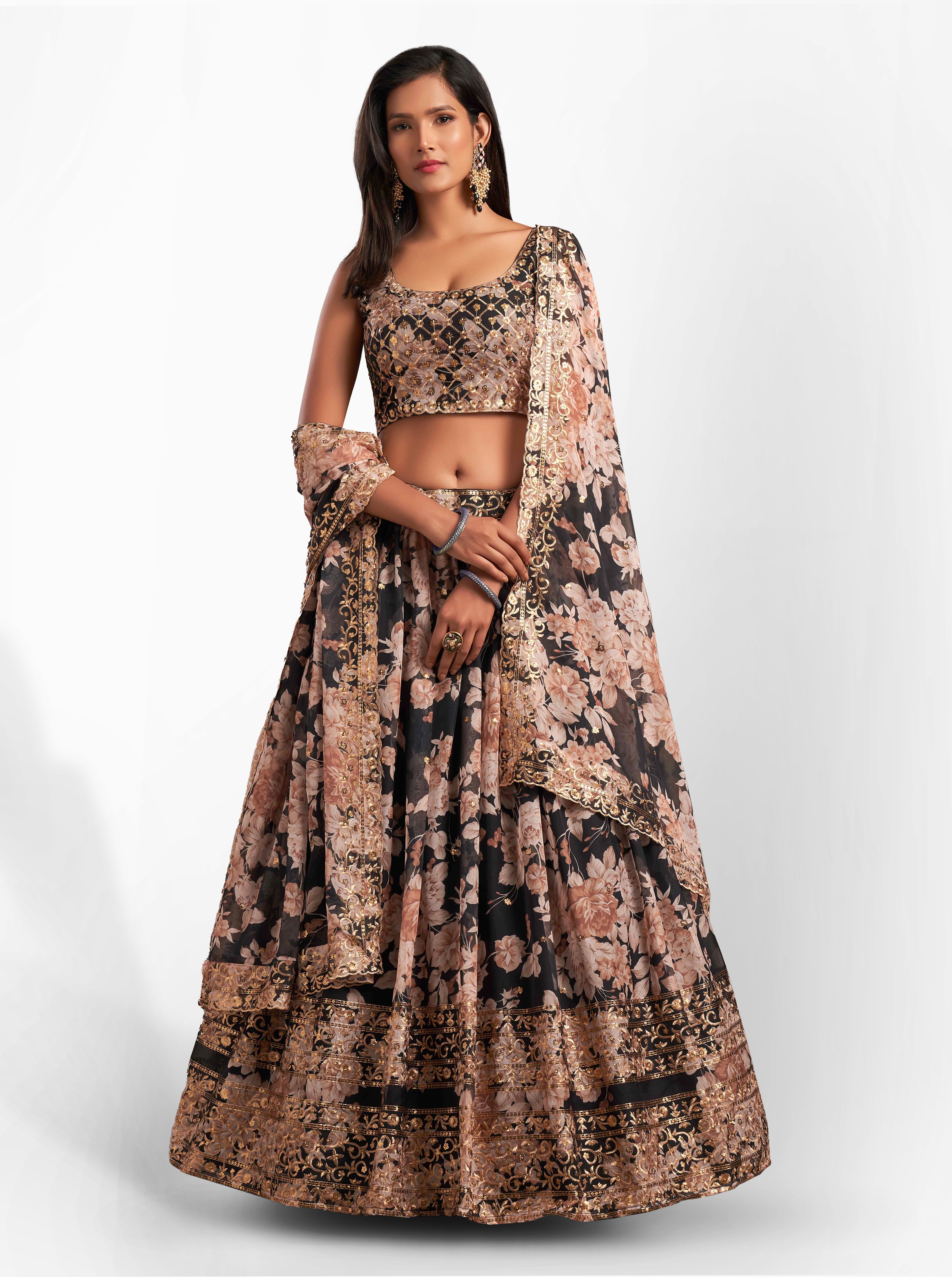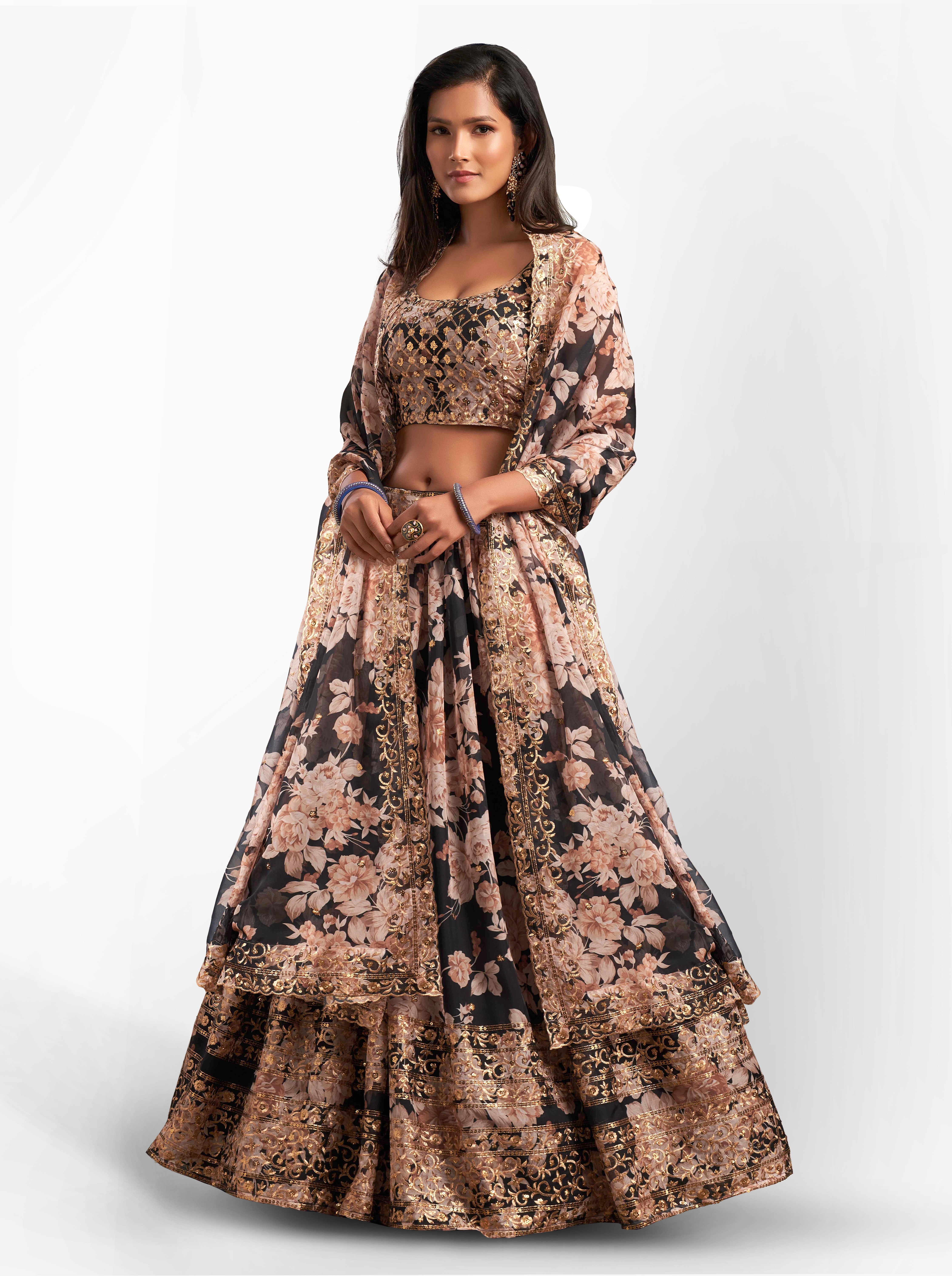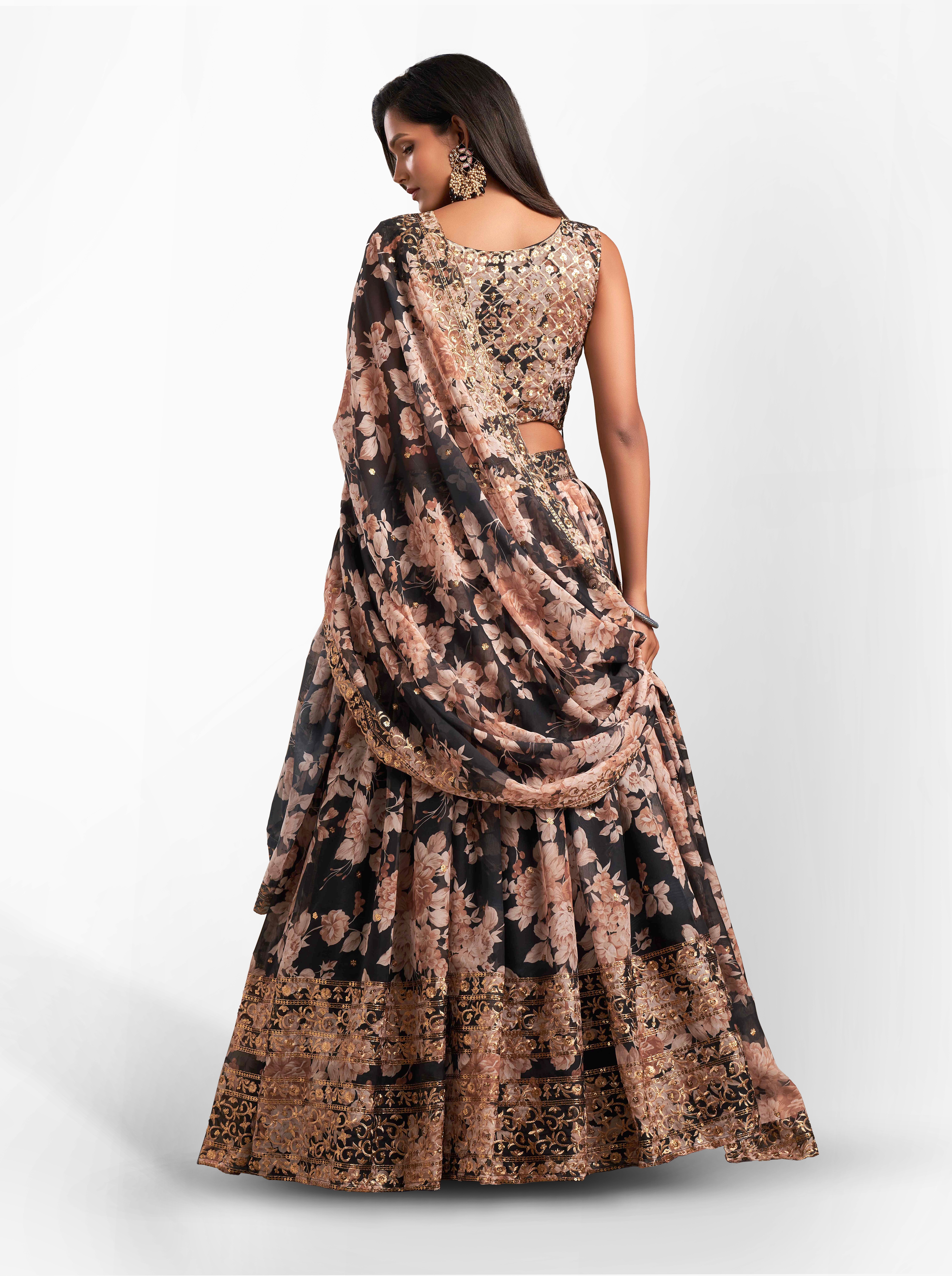 Womens Black Organza Sequence Work,Floral Work Embroidery Lehenga Set