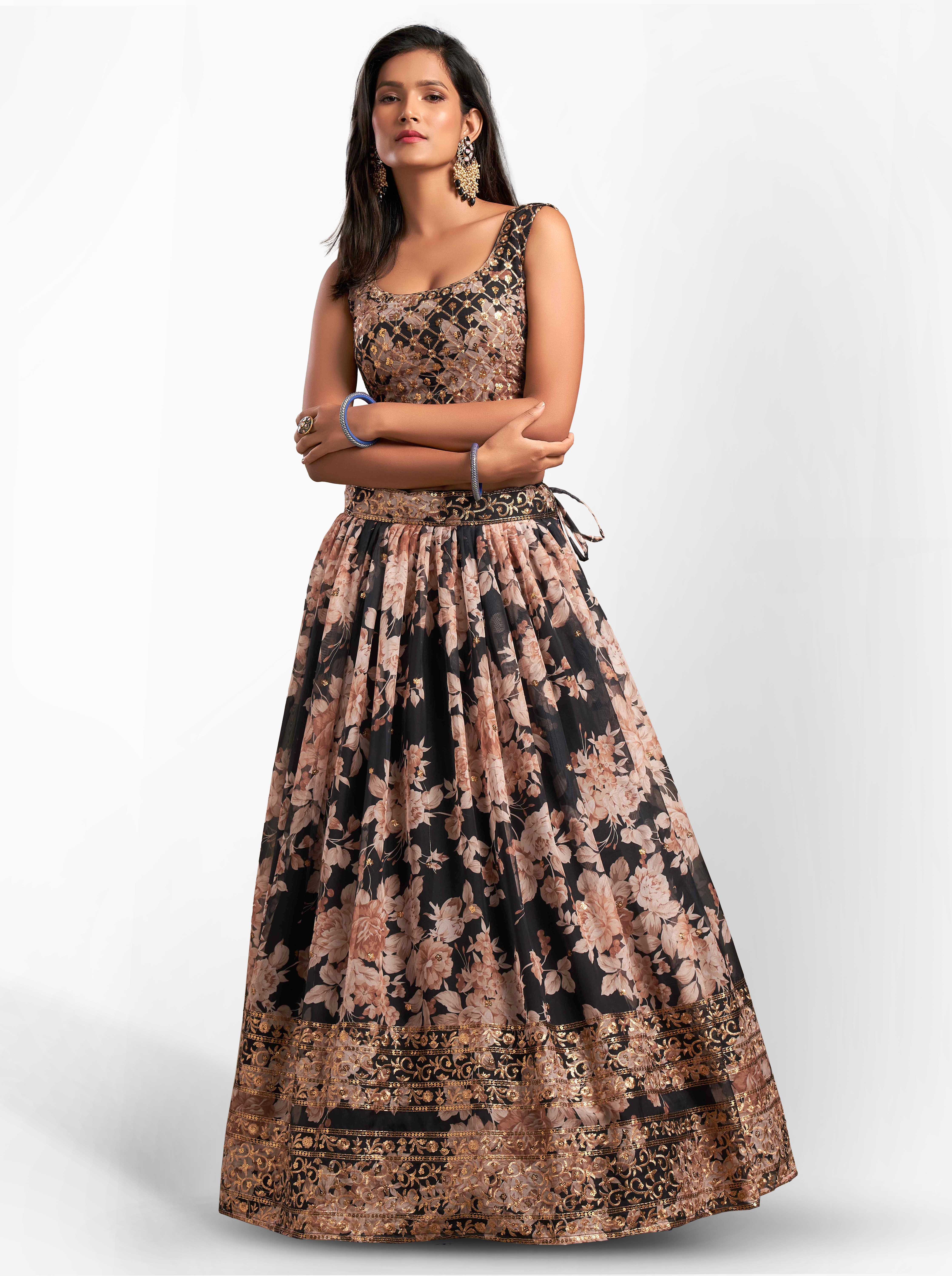 Elevate your ethnic look with this black organza lehenga featuring sequence work,floral work embroidery work. Designed for festive occasions and celebrations, it offers a graceful flow and timeless appeal.Crafted from lightweight organza fabric with a semi-stitched finish, this lehenga ensures comfort and easy customization. Dry clean recommended.