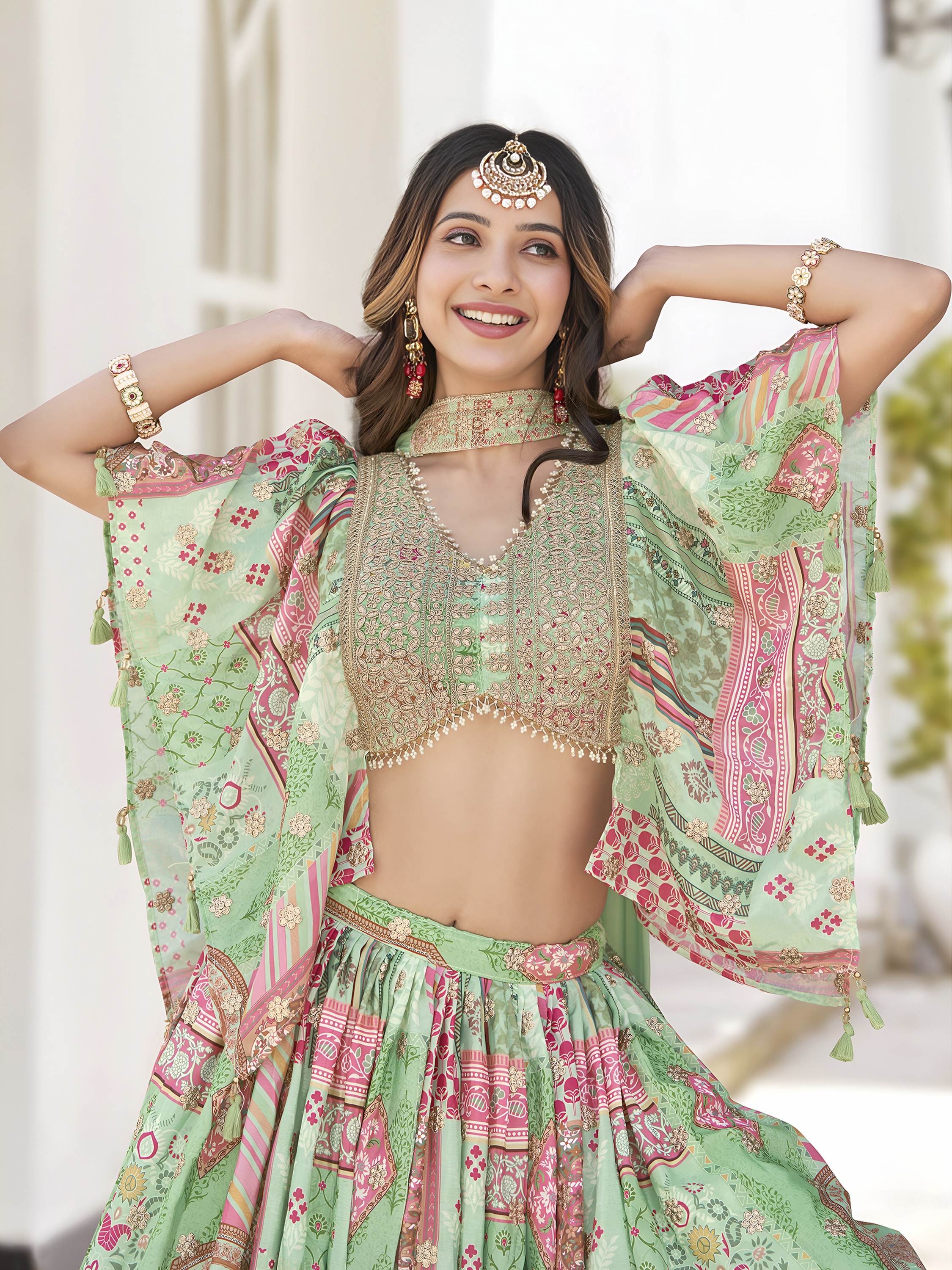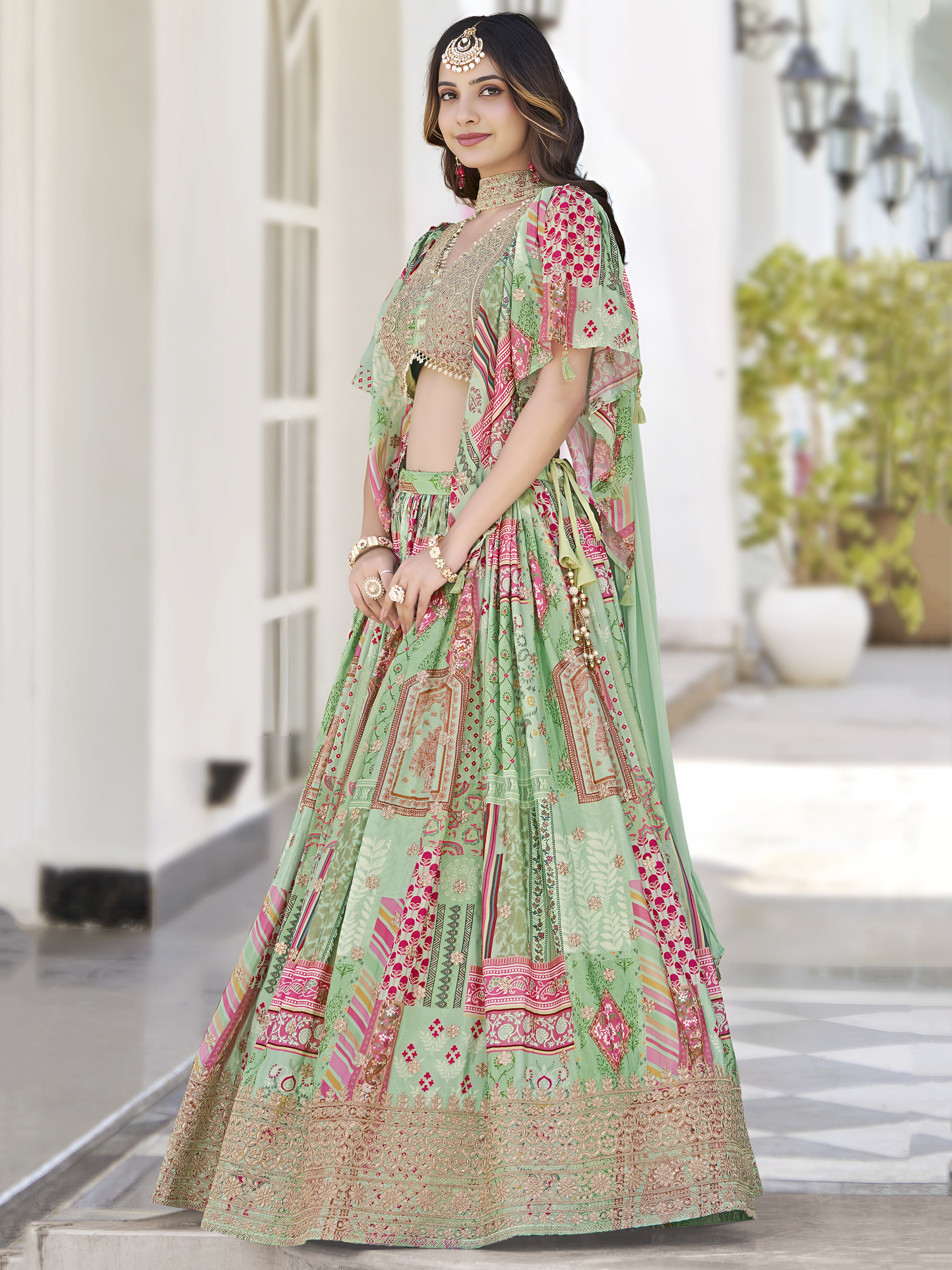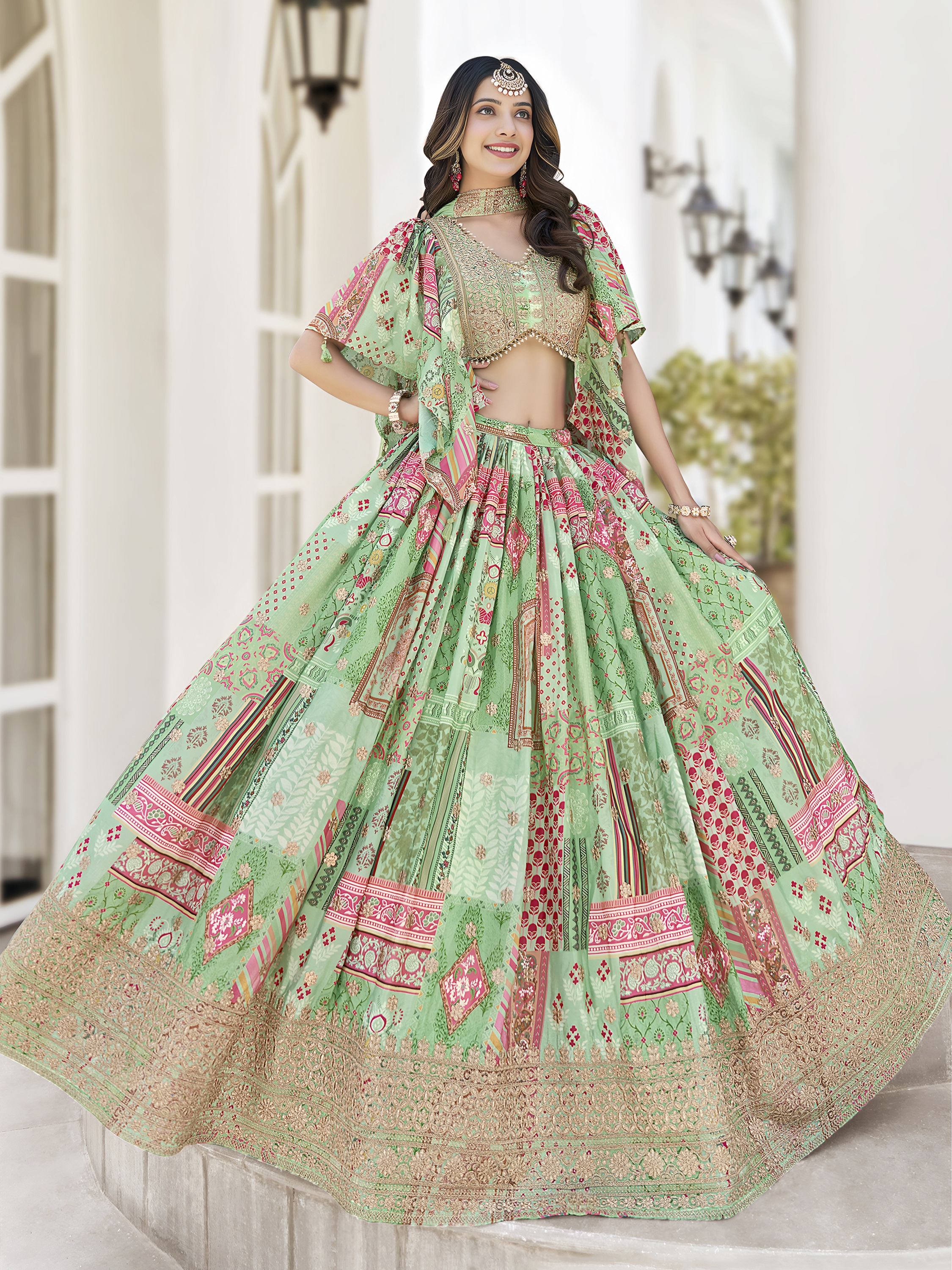 Elevate your ethnic look with this green chinnon lehenga featuring dori embroidery work. Designed for festive occasions and celebrations, it offers a graceful flow and timeless appeal.Crafted from lightweight chinnon fabric with a semi-stitched finish, this lehenga ensures comfort and easy customization. Dry clean recommended.