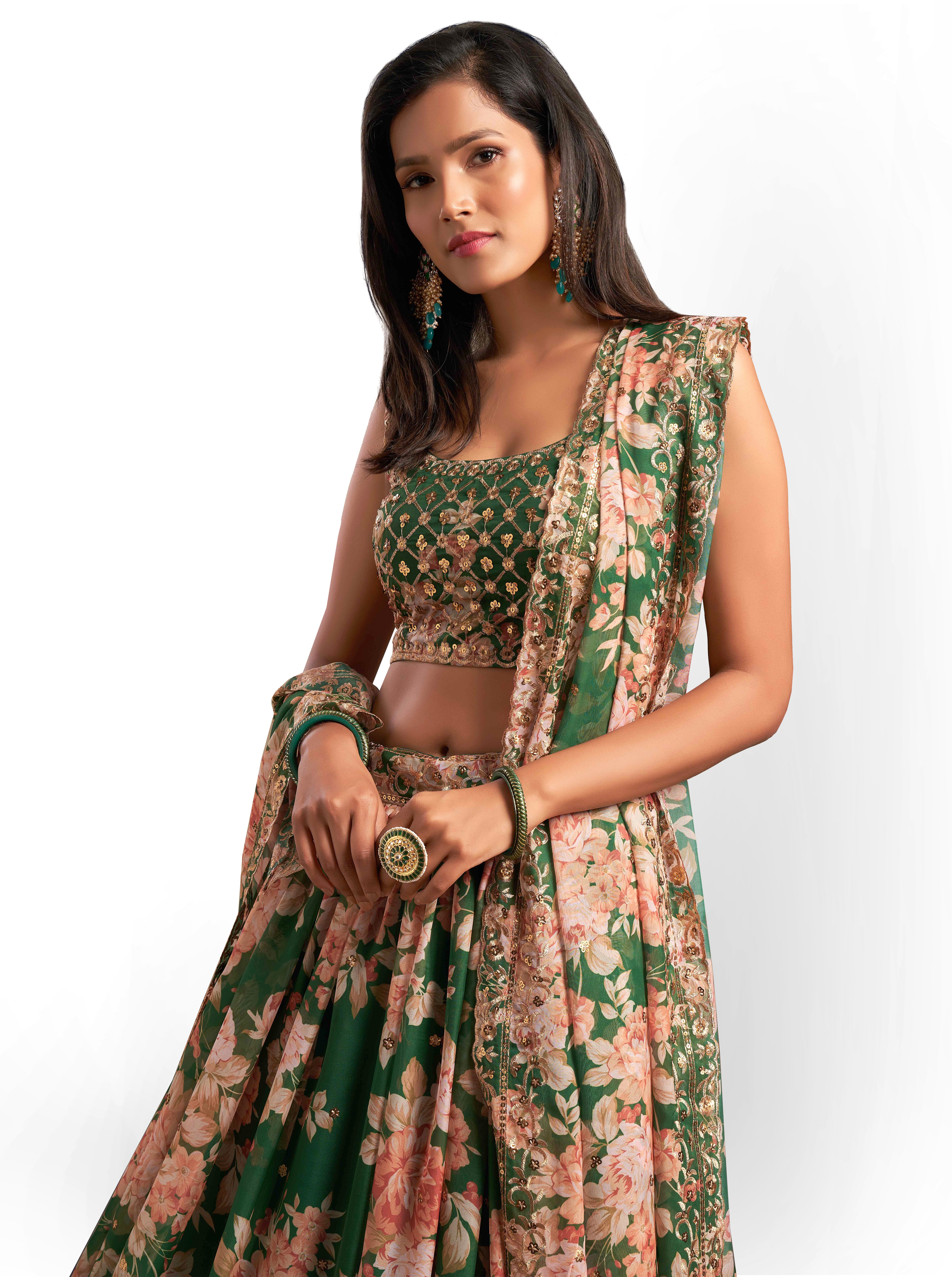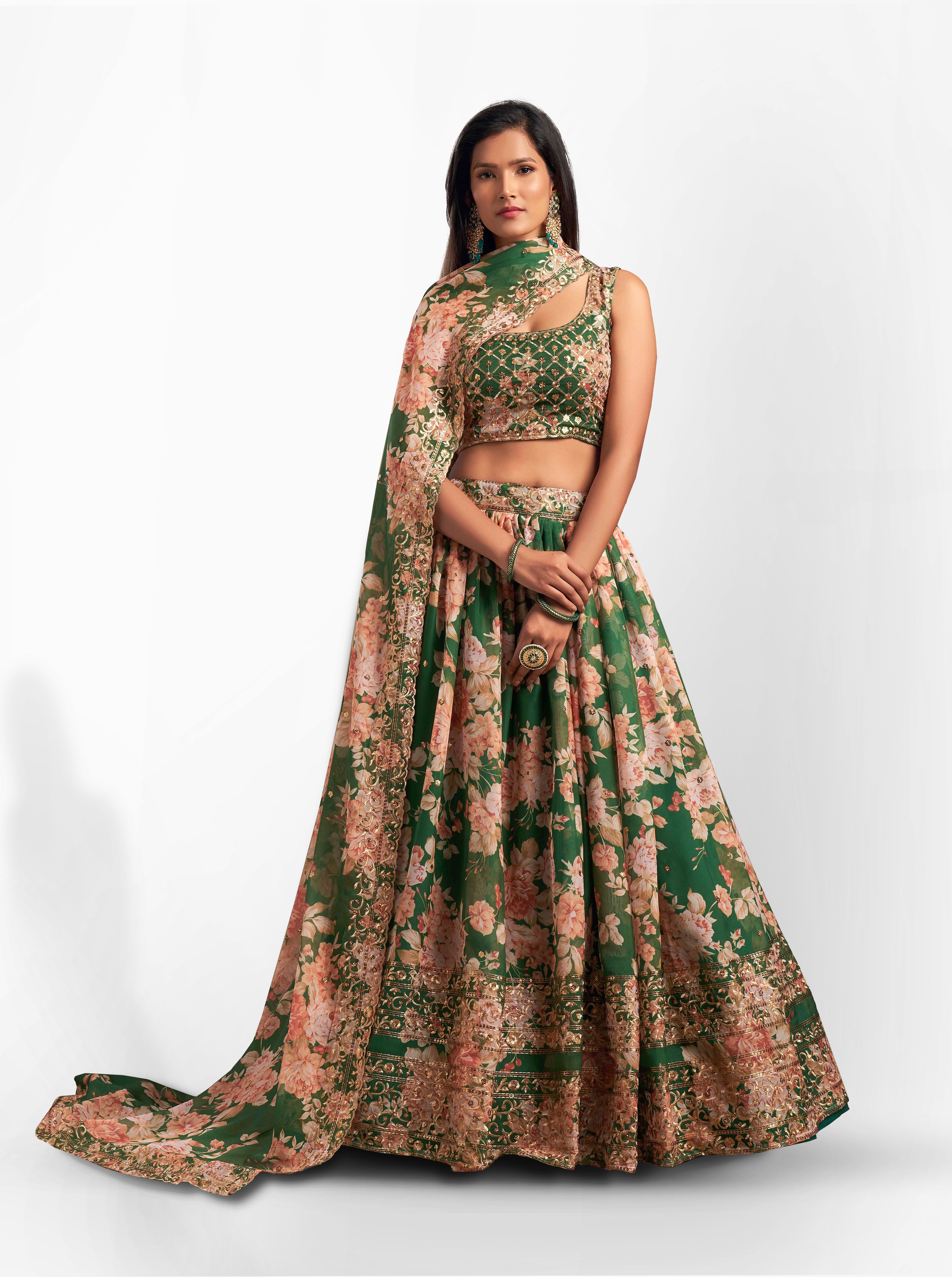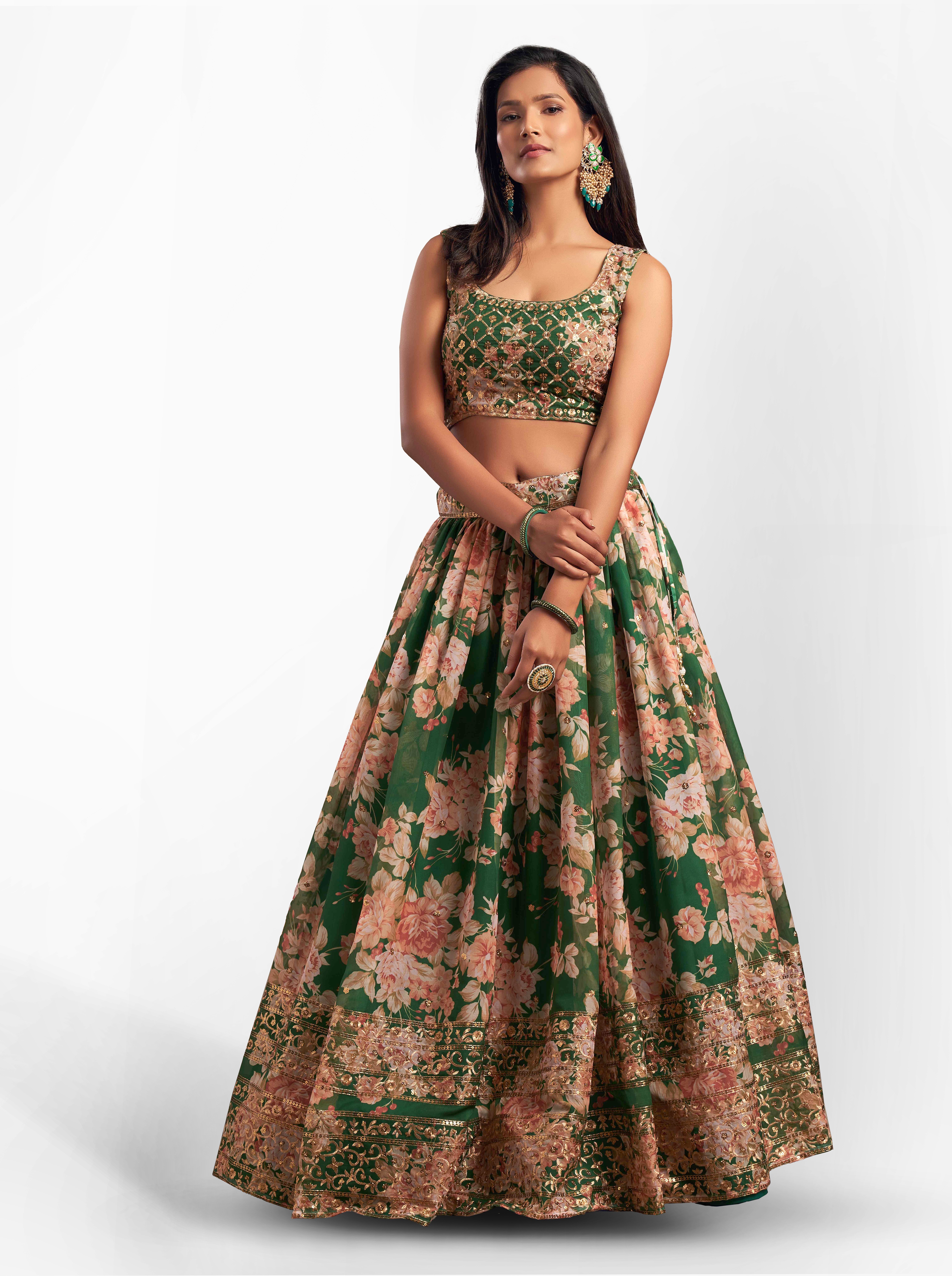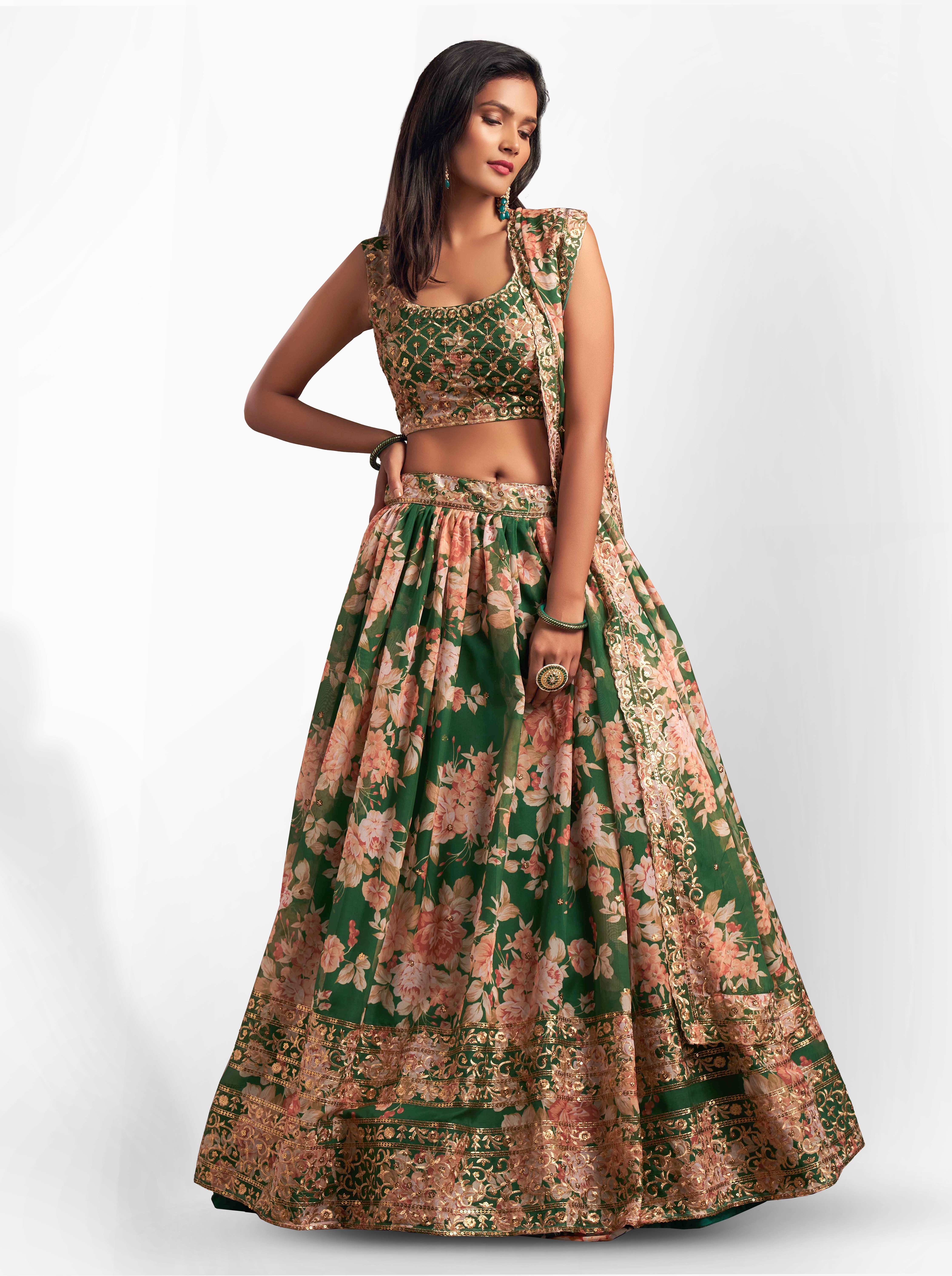 Womens Green Organza Sequence Work,Floral Work Embroidery Lehenga Set