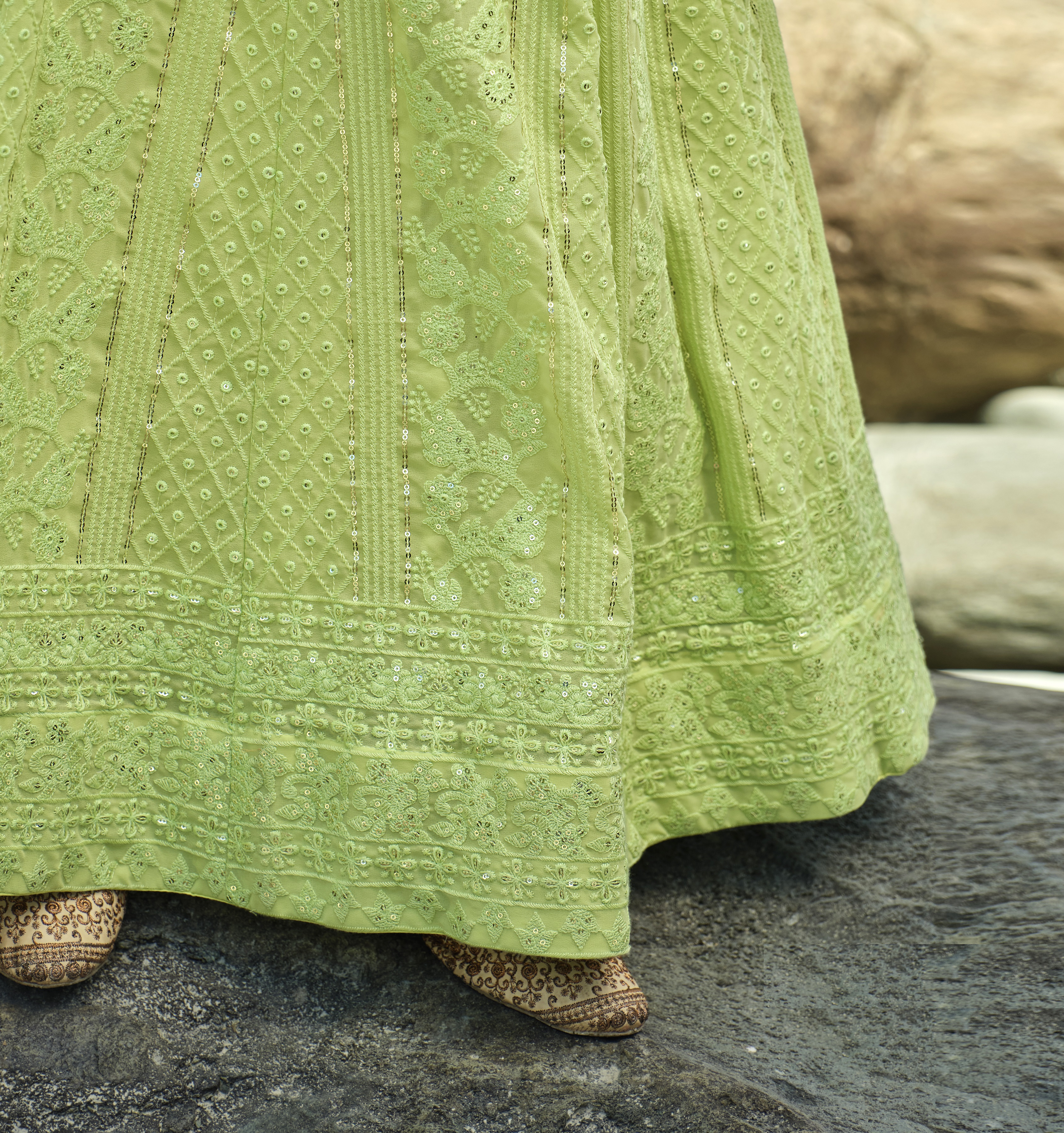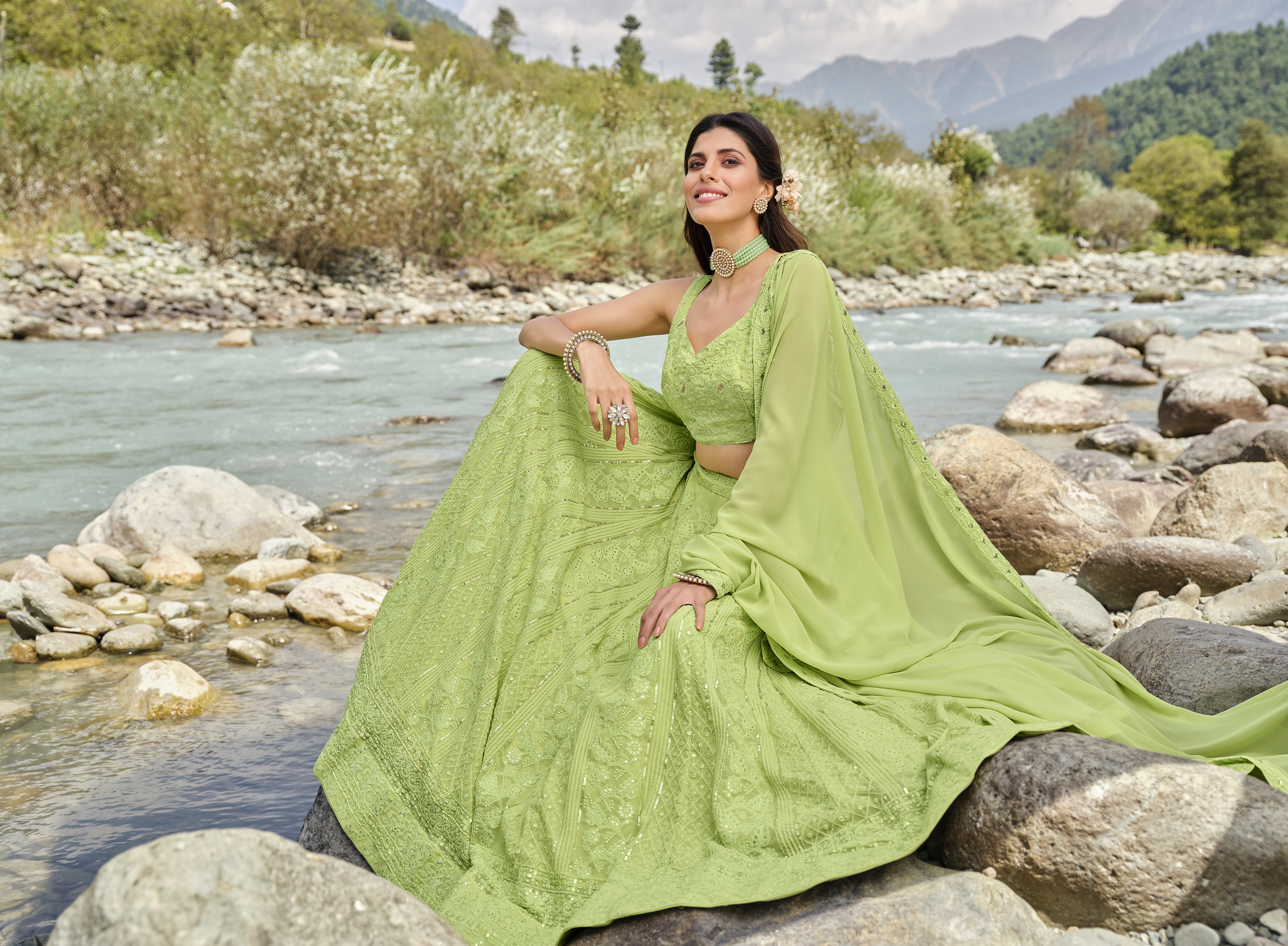 Elevate your ethnic look with this light green faux georgette lehenga featuring thread embroidery work. Designed for festive occasions and celebrations, it offers a graceful flow and timeless appeal.Crafted from lightweight faux georgette fabric with a semi-stitched finish, this lehenga ensures comfort and easy customization. Dry clean recommended.