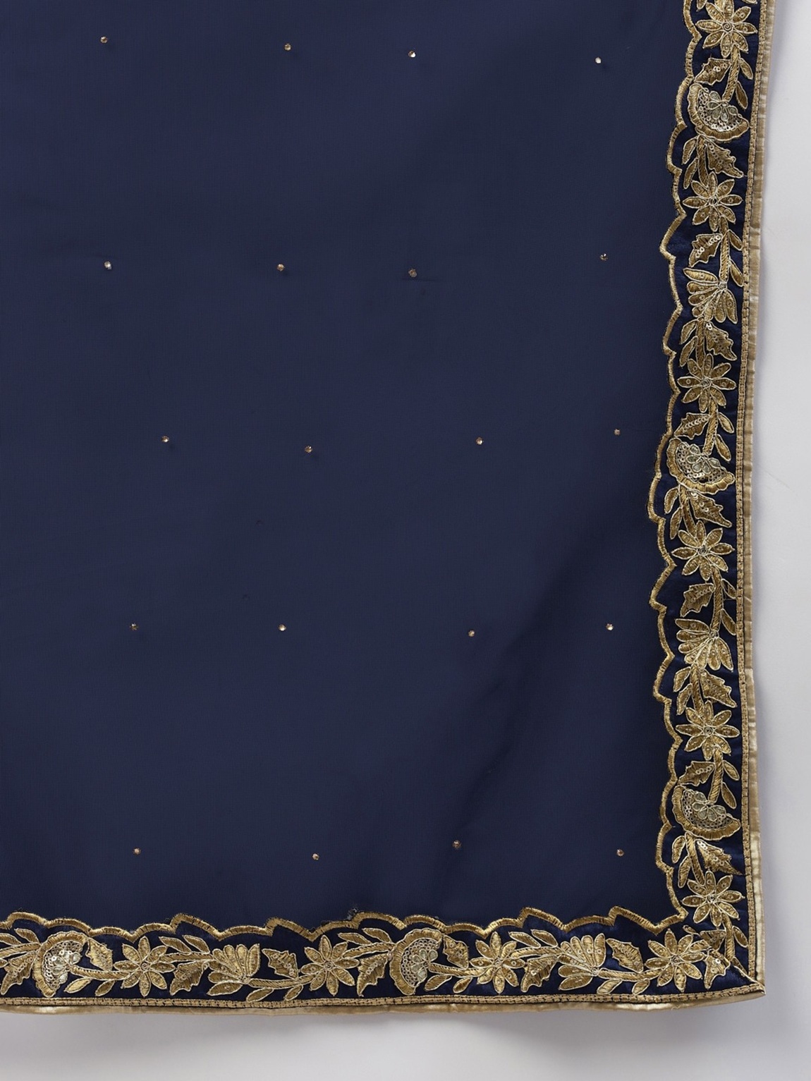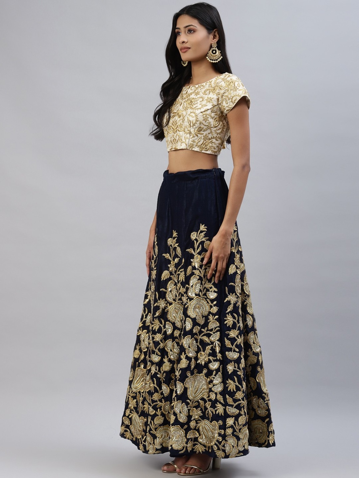Elevate your ethnic look with this navy blue velvet lehenga featuring embroidered work. Designed for festive occasions and celebrations, it offers a graceful flow and timeless appeal.Crafted from lightweight velvet fabric with a semi-stitched finish, this lehenga ensures comfort and easy customization. Dry clean recommended.