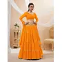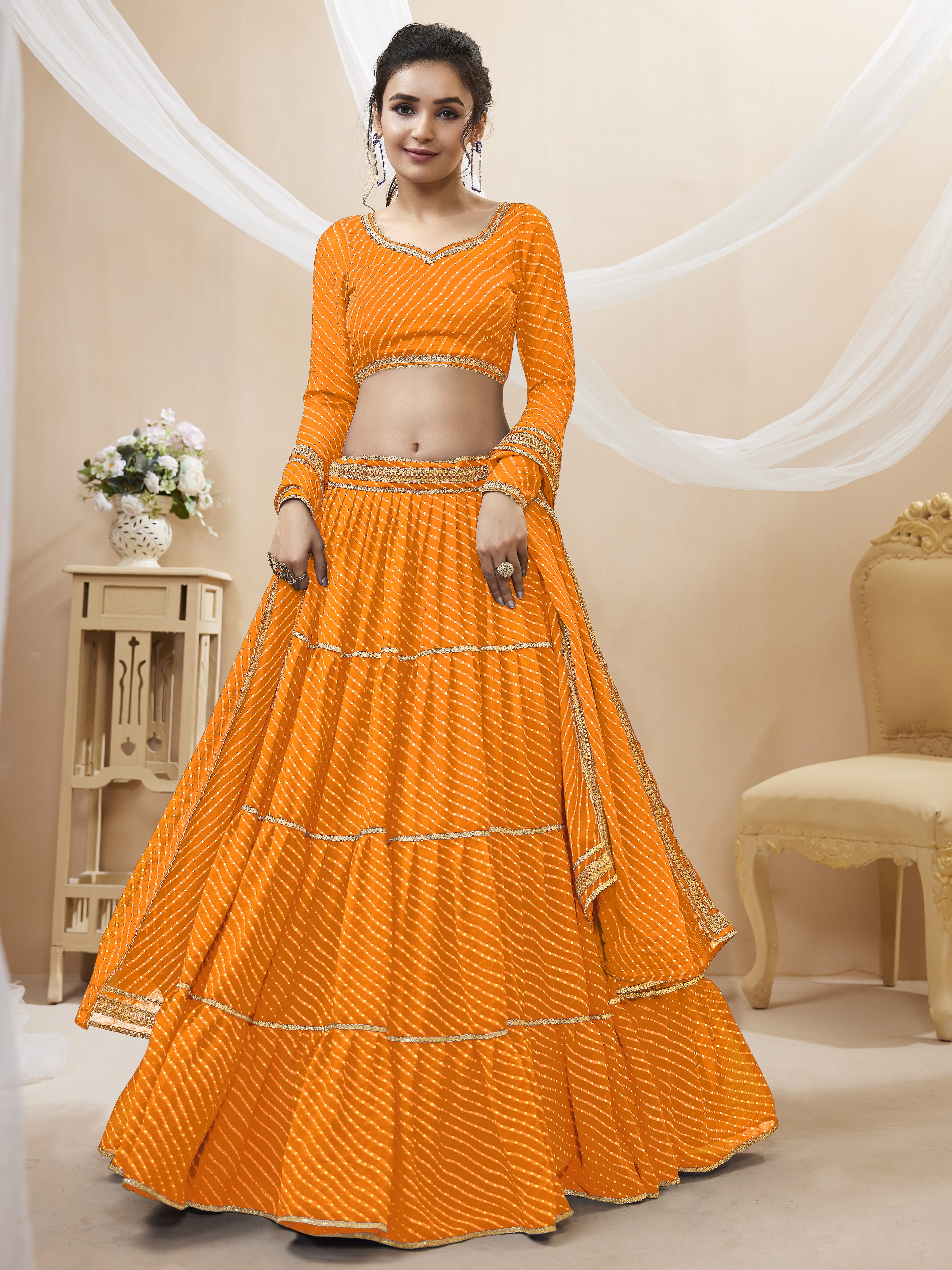 Elevate your ethnic look with this orange georgette lehenga featuring lehariya work. Designed for festive occasions and celebrations, it offers a graceful flow and timeless appeal.Crafted from lightweight georgette fabric with a semi-stitched finish, this lehenga ensures comfort and easy customization. Dry clean recommended.