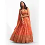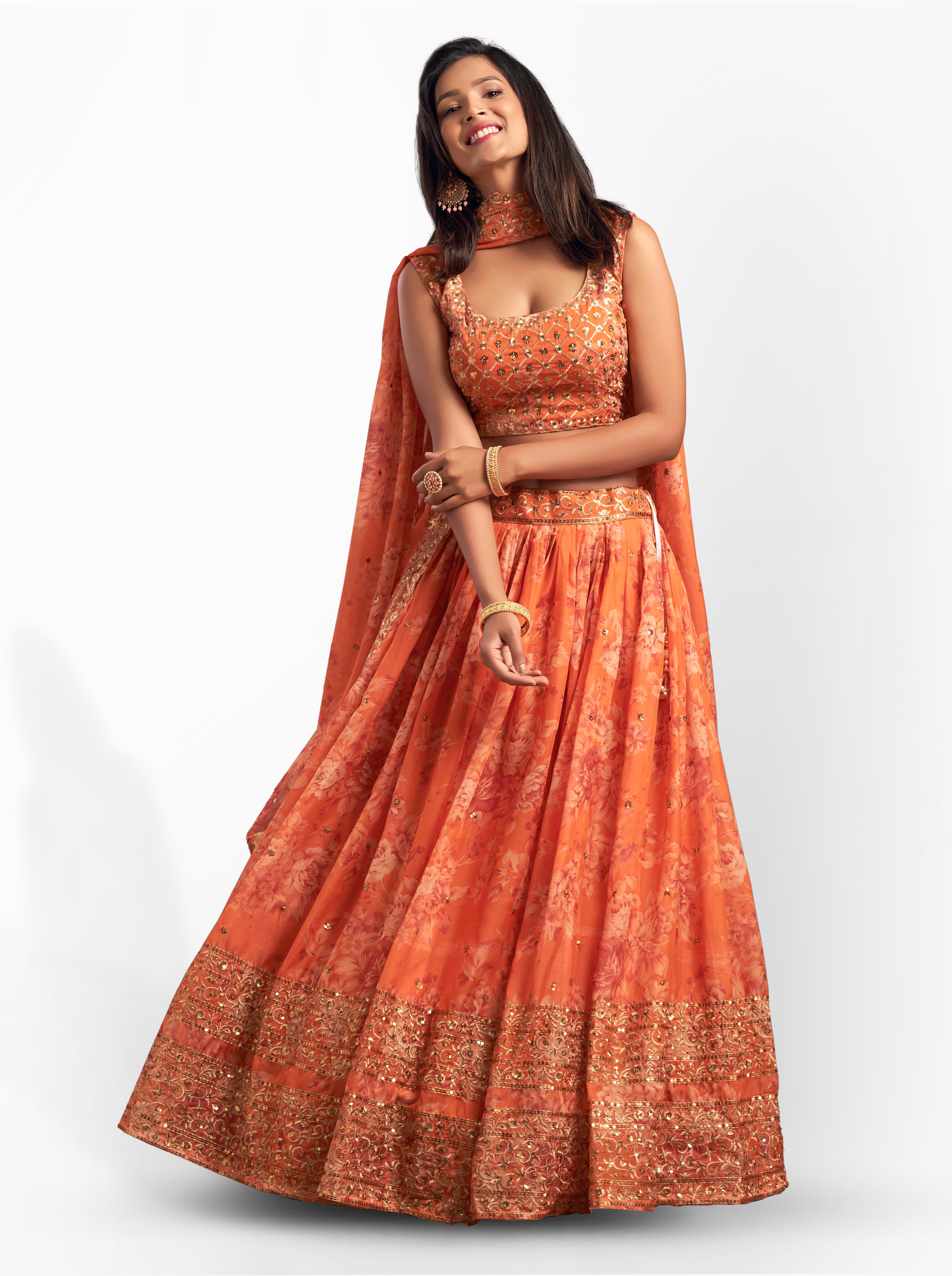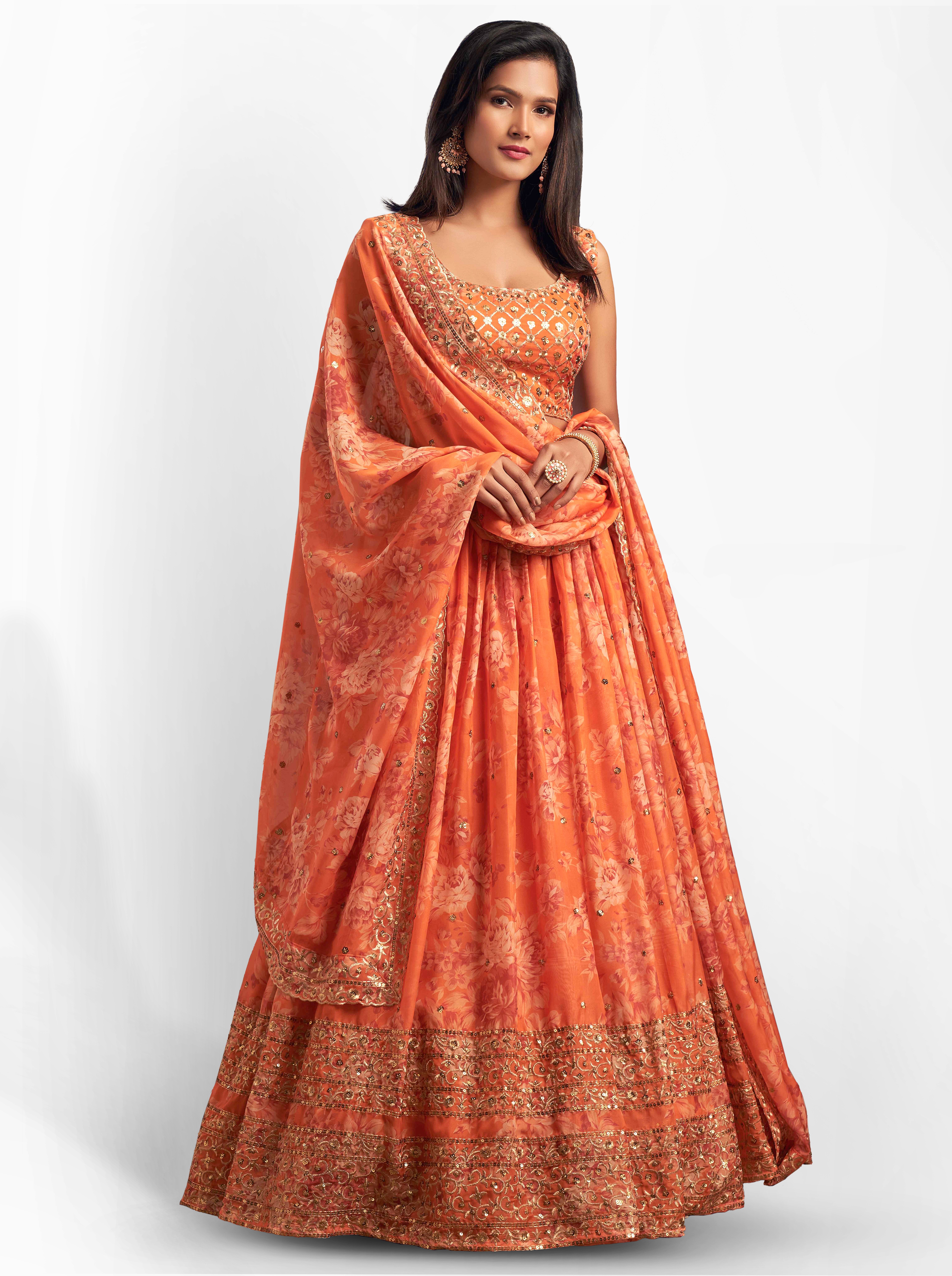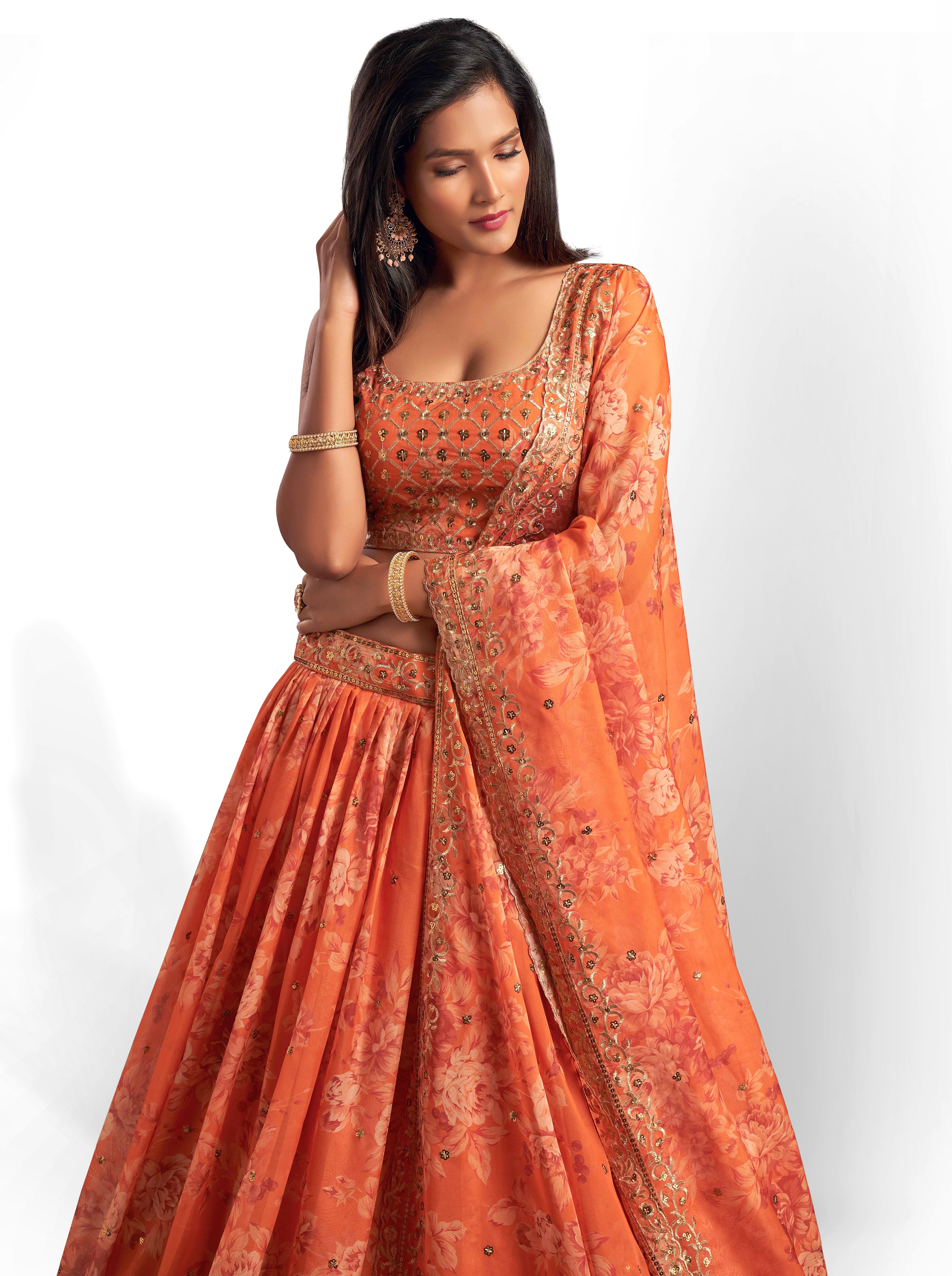 Elevate your ethnic look with this orange organza lehenga featuring sequence work,floral work embroidery work. Designed for festive occasions and celebrations, it offers a graceful flow and timeless appeal.Crafted from lightweight organza fabric with a semi-stitched finish, this lehenga ensures comfort and easy customization. Dry clean recommended.