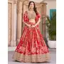 Elevate your ethnic look with this red chinnon lehenga featuring dori embroidery work. Designed for festive occasions and celebrations, it offers a graceful flow and timeless appeal.Crafted from lightweight chinnon fabric with a semi-stitched finish, this lehenga ensures comfort and easy customization. Dry clean recommended.