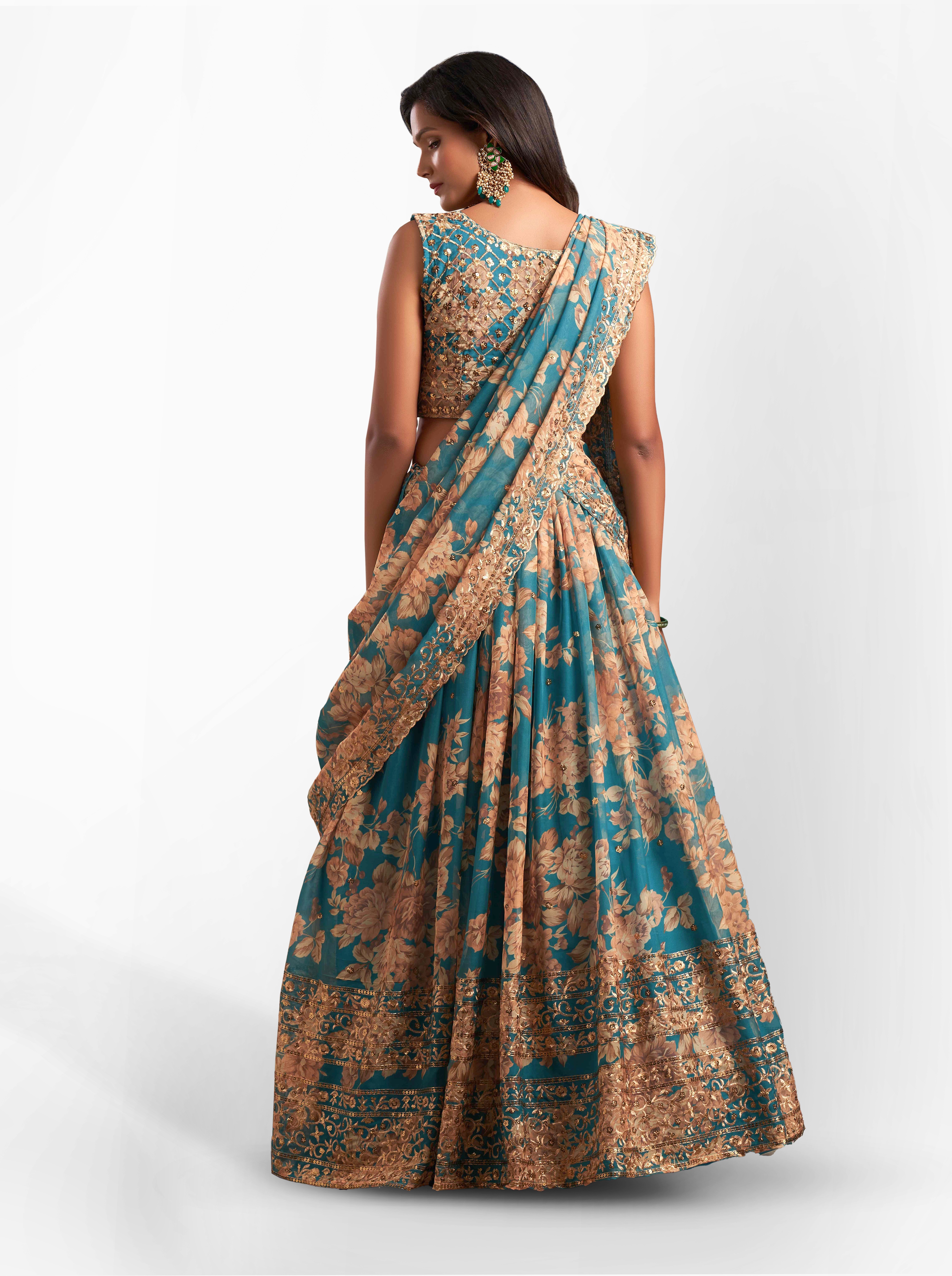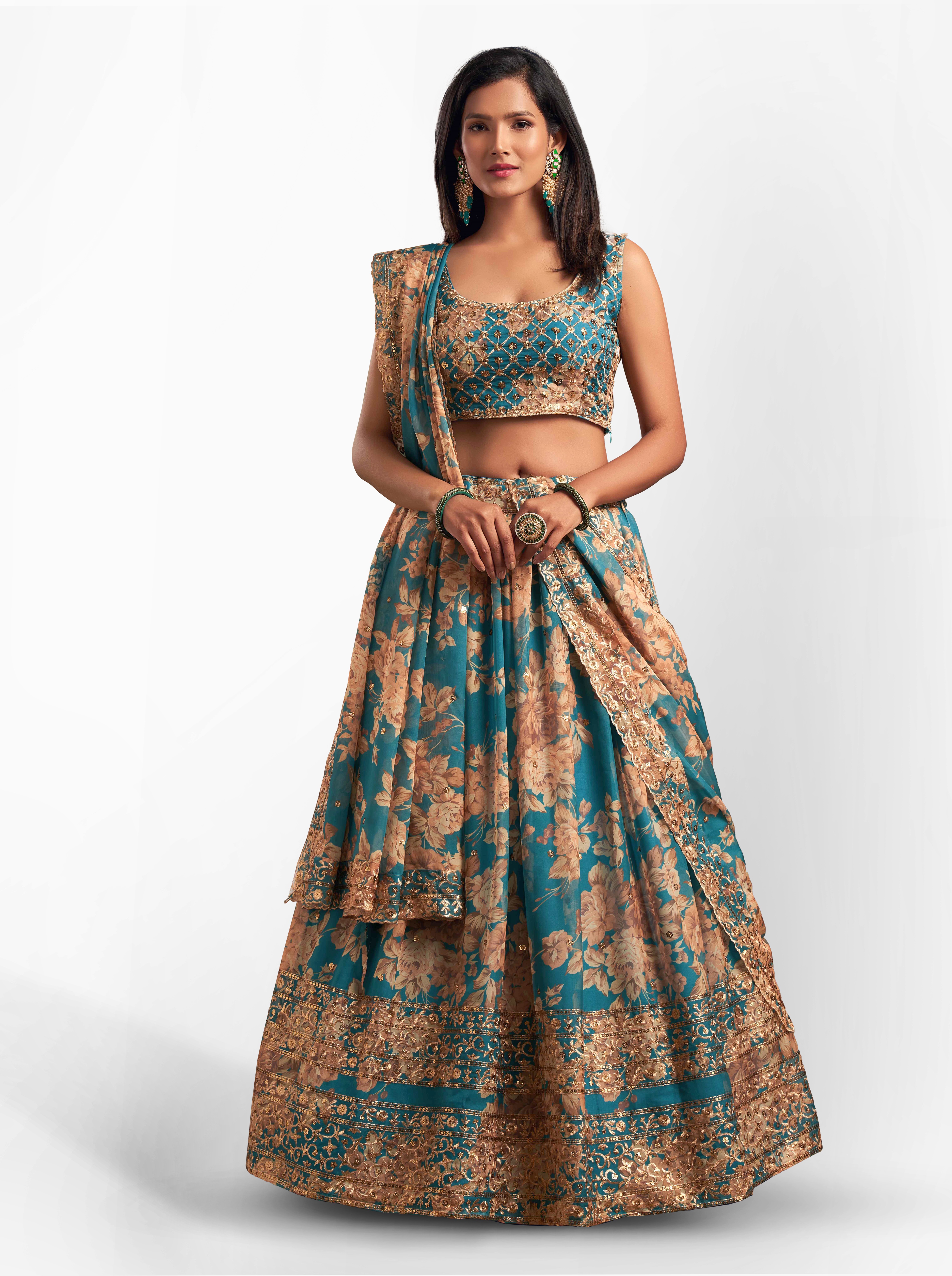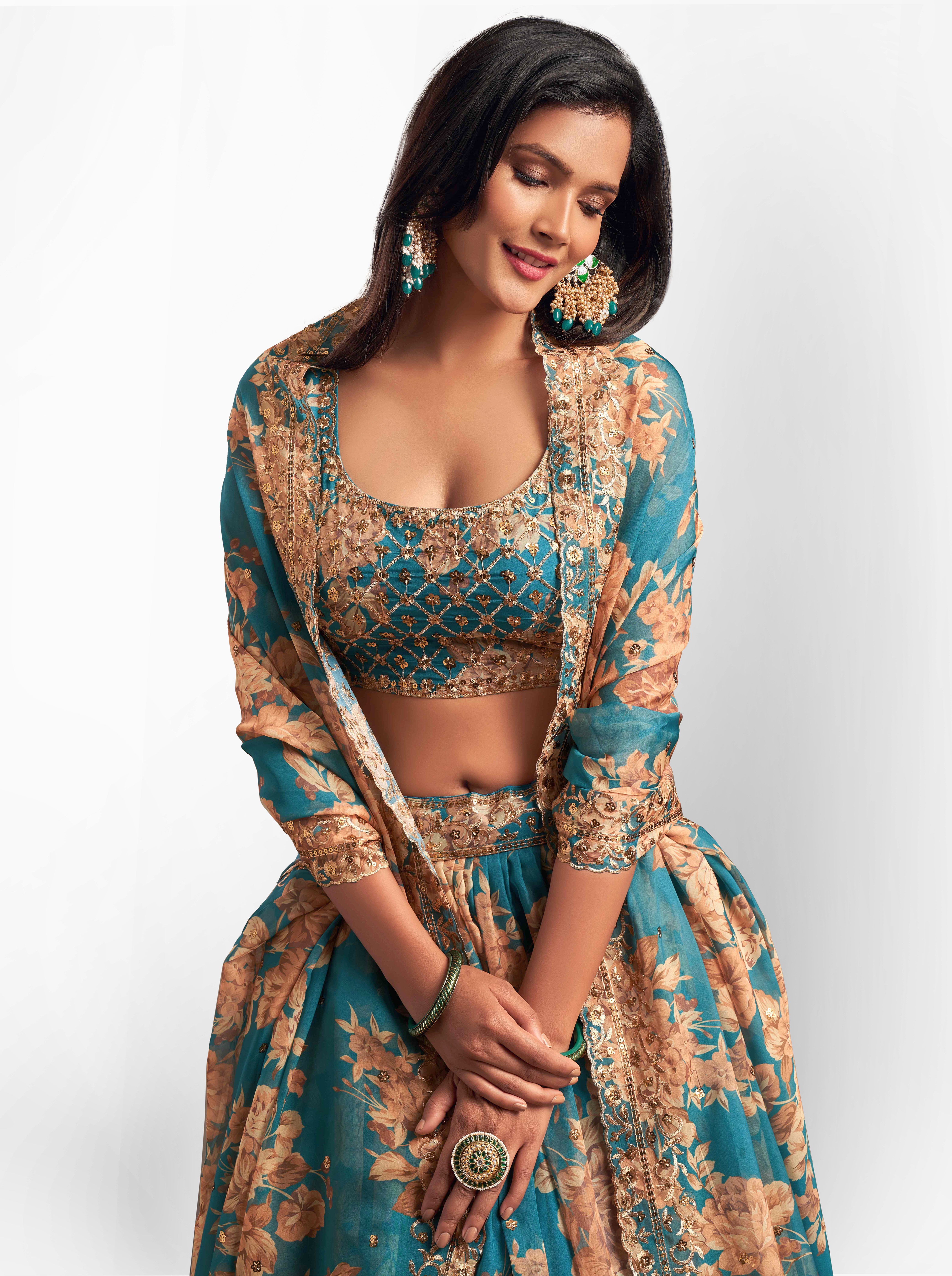 Elevate your ethnic look with this turquoise organza lehenga featuring sequence work,floral work embroidery work. Designed for festive occasions and celebrations, it offers a graceful flow and timeless appeal.Crafted from lightweight organza fabric with a semi-stitched finish, this lehenga ensures comfort and easy customization. Dry clean recommended.