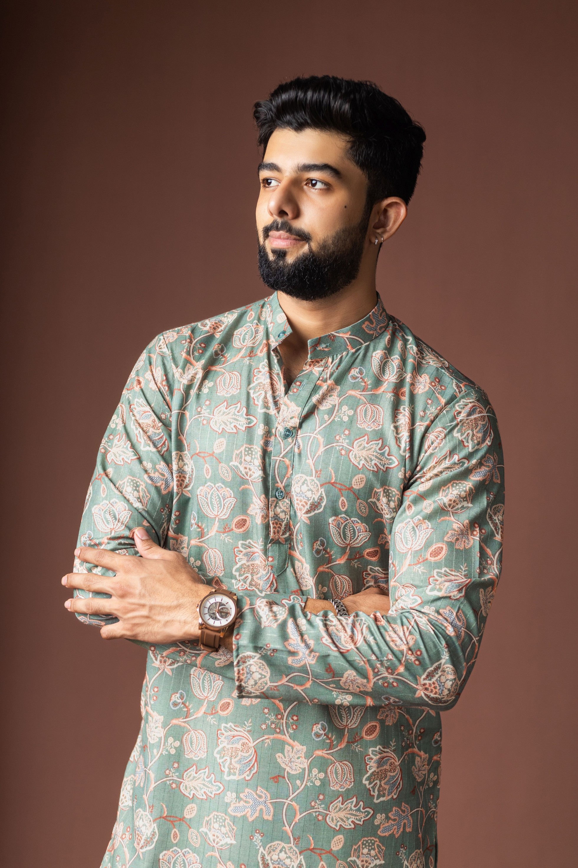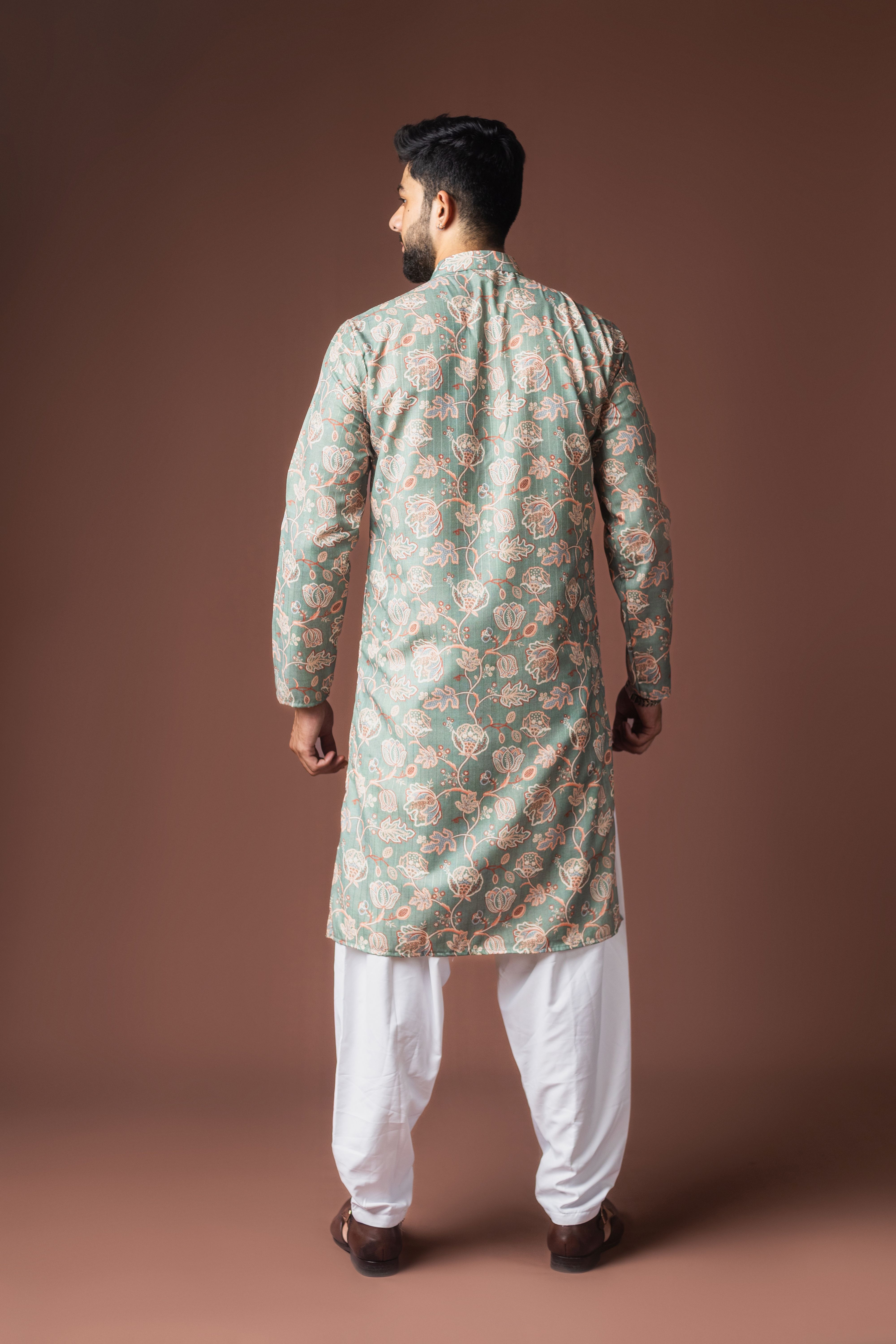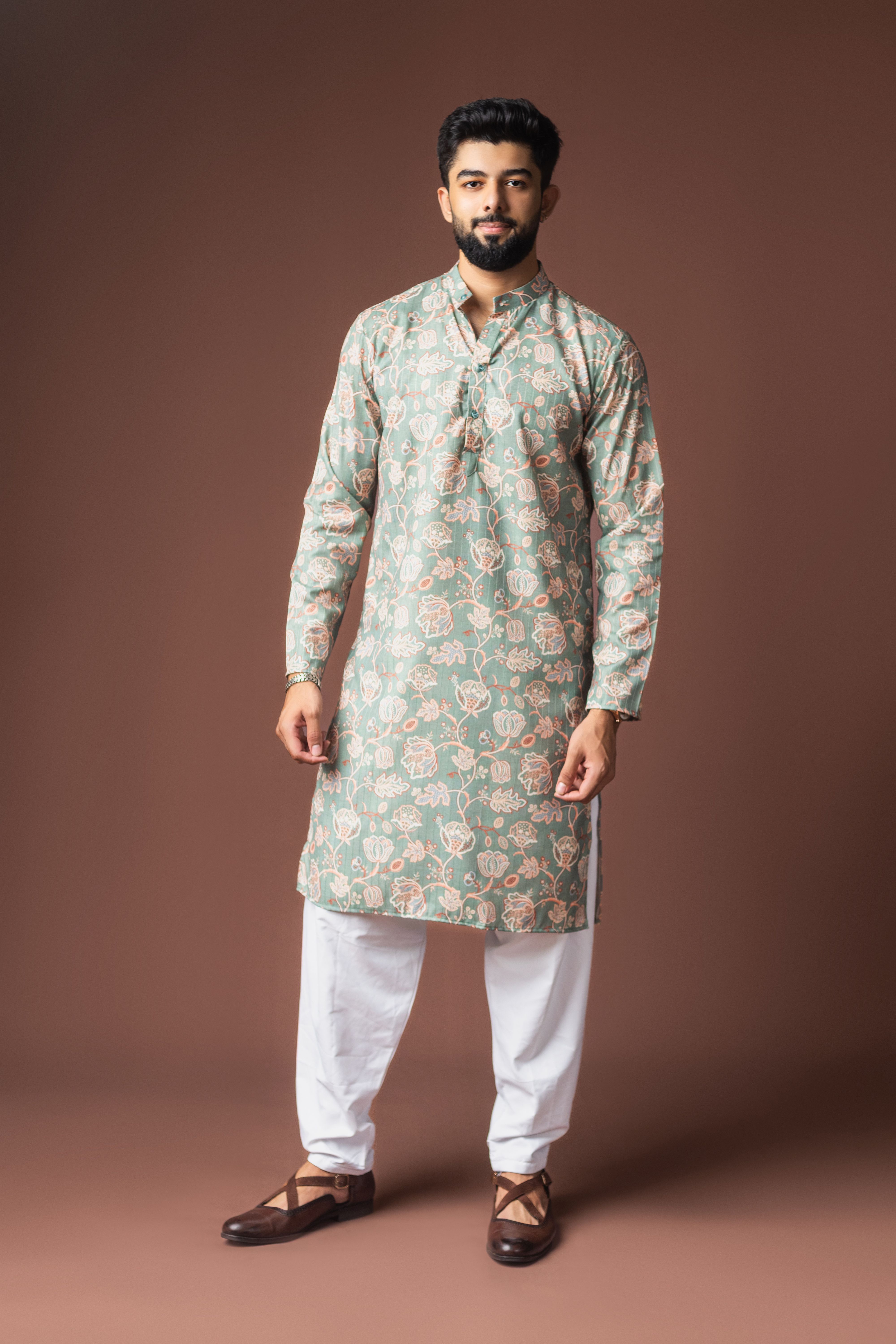 Greenish Blue Color Blended Linen Fabric Designer Printed Festive Wear Men's Kurta Payjama