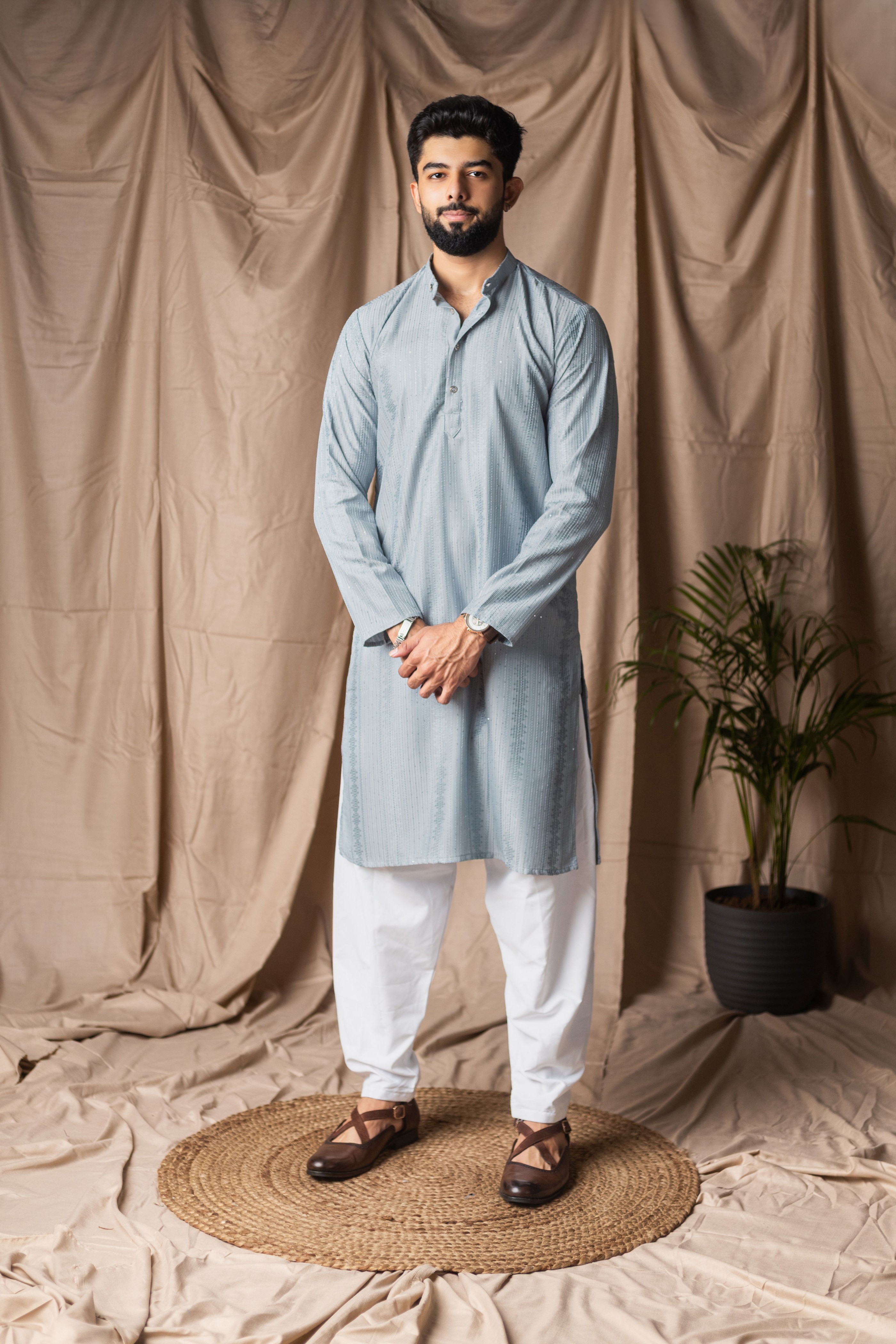 Light Blue Color Beautiful Thread Embroidery Work Rayon Fabric Ceremonial Men's Kurta Payjama
