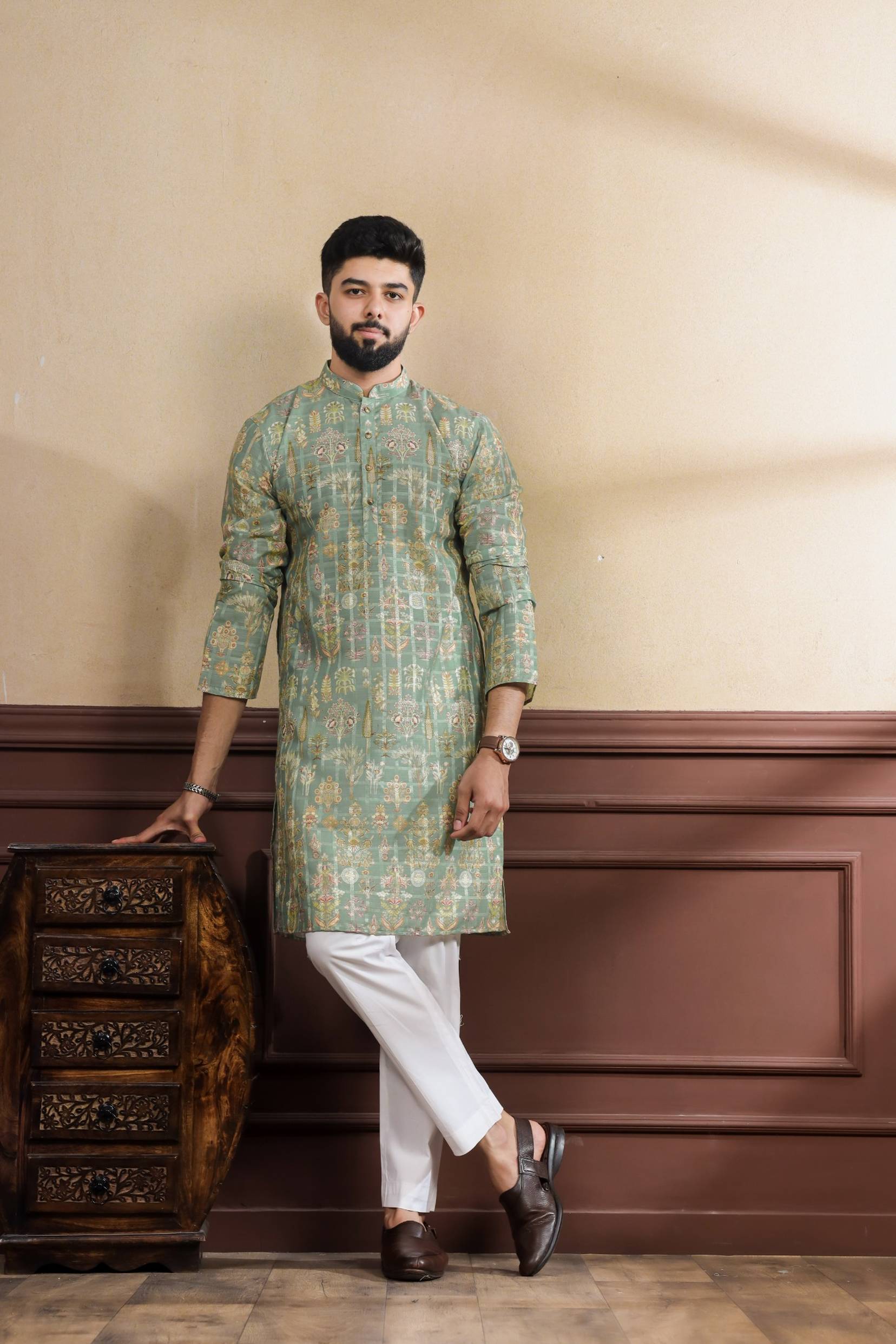 Pista Color Ethnic Woven Patta With Digital Printed Ceremonial Kurta Payjama For Men's