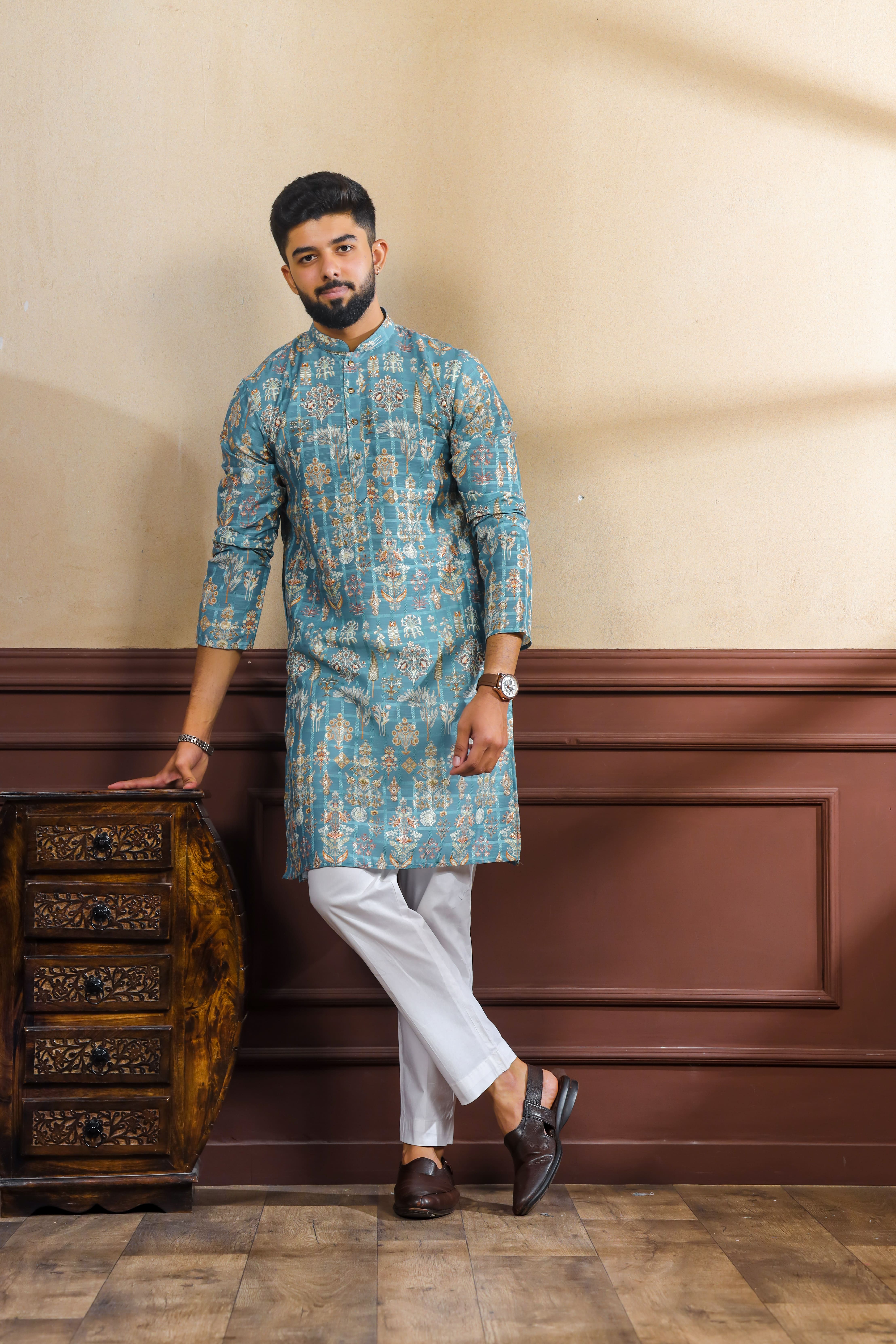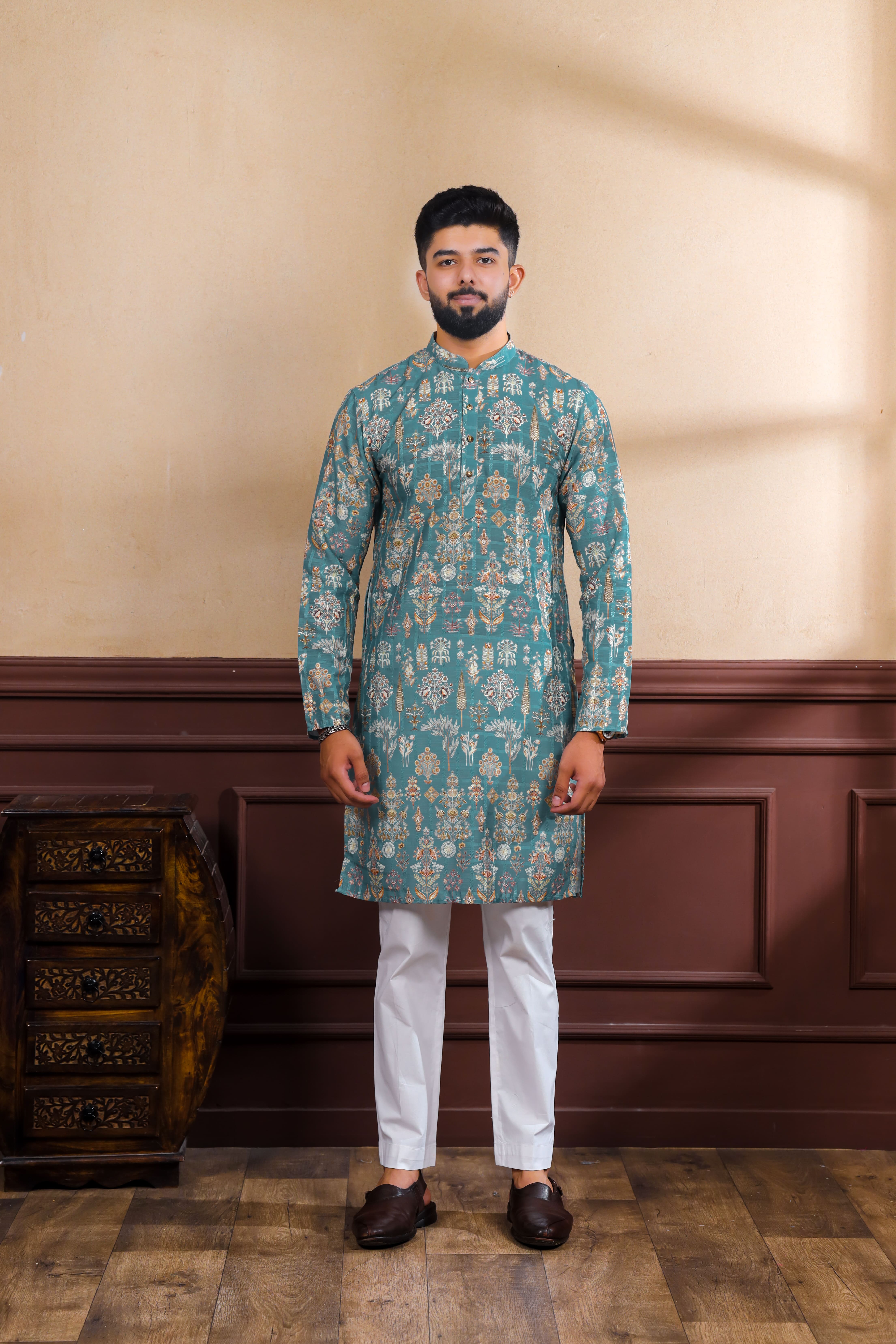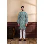 Teal Color Ethnic Woven Patta With Digital Printed Ceremonial Kurta Payjama For Men's