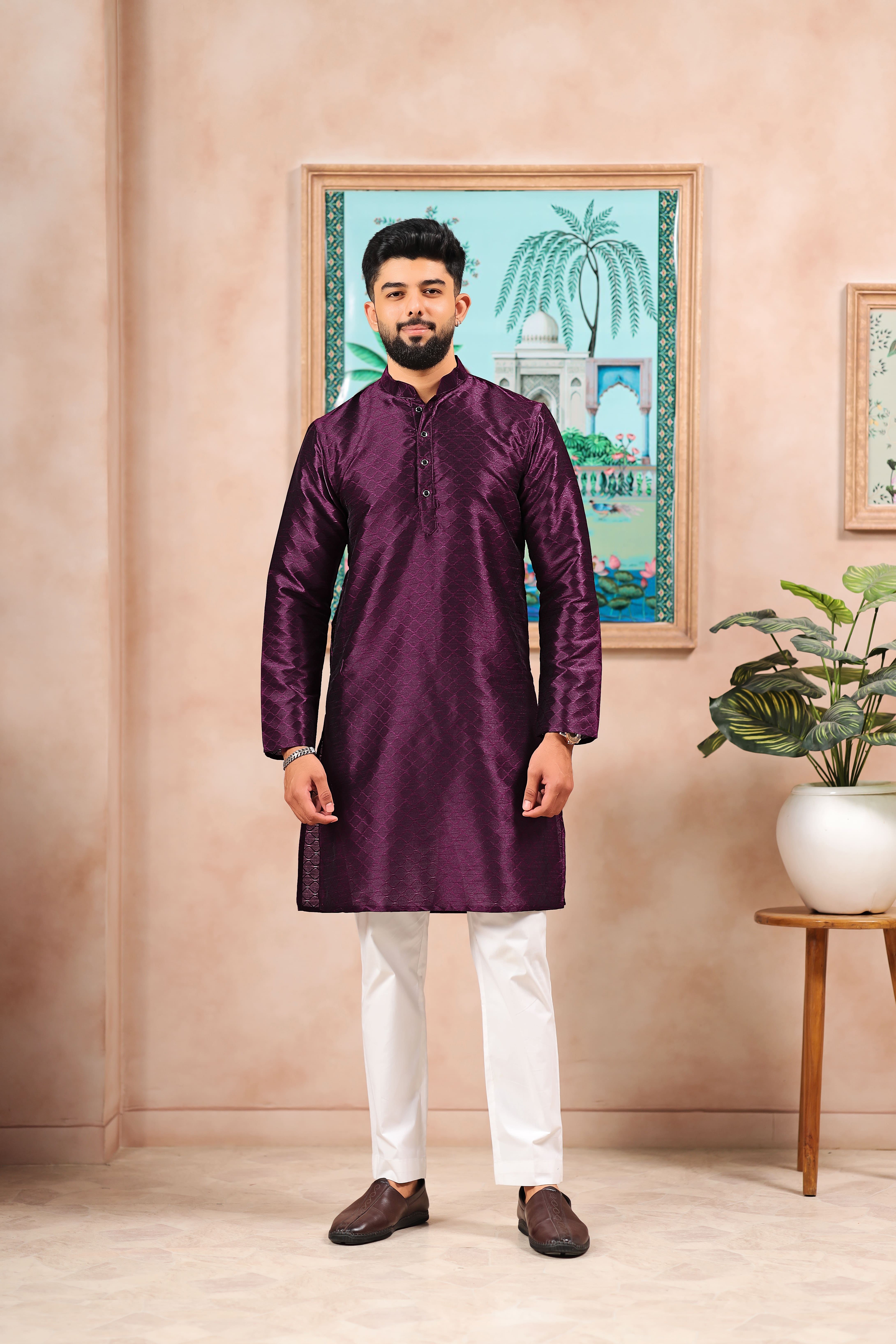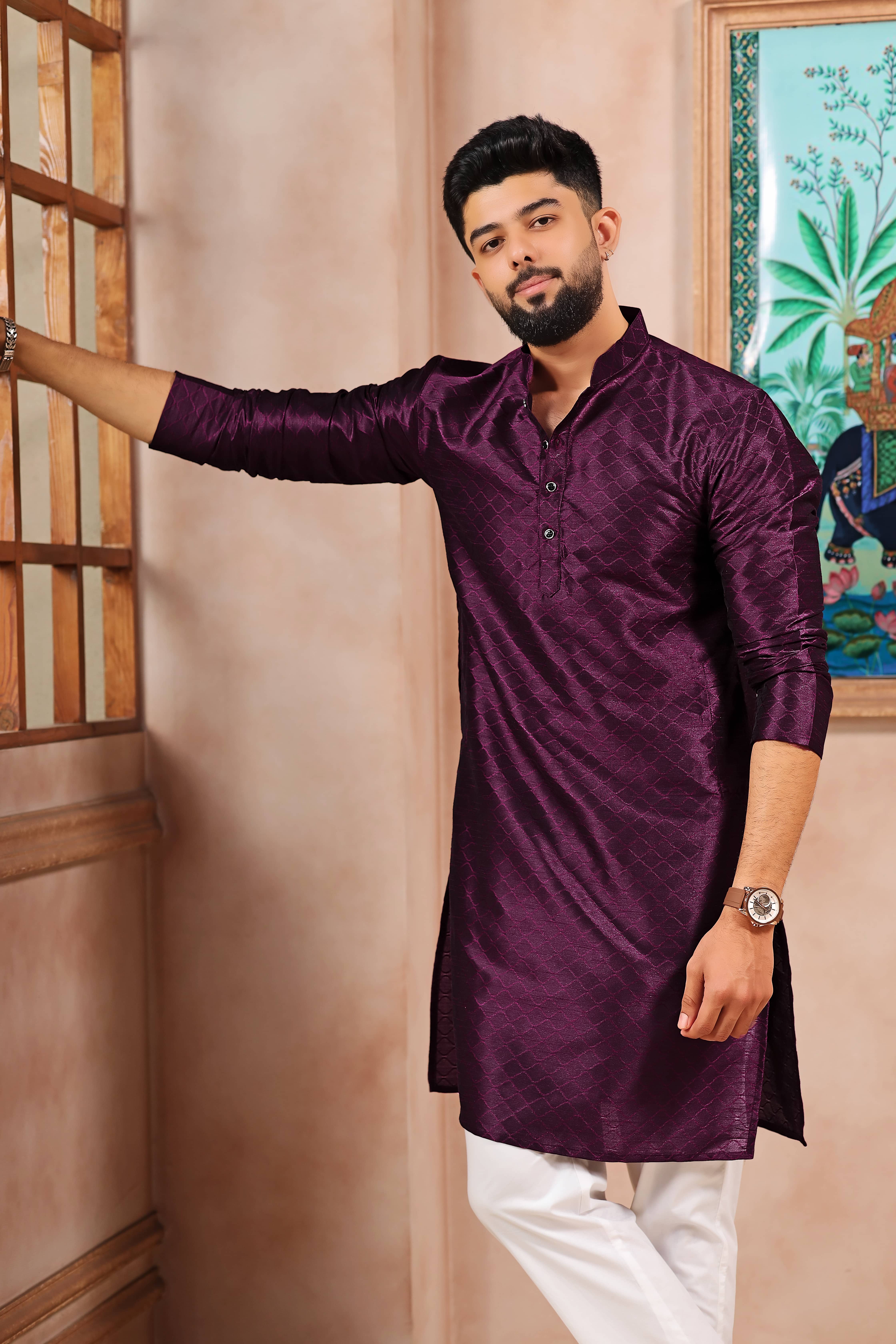 Wine Color Graceful Partywear Kurta Payjama For Mens Ceremonial Looks