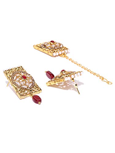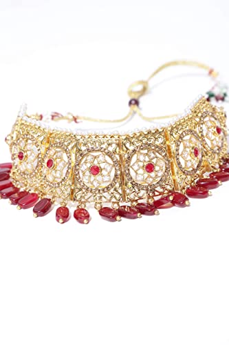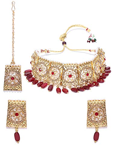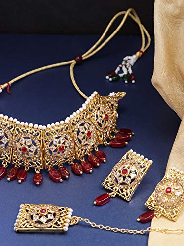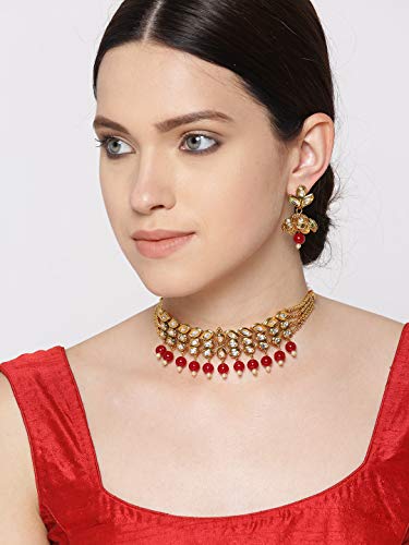 Priyaasi Red & Gold-Toned Kundan-Studded Choker Jewellery Set for Women and Girls