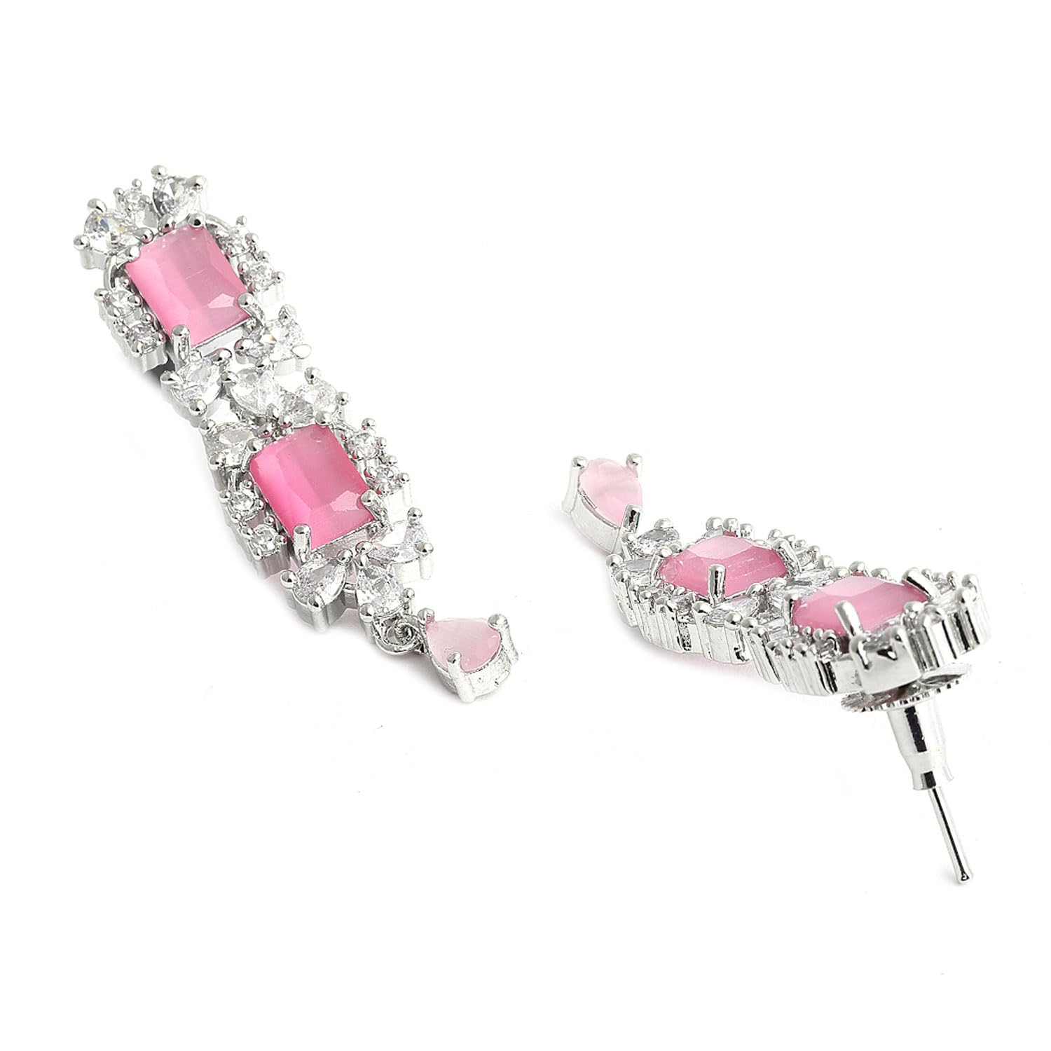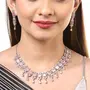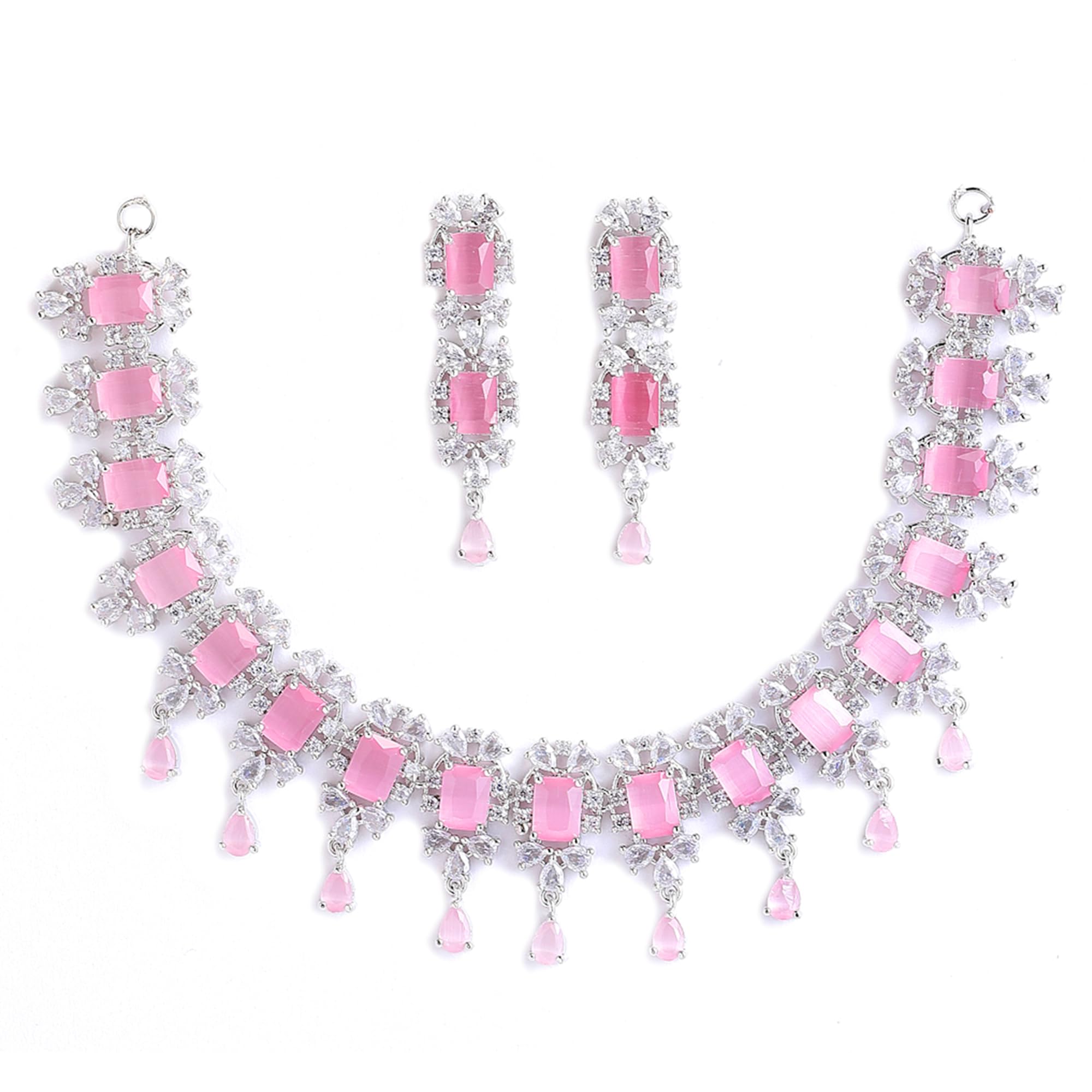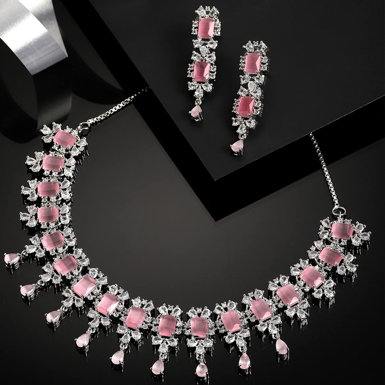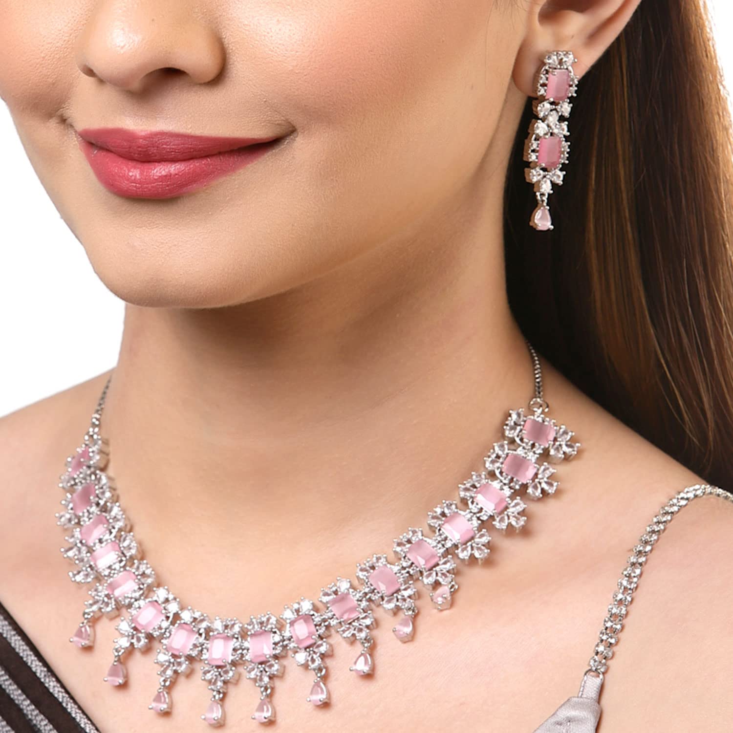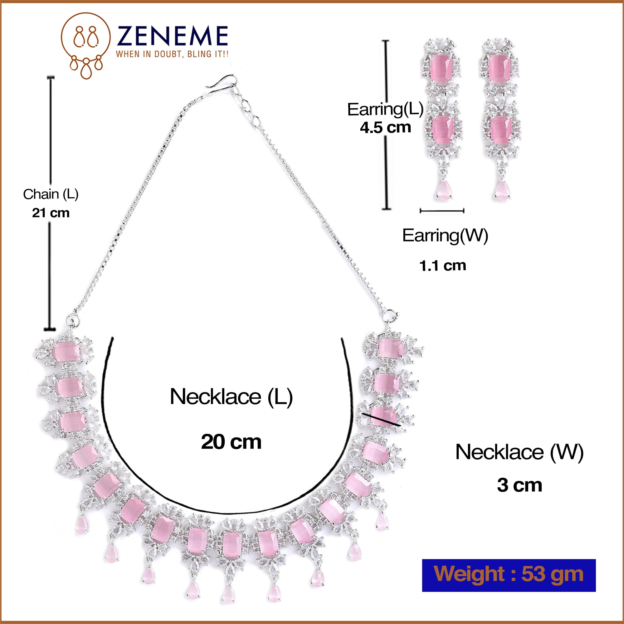 HomeFashionNecklaceZENEME Rhodium Plated Square Shaped Silver Toned American Diamond Stone Studded Necklace With Earring Jewellery Set For Women and Girl