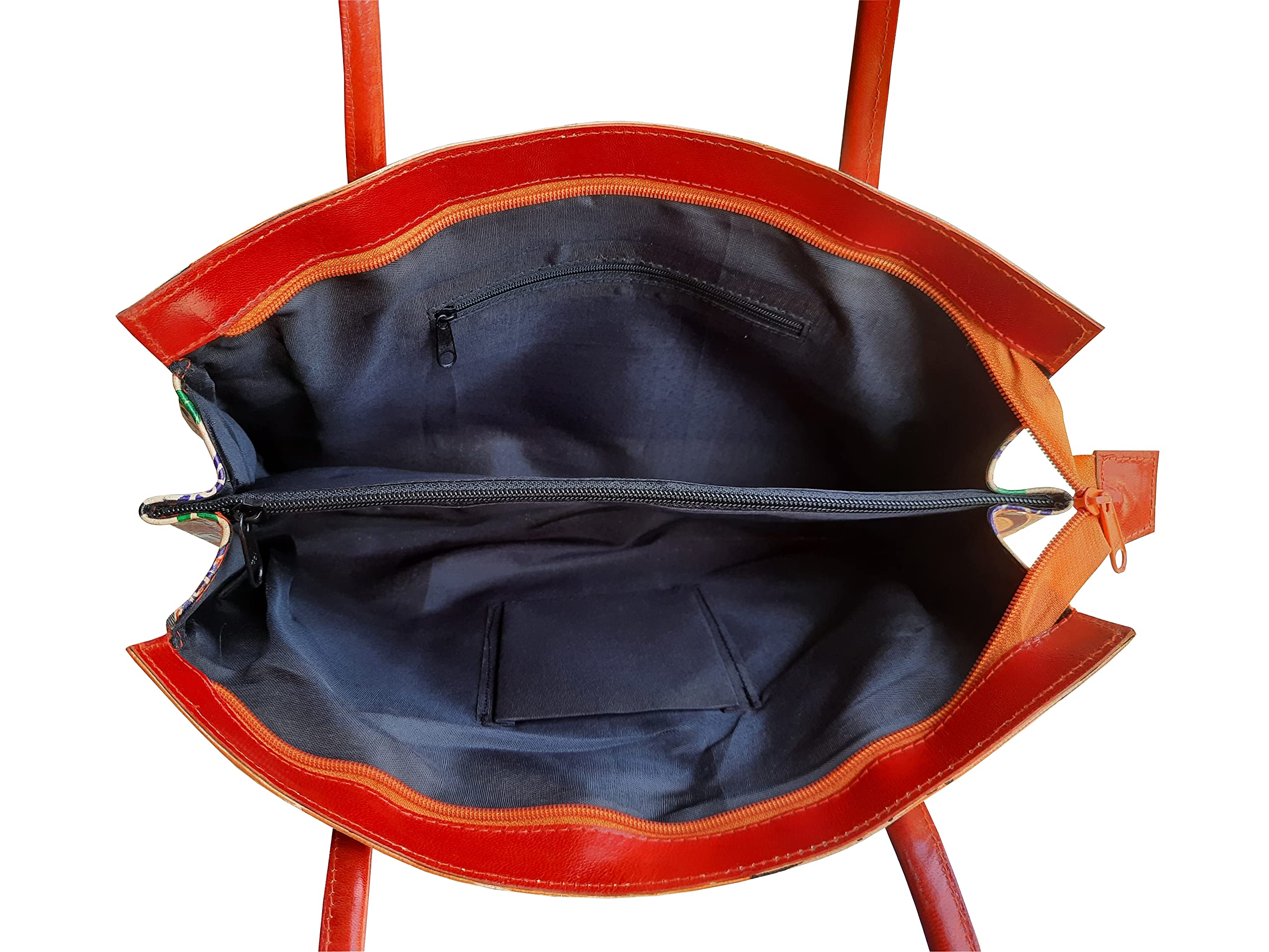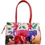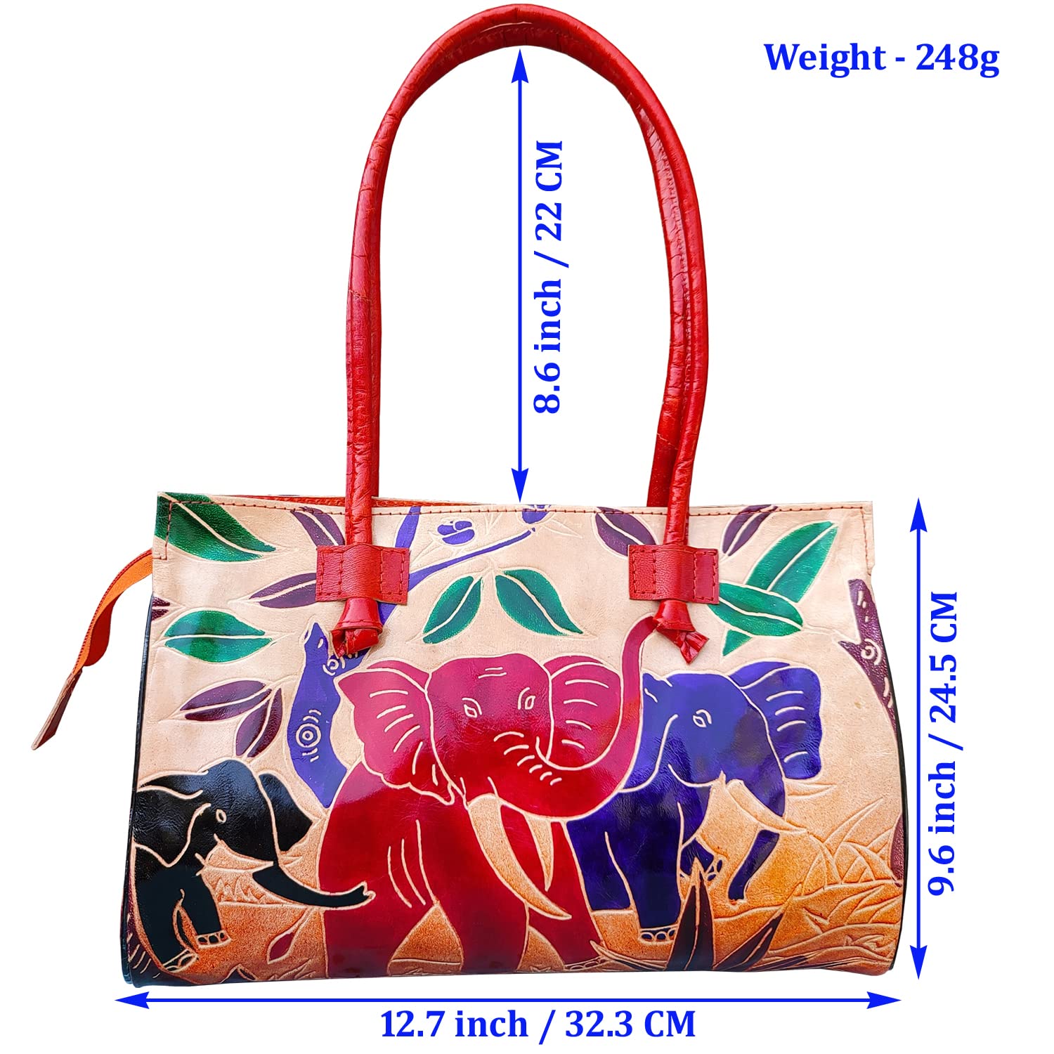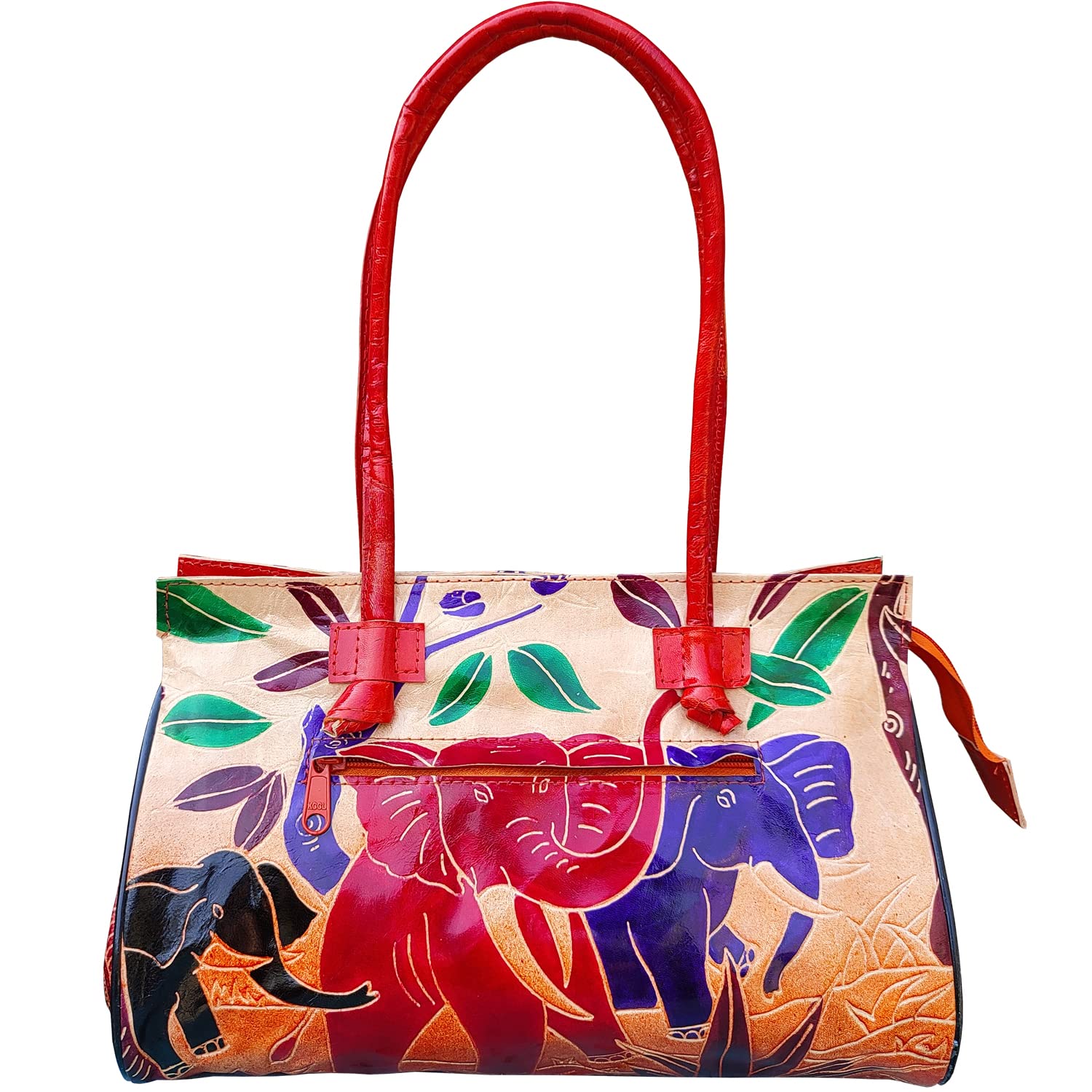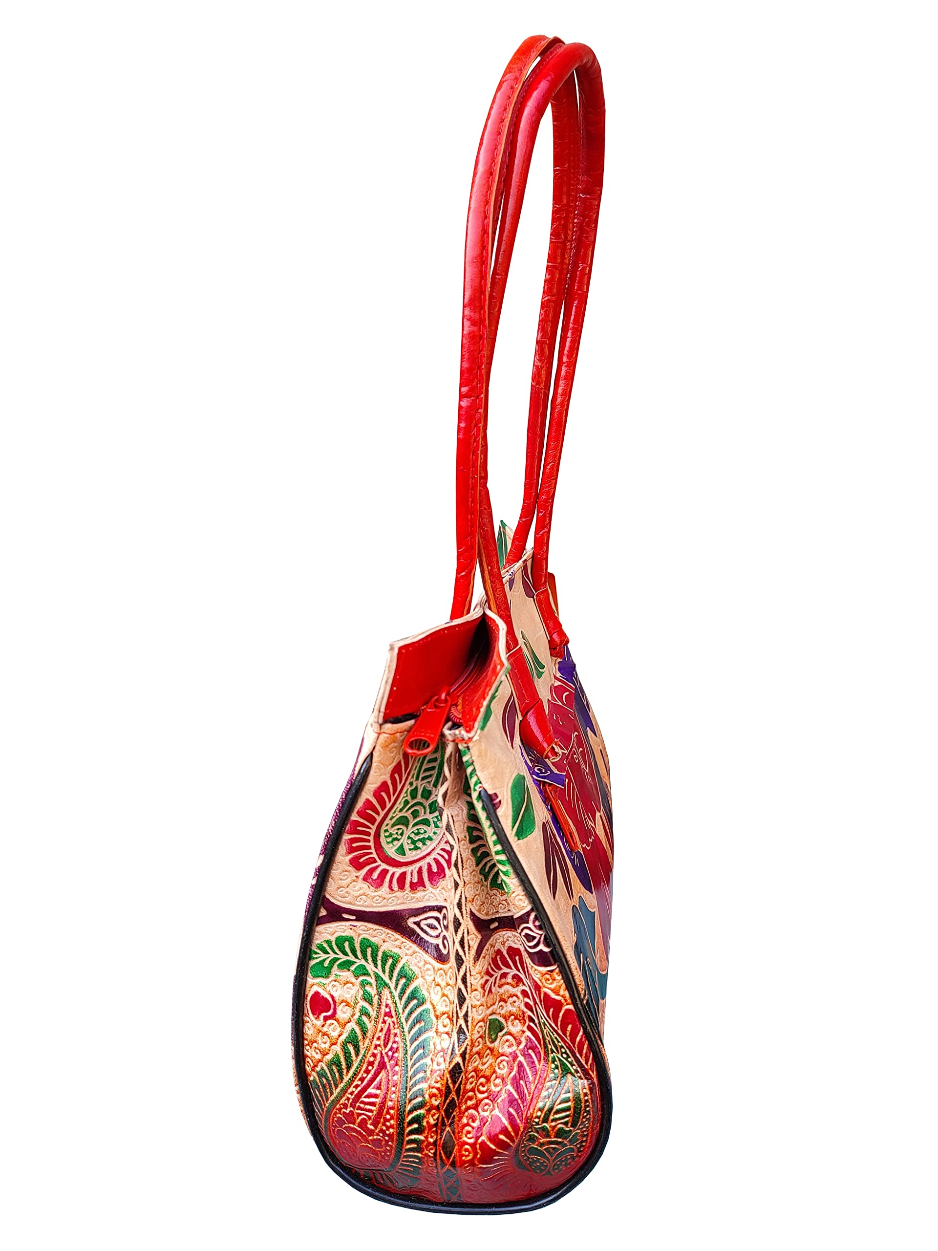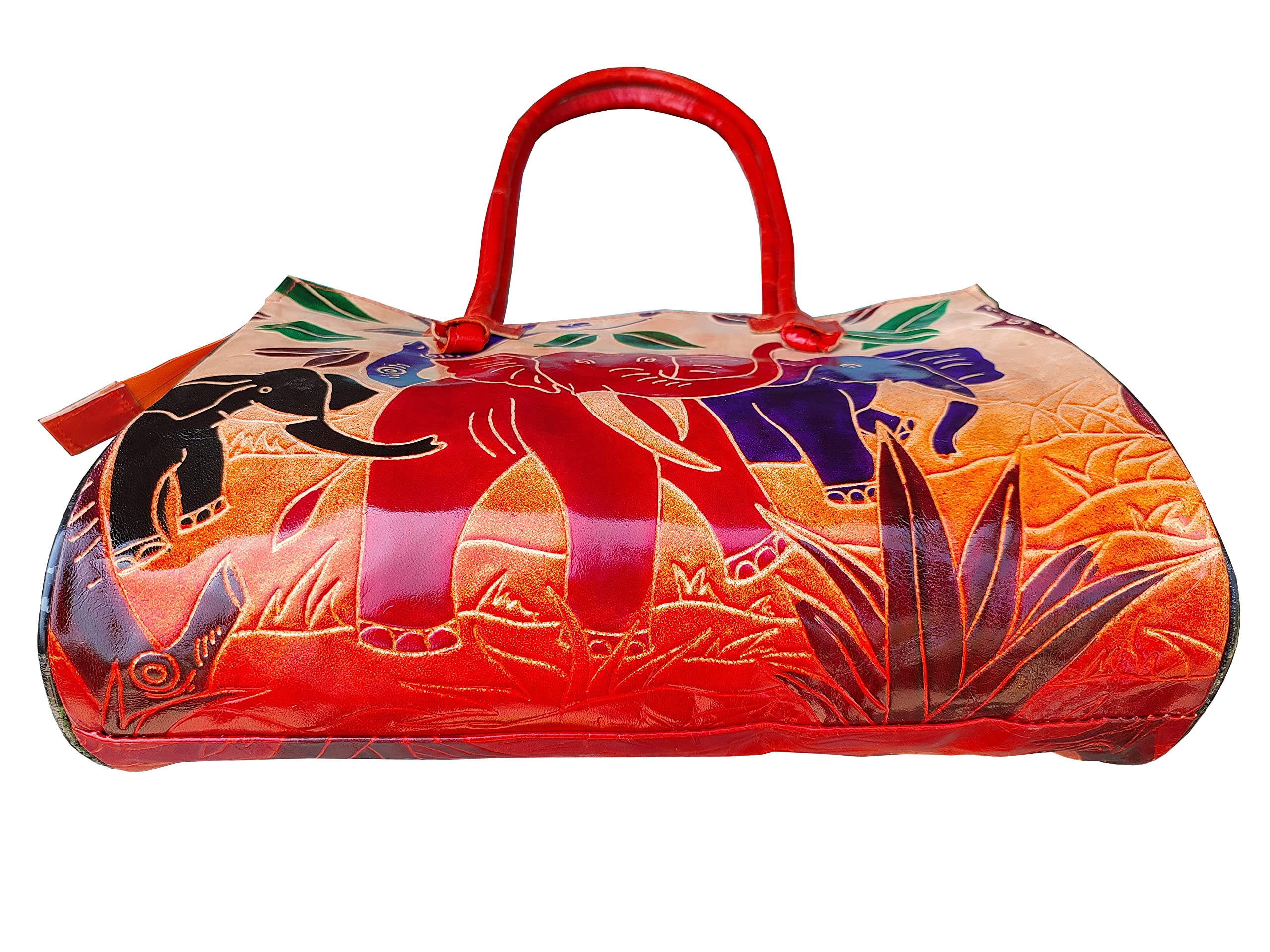Handcrafted from Genuine Leather a Beautiful Ethnic Art of West Bengal. Design on Both Sides Double Shoulder Tote Handle One Main Zipper compartment One Zipper pocket in Back and Three Compartments inside Two zipper and One open cell phone compartment. Closes fully with zip. Traditional Batik print. This purse is a classic example of age old Shantiniketan craft which was introduced in West Bengal India during the 1940s. The traditional motifs used for these Shantiniketan bags depict the rich cultural heritage of India. The Shantiniketan style evolved as a result of the Art Movement and these products have now become world famous for their appliqu batik and embossed craft work. The process of burnishing the leather gives it an elegant sheen and brings out the colors. The major embossing craft is done by hand and is an intricate process. After the final leather made it is then stitched into the desired product coated with a lacquer finish for making the product shiny and long lasting. We are happy for your interest SHANTINIKETAN EMBOSSED LEATHER PRODUCTS and artist of Shantinikan thanks to you.